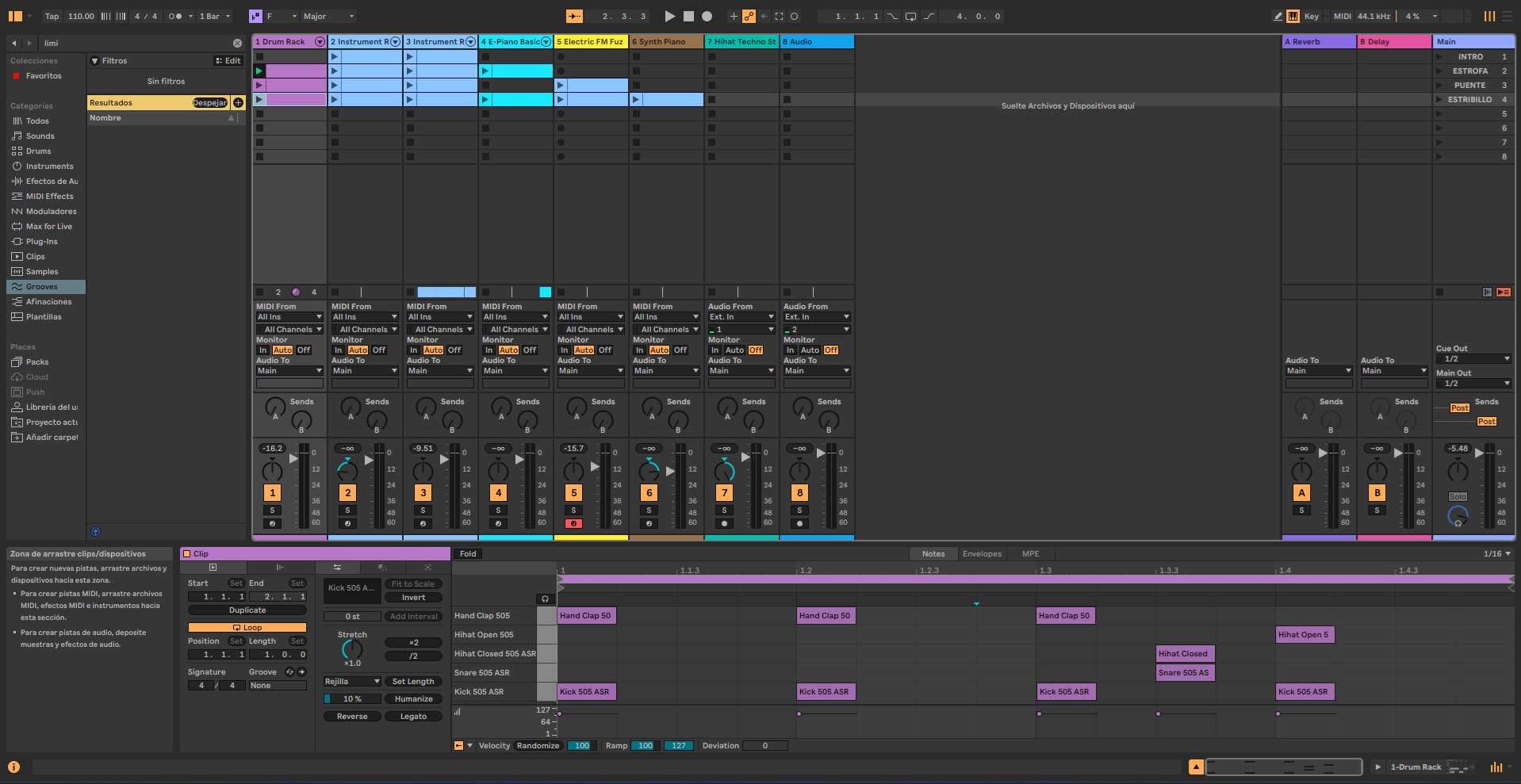 En esta primera instacia segui el patrón de 4/4, en el drum rack utilizando Kick 505 ASR, Hamd Clap 50, Hihat Closed e Hihat Open 5.