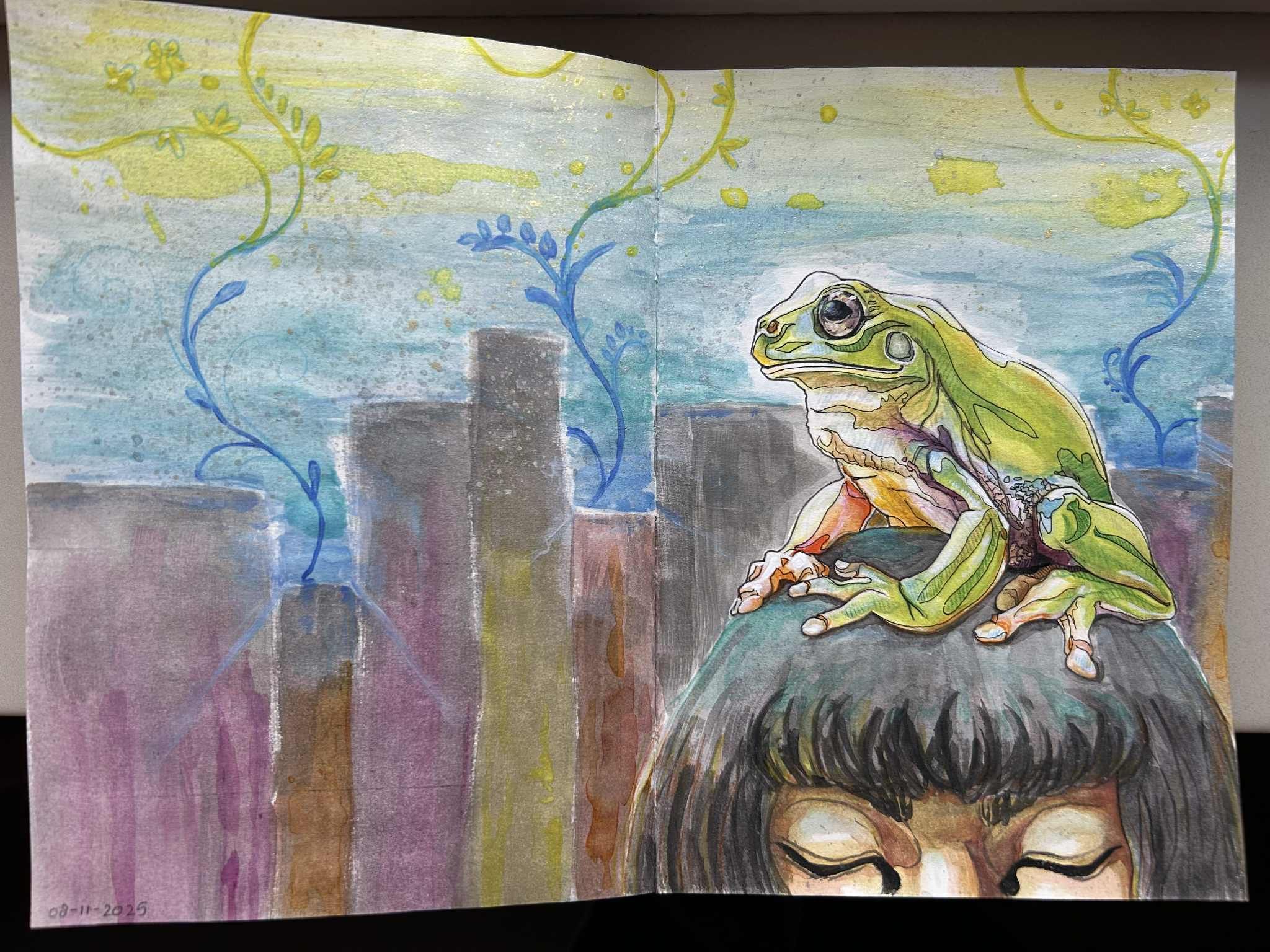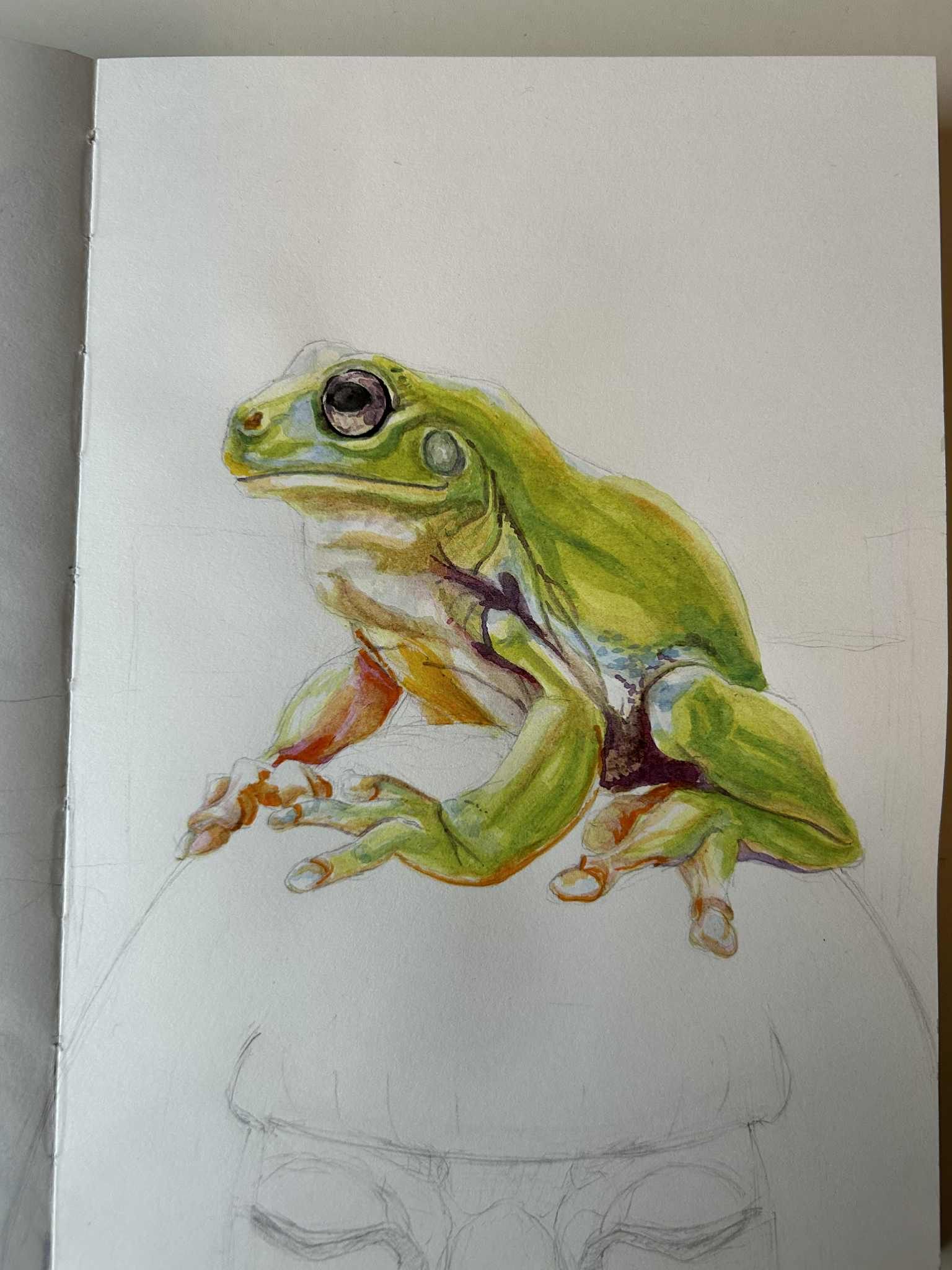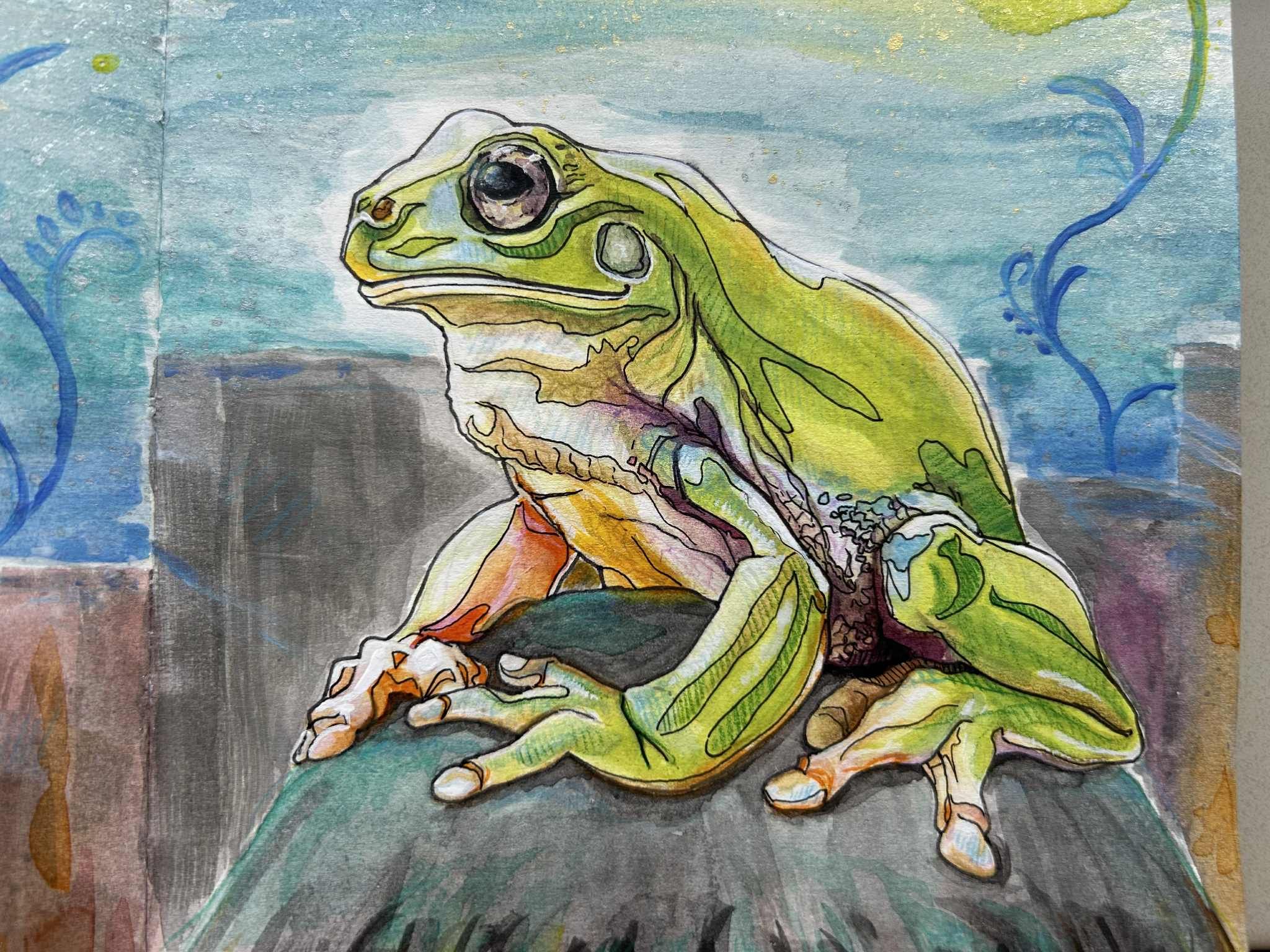 With watercolor I painted the frog and finalized it with fineliner and some colored pencils.