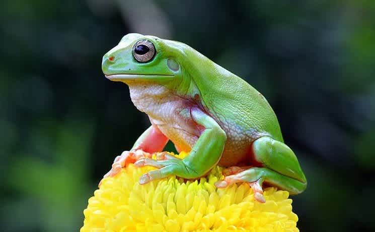 A frog sits atop a woman's head. She's lifting the frog up; away from a gloomy, dark place, toward a hopeful and colorful environment.