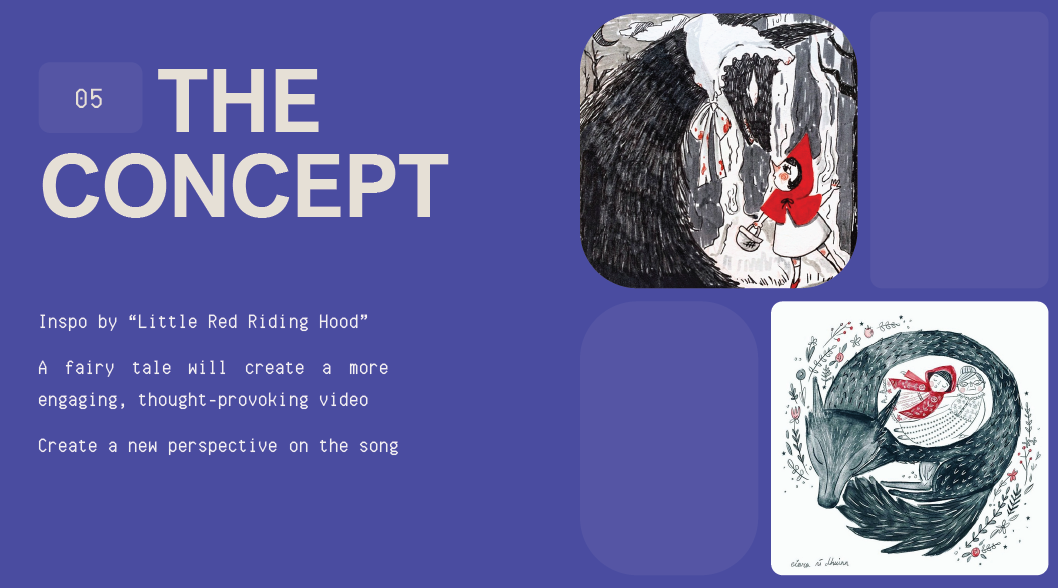 This project is a visual interpretation of “Lunch” by Billie Eilish, developed for the Narrative and Sequence module. The work translates the song’s themes of desire and power into a surreal visual narrative, inspired by a reimagined version of Little Red Riding Hood. The story is told through symbolic imagery and sequential scenes, creating a non-literal, dreamlike perspective on the song.