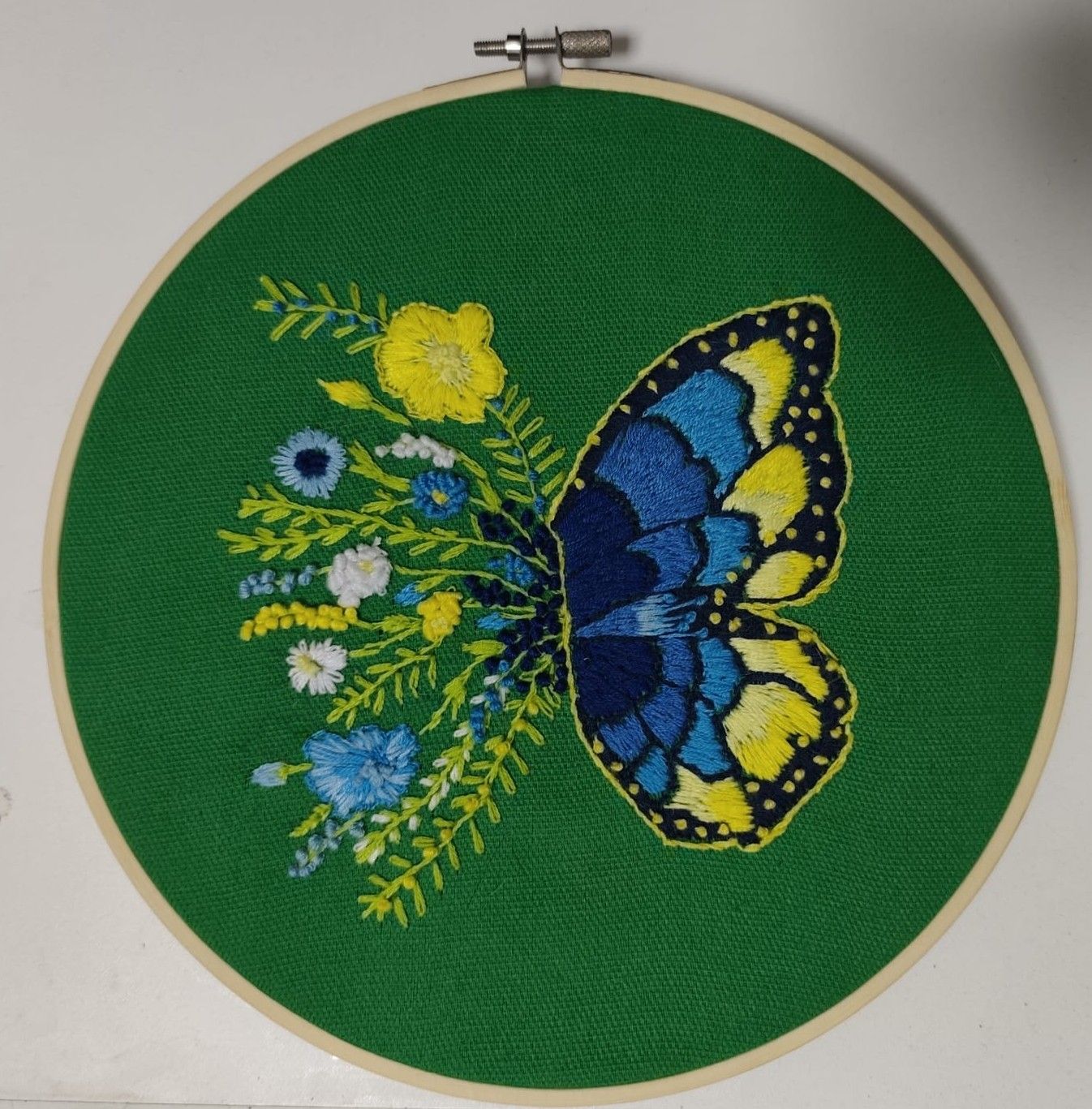 Escolhi bordar uma borboleta acompanhada de flores para criar uma composição delicada e harmoniosa. A borboleta simboliza leveza, transformação e beleza efémera, enquanto as flores ao seu lado reforçam o tema natural, trazendo cor, vida e movimento à peça.