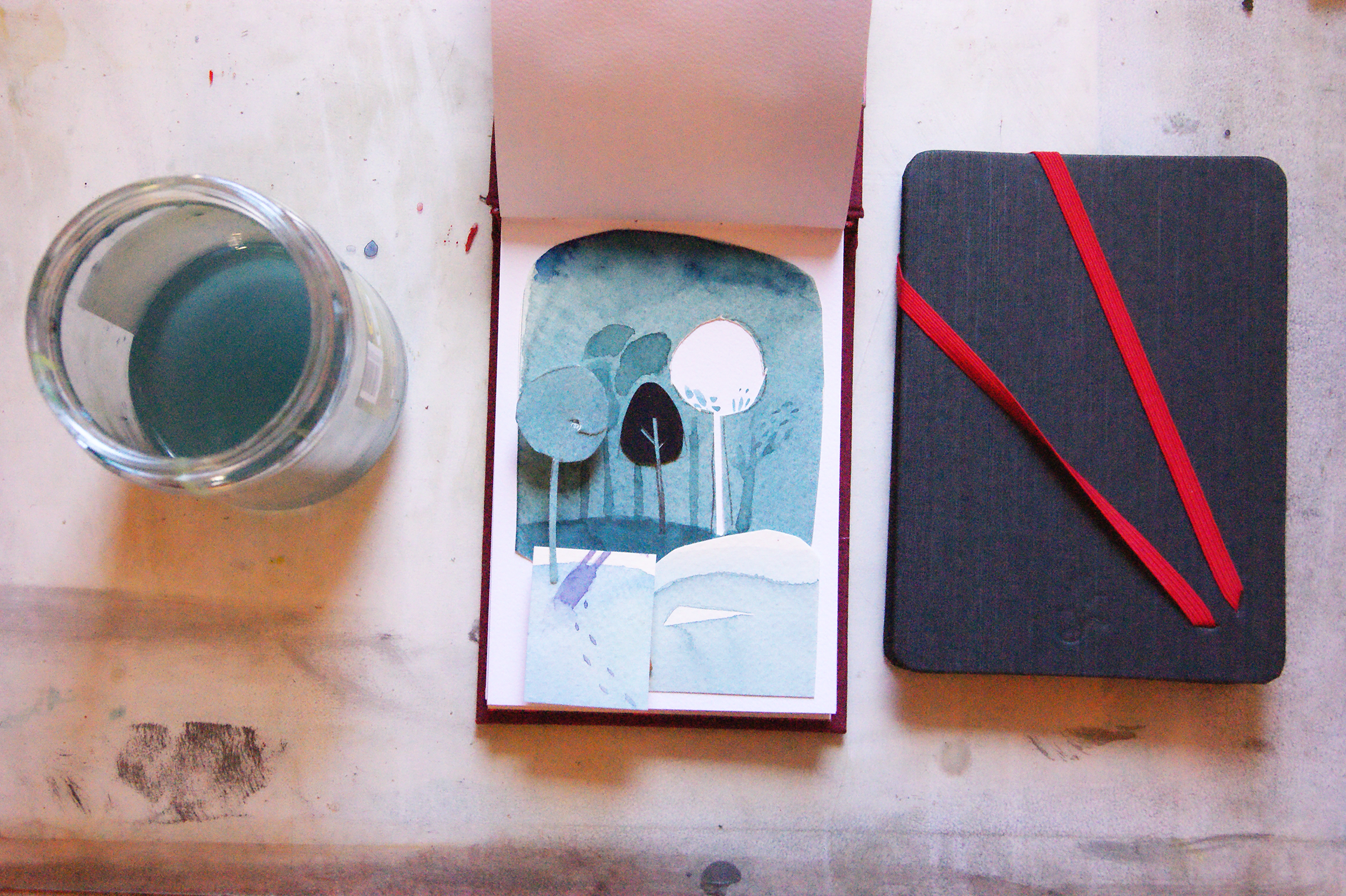 Cuaderno para bocetos, acuarela, tijeras, pegamento y Photoshop.