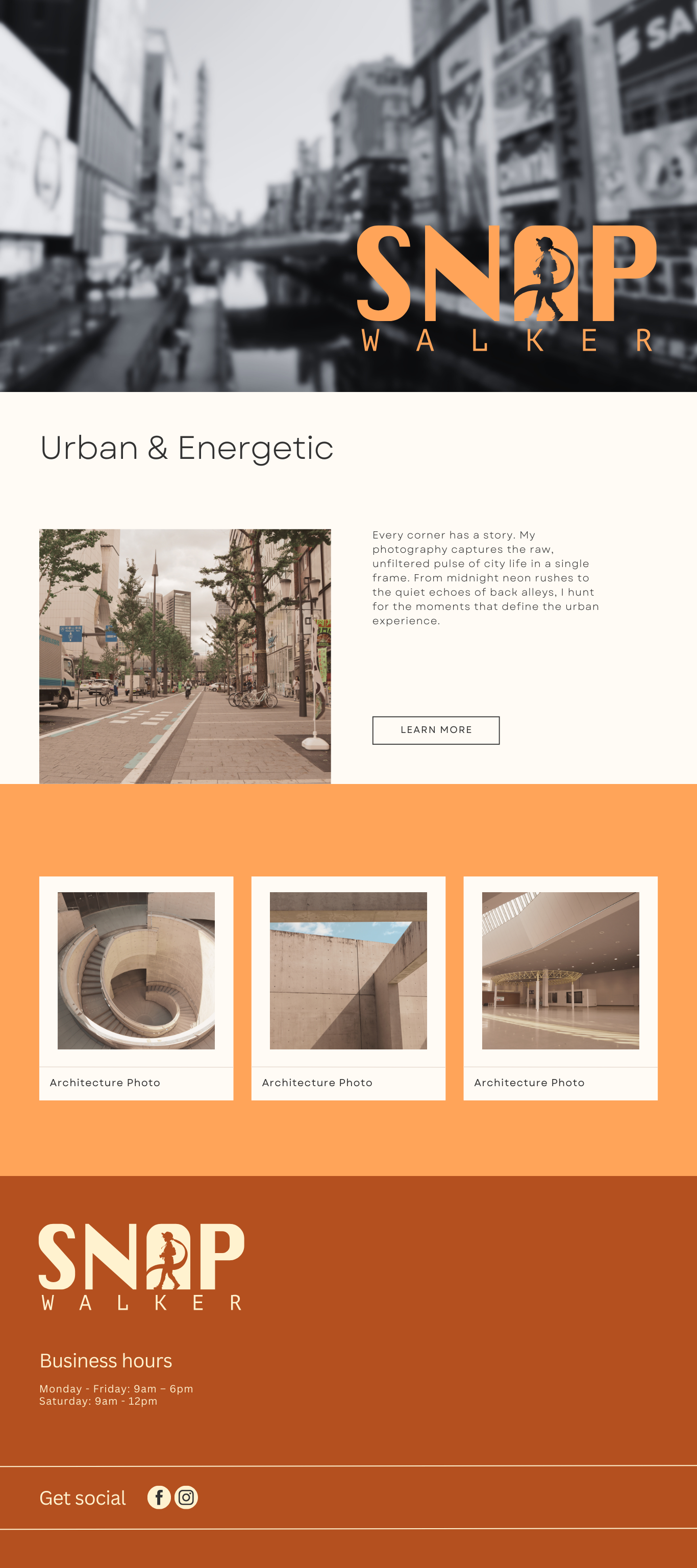 This experimental web page showcases a gallery of past works, giving visitors a glimpse into the brand’s visual style. The overall look and feel are strictly guided by the elements established in the Style Guide. https://snapwalker.my.canva.site