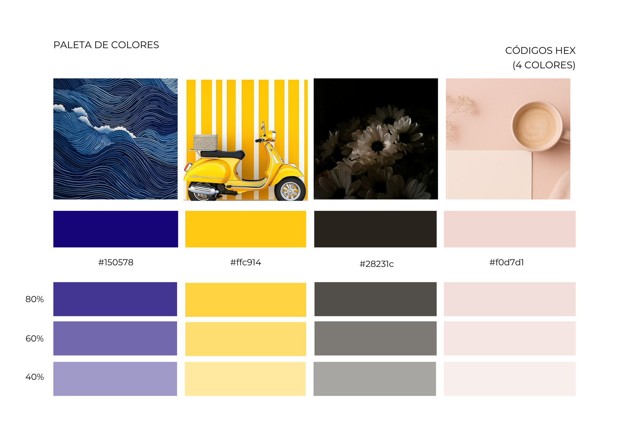En este primer paso, luego de haber analizado varios perfiles de Instagram como inspiración, llegó la hora de asignar colores y tipografías que reflejarán aquello que la marca esperaba comunicar. Así, asigné una paleta con 4 colores que reflejaban los valores de la marca y un conjunto de 3 tipografías que me ayudarían a comunicar de forma clara la información dentro de los post.