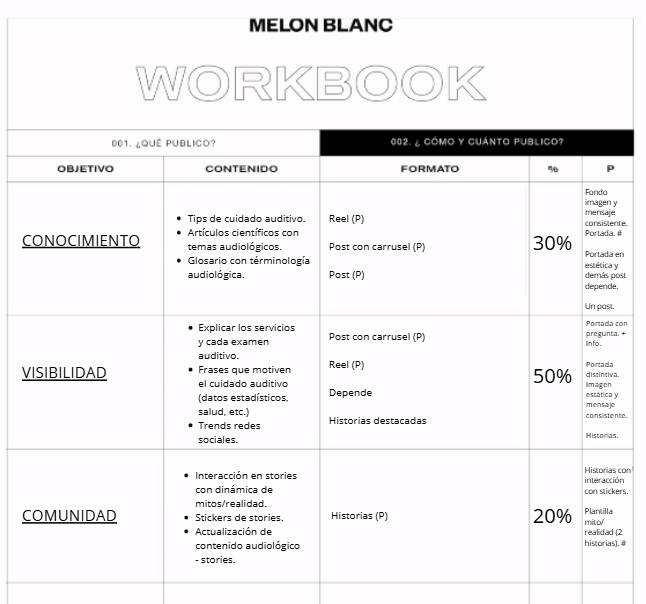 Luego, empecé a plantear los diferentes objetivos que deseaba alcanzar con la página de Instagram de la marca y de igual forma, a definir el tipo y la cantidad de contenido que publicaría según cada objetivo establecido. De esta forma planteé 3 objetivos: conocimiento, visibilidad y comunidad. Y a cada objetivo asigné un porcentaje de publicaciones, así como el tipo de publicación que contendría cada categoría. Este paso me ayudó mucho a visualizar mi marca y lo que esperaba alcanzar para de esta forma, planear el contenido según las metas planteadas.