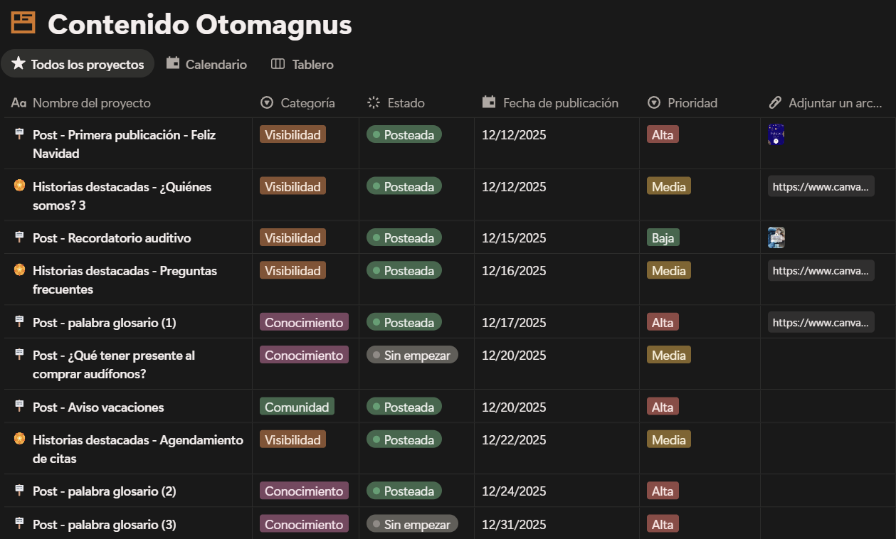 Finalmente, realicé la organización de las publicaciones, según lo aprendido en el curso, a través de la aplicación Notion y empecé a publicar. A continuación, un ejemplo de cómo se veía la planeación en la plantilla que diseñé para este fin y el perfil final hasta ahora. *Nota aclaratoria: si bien el objetivo del primer mes eran 12 publicaciones según el curso, por ser el primer mes de funcionamiento de mi página, tuve que hacer el diseño de múltiples historias (como se visualiza en la planeación de Notion), para las destacadas, así que finalmente realicé 6 publicaciones y las historias destacadas.