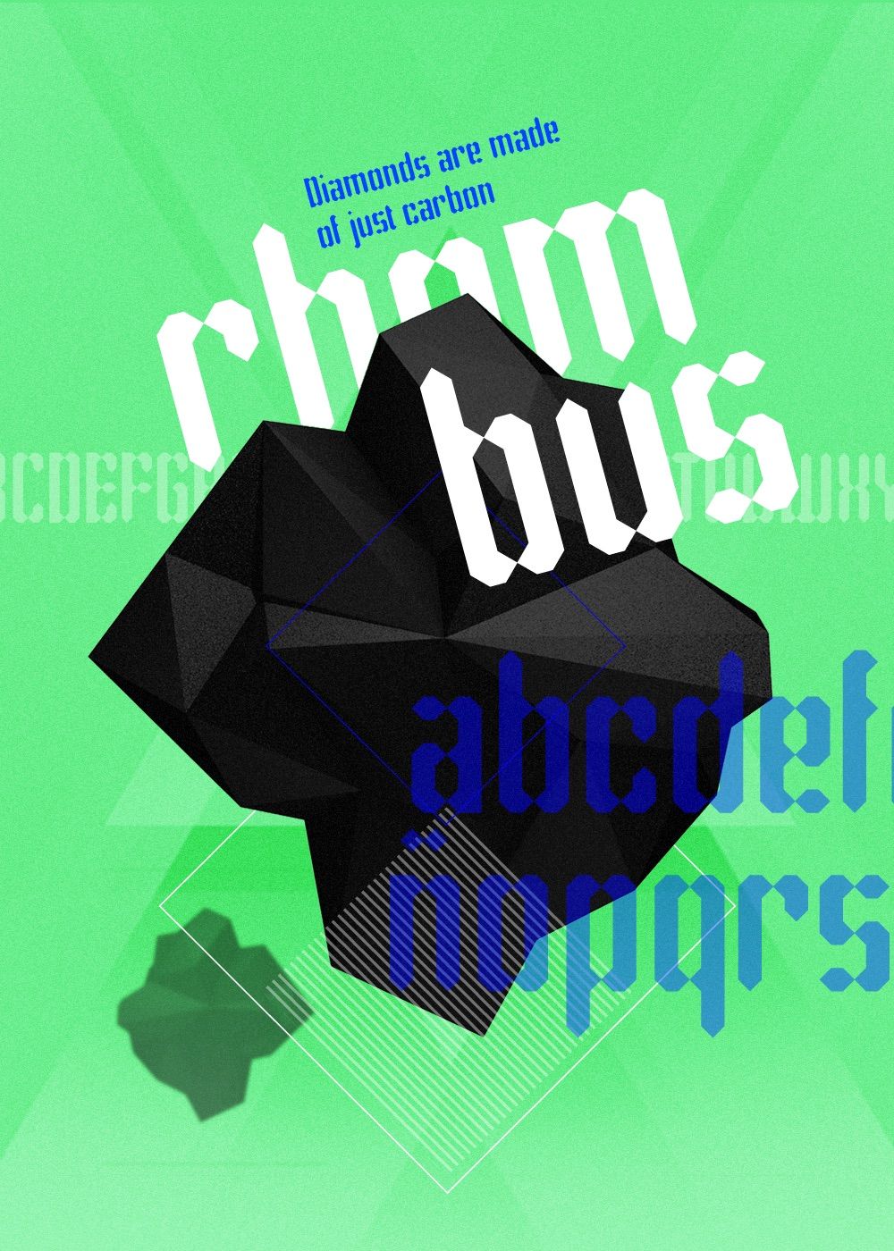 Rhombus es una tipografia display basada en modulos con forma de rombo, diseñada como parte del curso de "Tipos con clase" de Wete. Un curso muy aconsejable para todos los que quieran crear una tipo desde el papel hasta su archivo opentype final.
