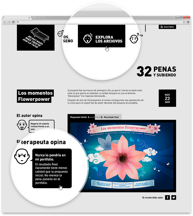 "No hay nada más triste que lo tuyo" es un proyecto personal en clave de humor sobre la relación entre cliente y diseñador. El objetivo de la web es hacer terapia de grupo para reirnos un poco de nosotros mismos, olvidar nuestras fustraciones y volver a disfrutar con nuestro trabajo. ¿Y por qué no? Reirnos un poco también de las frustraciones de otros diseñadores y descubrir que, al fin y al cabo, siempre hay algo más triste que lo tuyo.