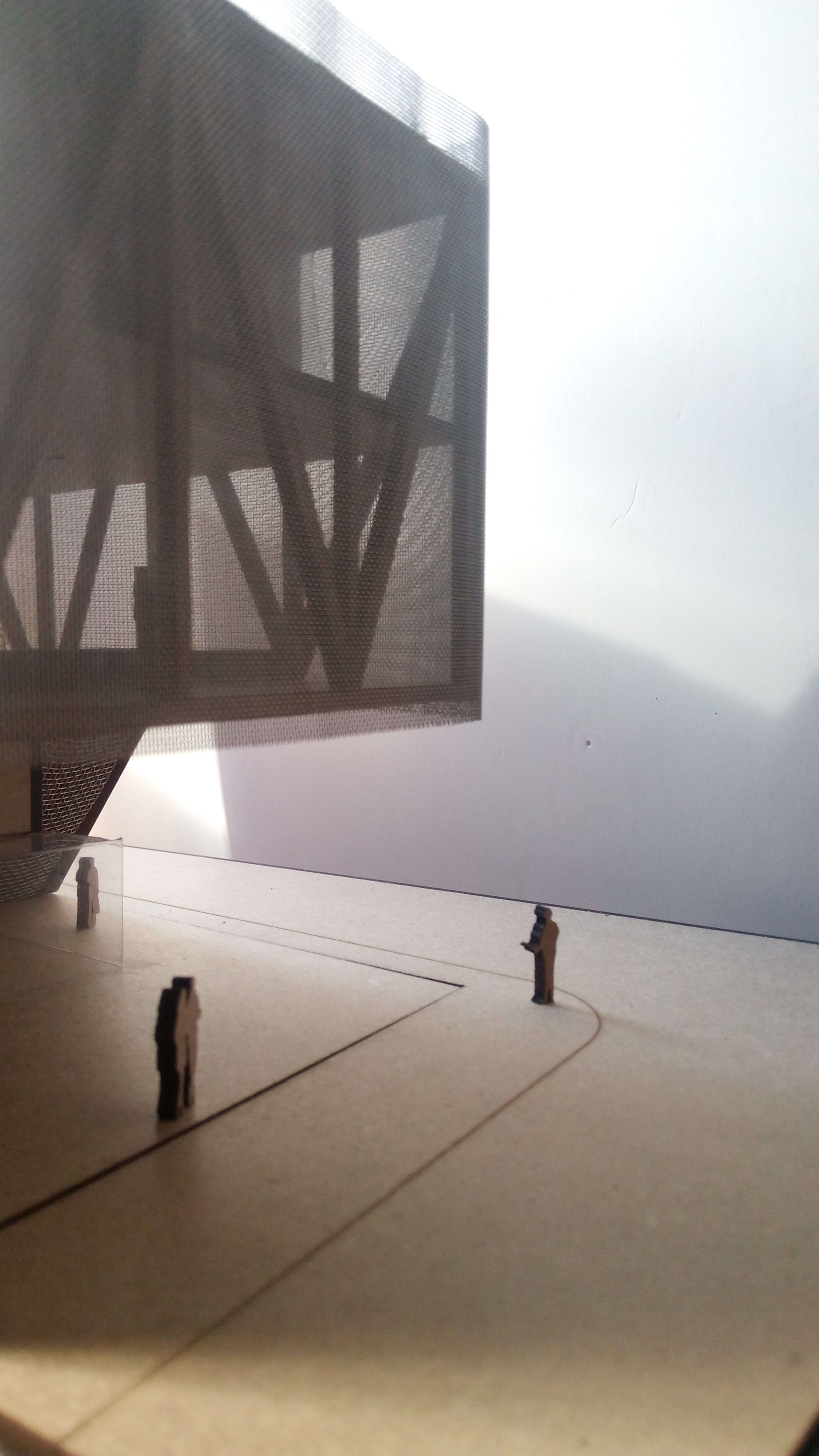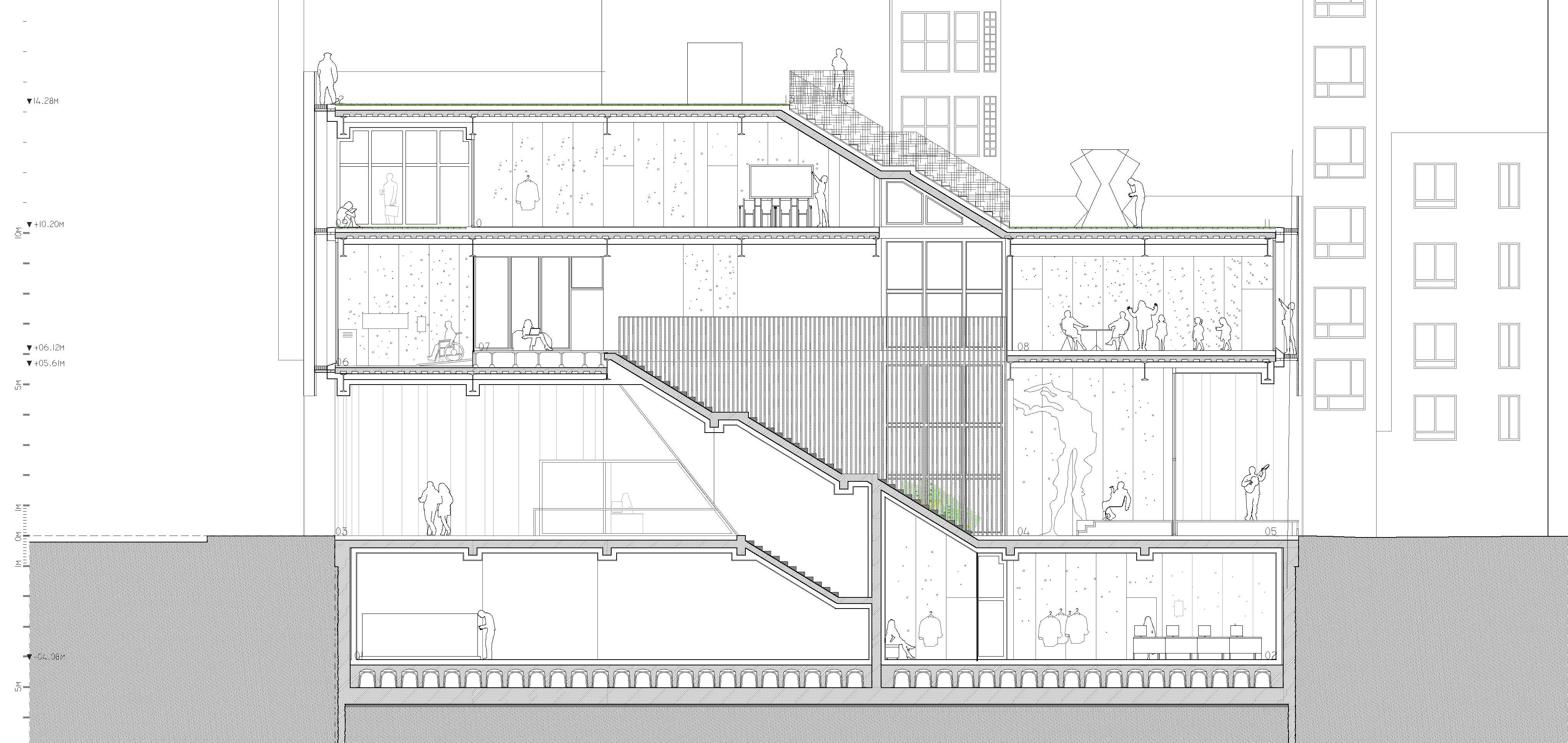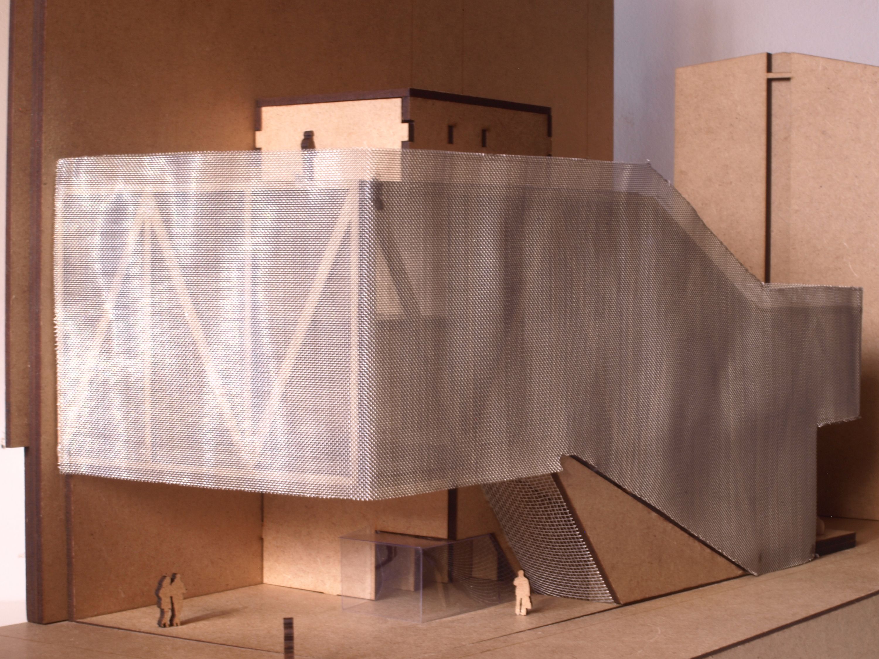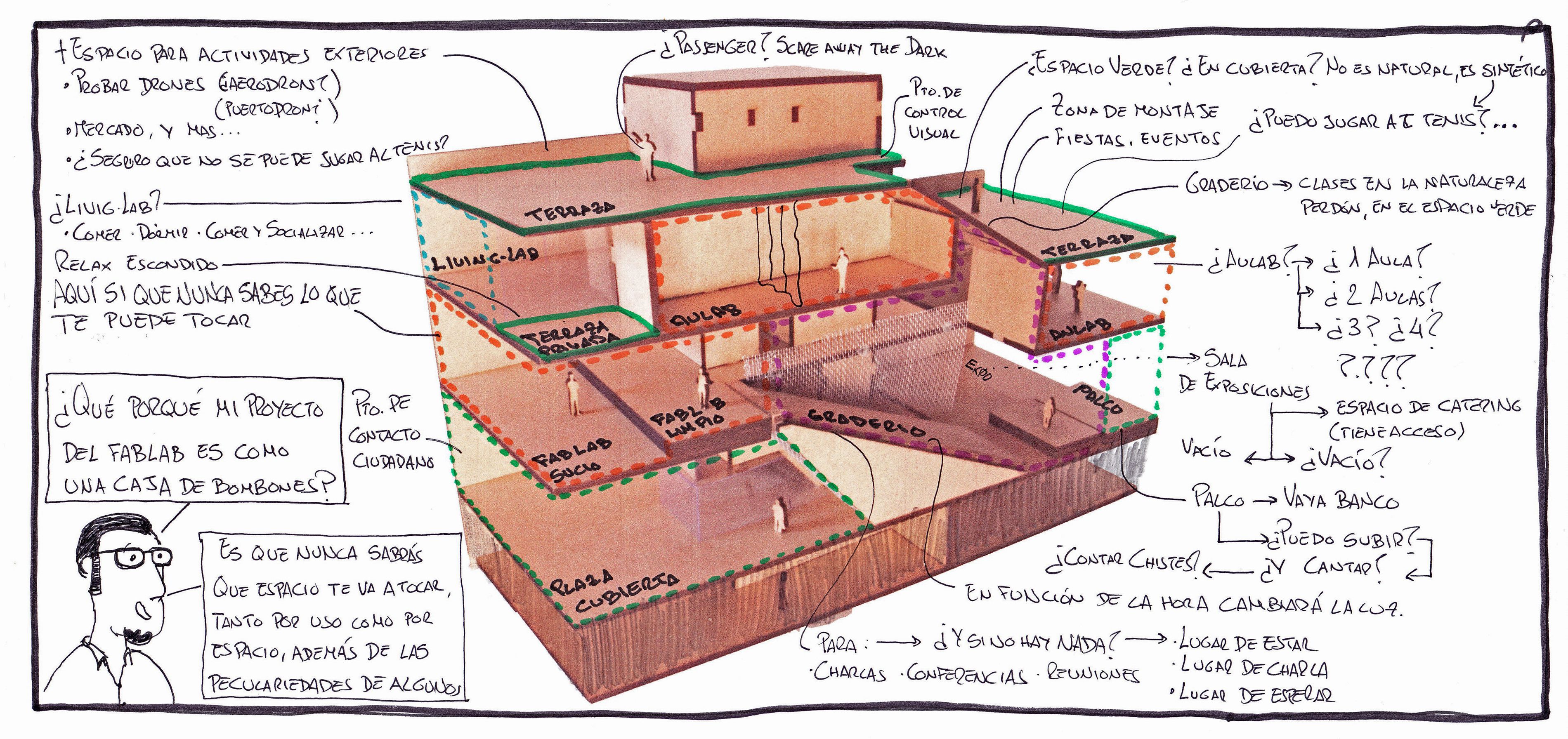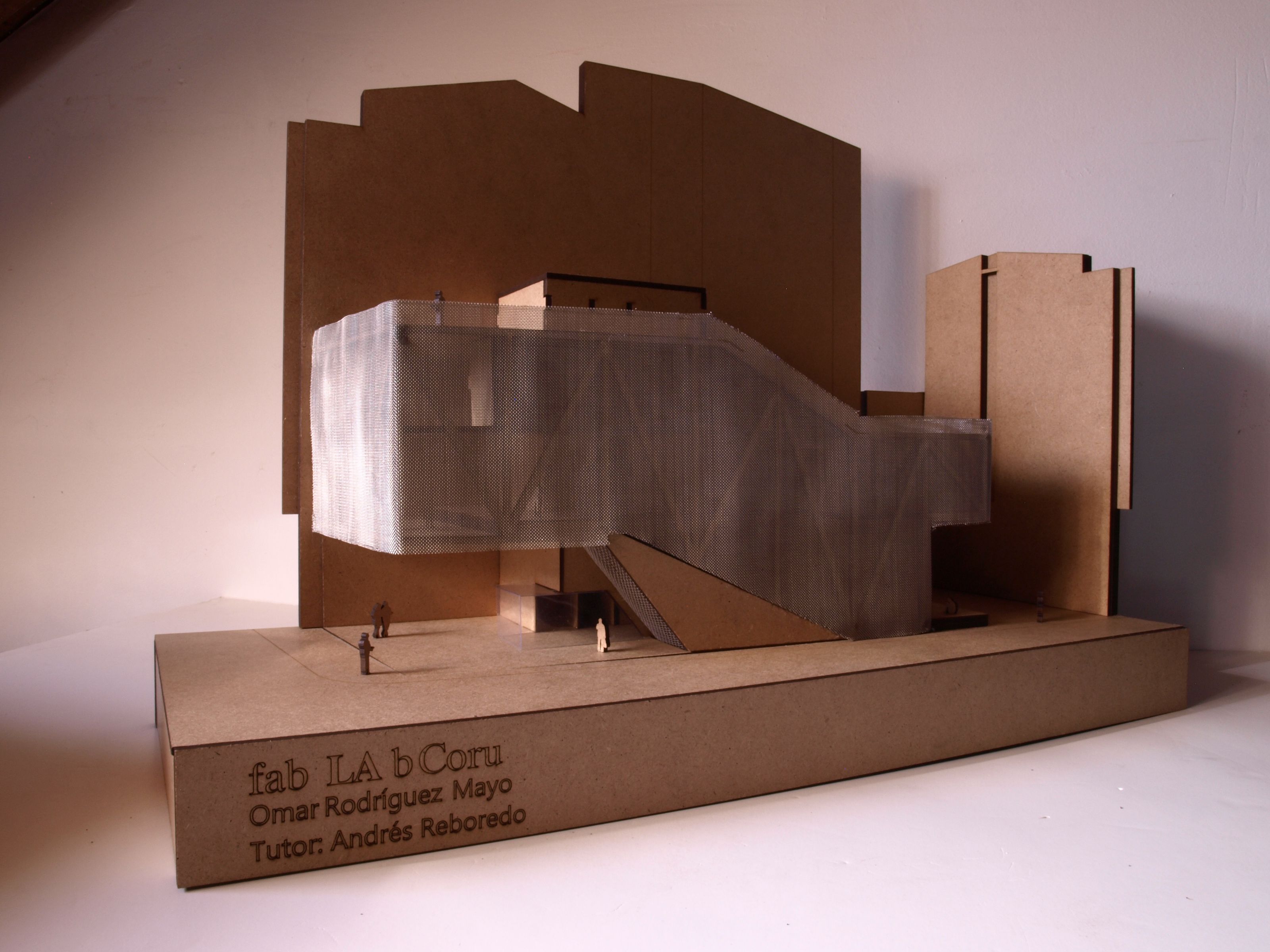 Proyecto de Fab Lab en la Rúa de San Andrés de Coruña, en una parcela en esquina y con una servidumbre trasera. El volumen se va formando en función a los usos y necesidades que va teniendo como las elevaciones que permiten los espacios públicos, tanto de acceso como de entrada secundaria.