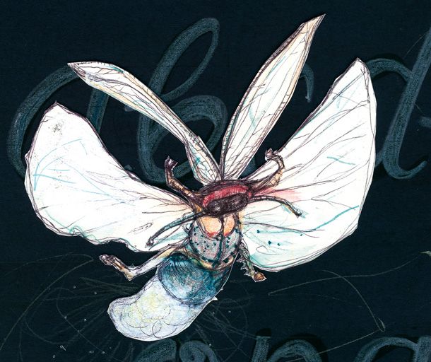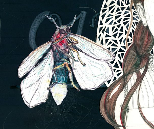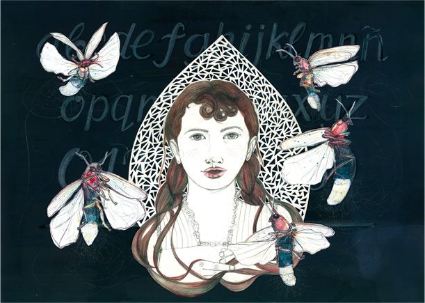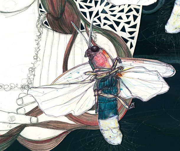 Dibujo realizado con grafito, acuarela, lapices acuarelables, tintas, boli Bic, lápiz pastel... Collage y papercut.