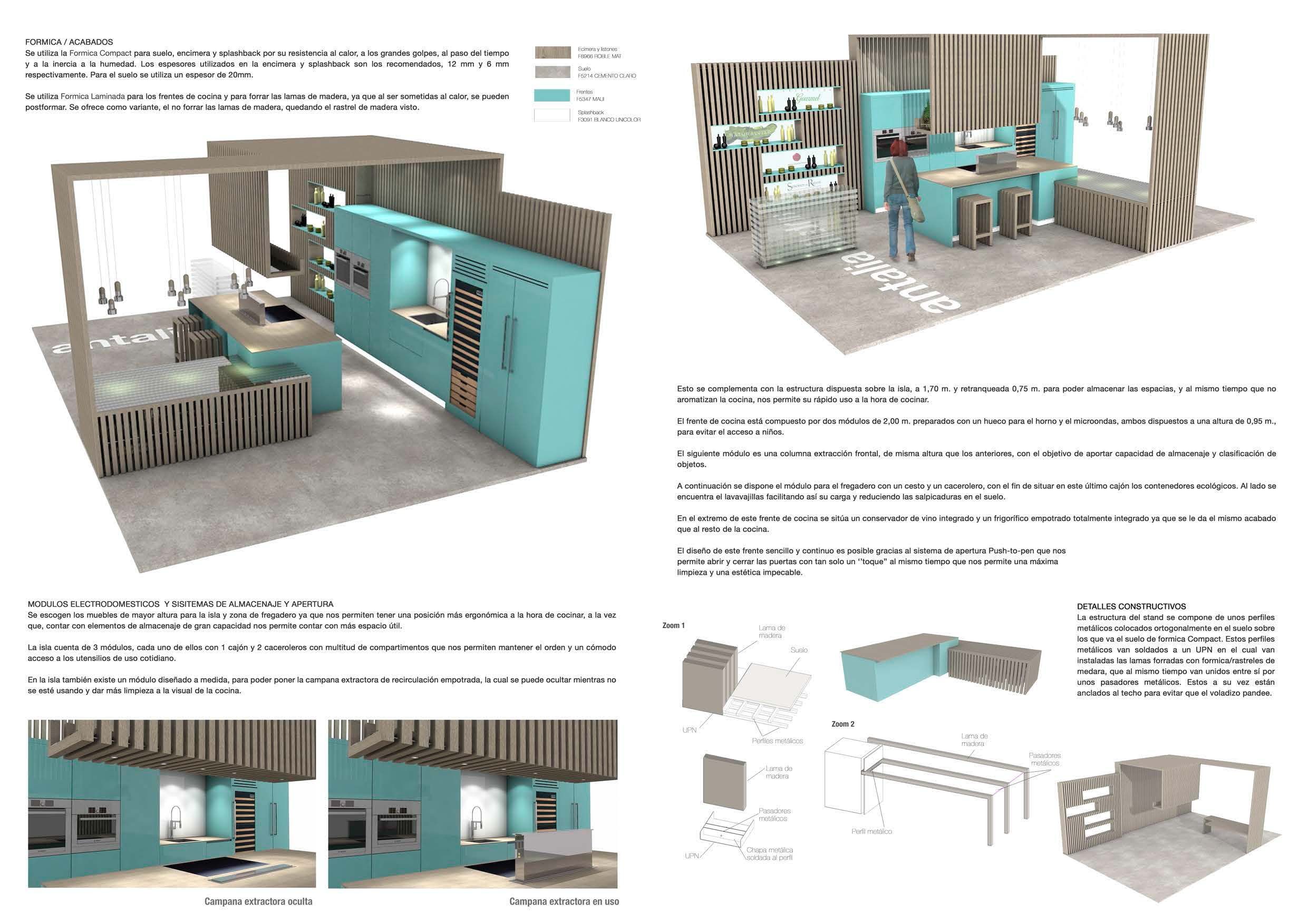He querido crear una cocina totalmente abierta y funcional, cuya estructura nos permita ubicarla en cualquier tipo de feria, tienda, o incluso vivienda. Al no tener que ir apoyada sobre ningún paramento, y siendo su único apoyo el anclaje al techo, nos permite su fácil montaje en cualquier lugar.