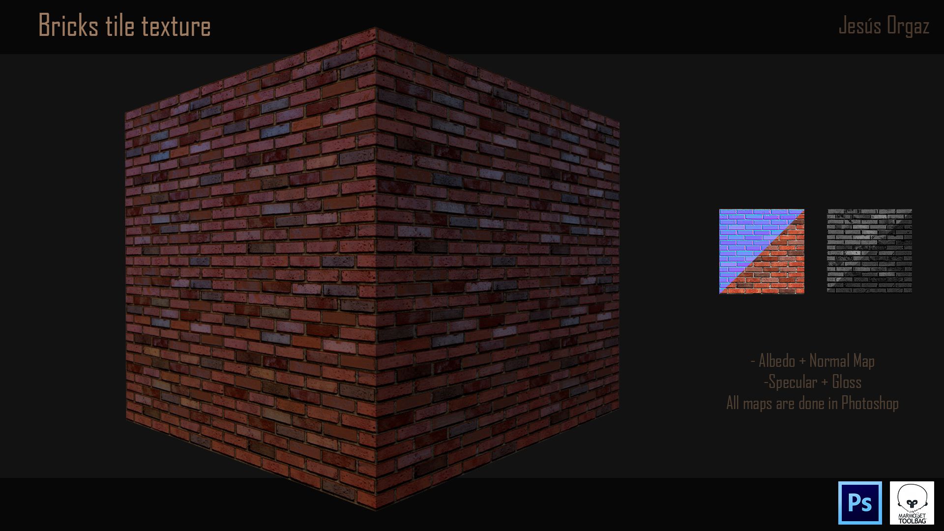 Se trata de una textura tileable hecha 100% con Phostoshop, si queréis saber algo más y poder verla en 3D a tiempo real podéis hacer click aquí.