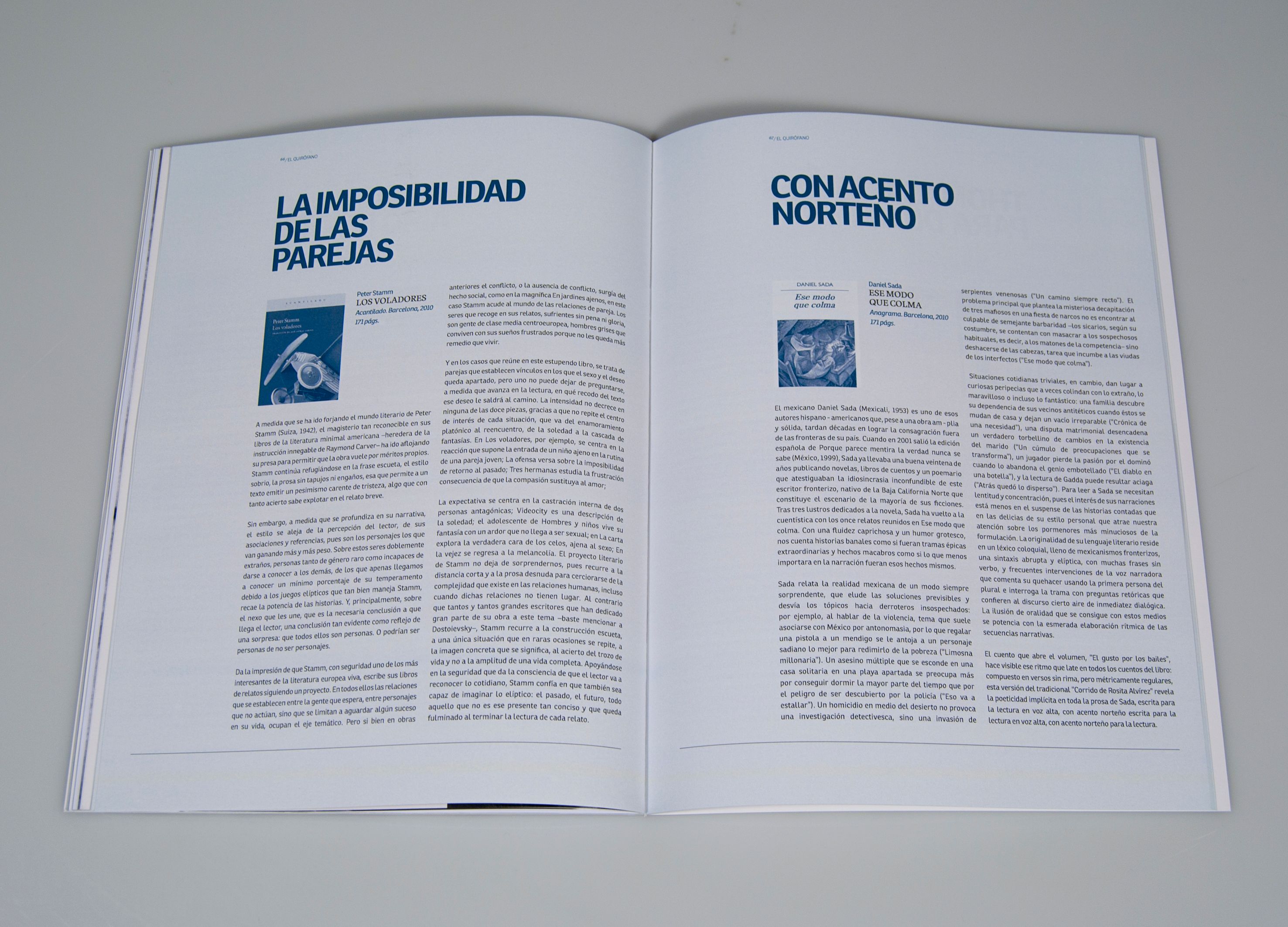 This project is a total redesign of Quimera, a monthly spanish publication about literature. It shows a double cover that play with the Q logo and two sections. The first one is strictly editorial and the second one is focused on book reviews. The titles alternate Ronnia Heavy with the serif Karmina.
