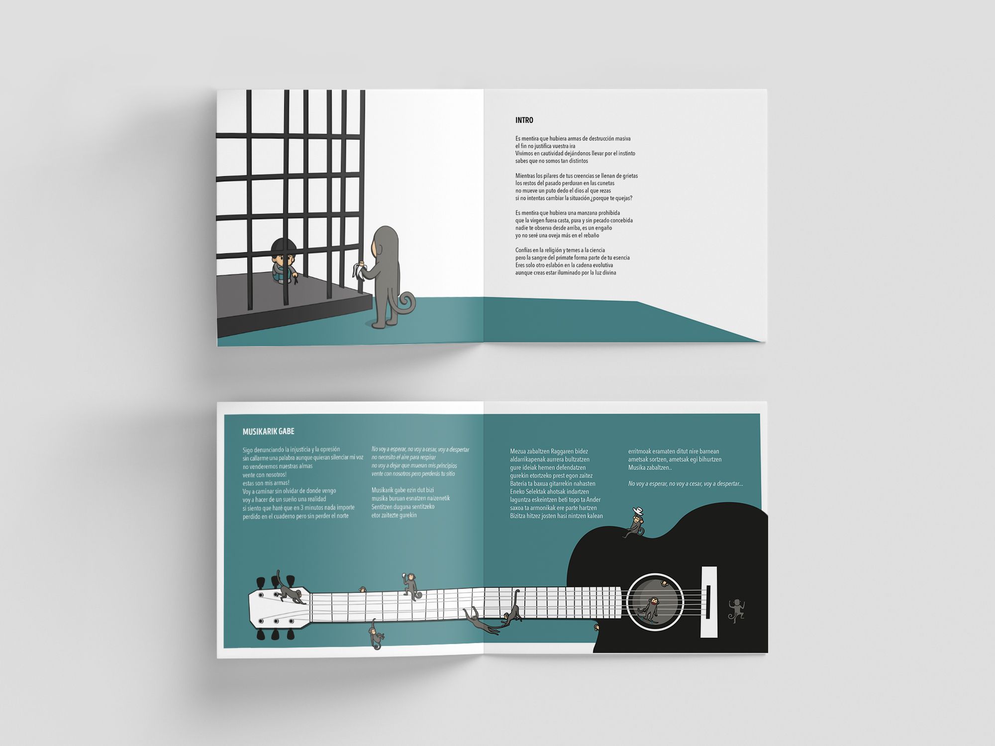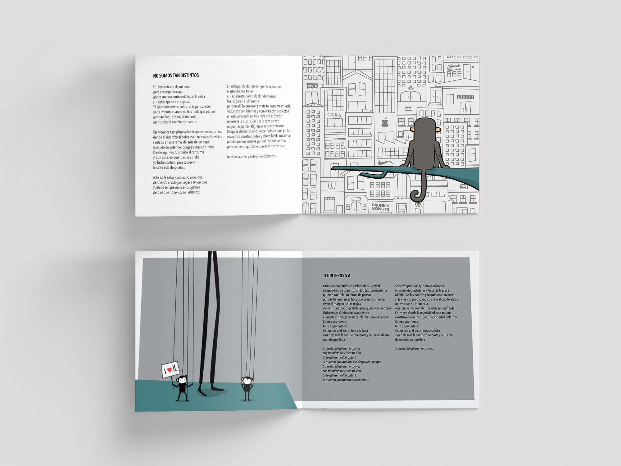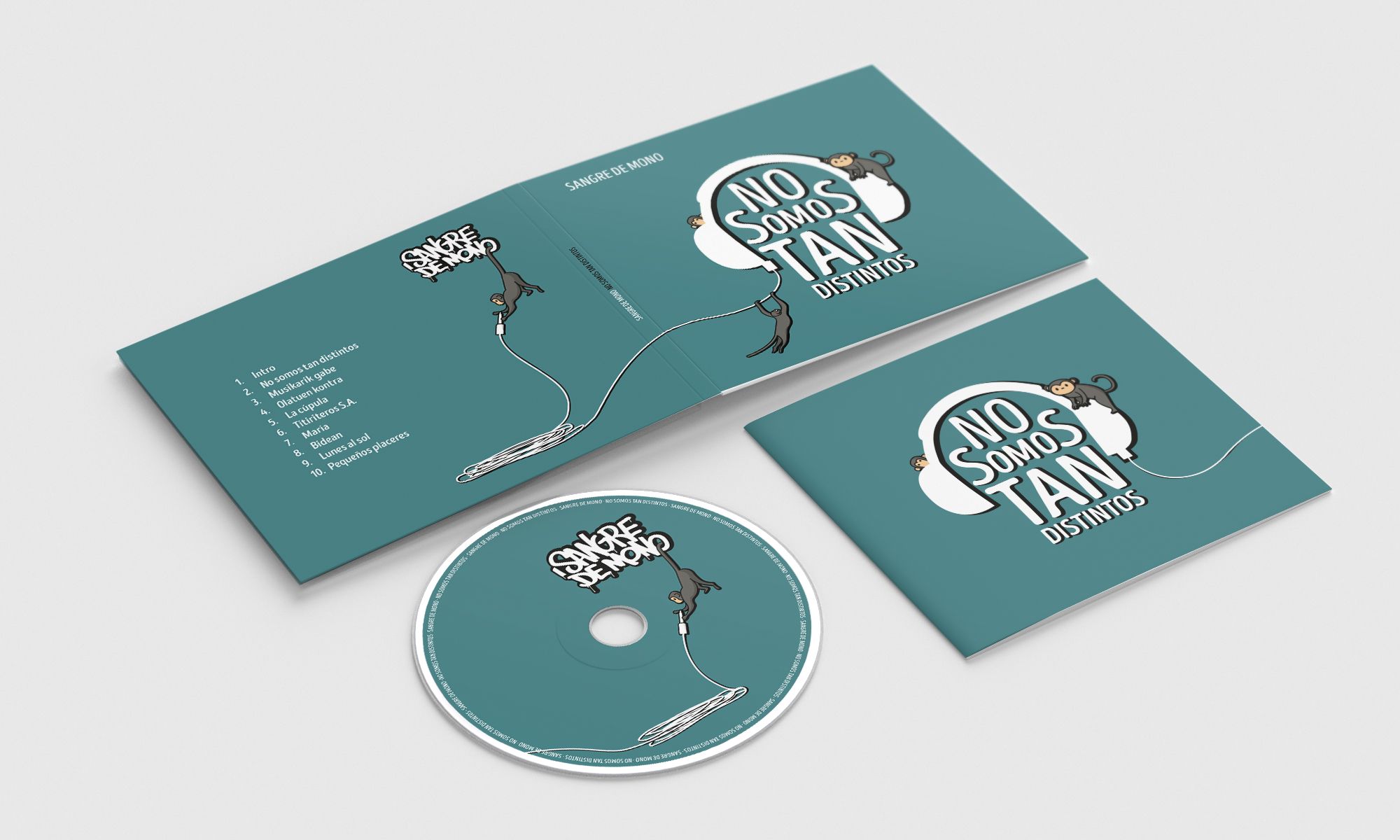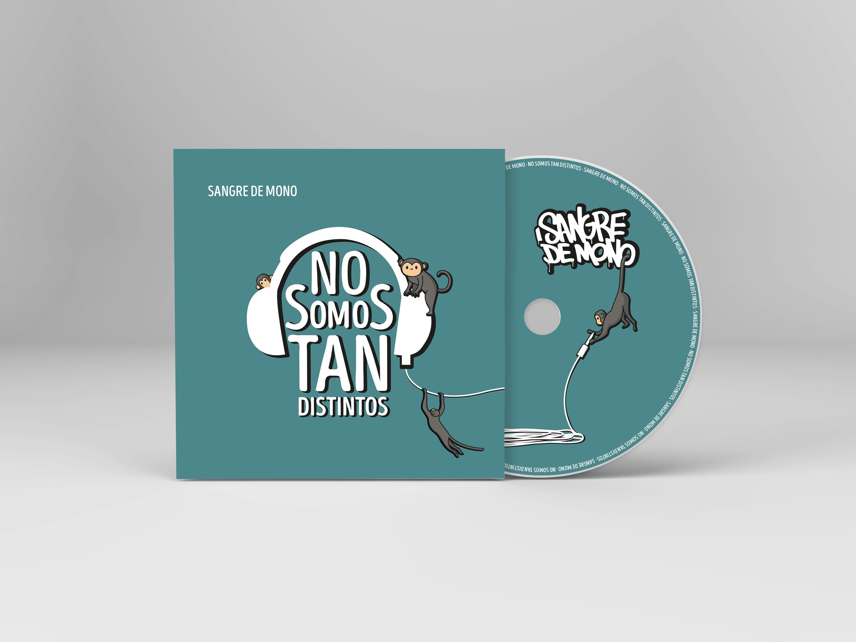 Diseño del disco "no somos tan distintos" del grupo de raggae Sangre de Mono. Todo el diseño juega con la dicotomía entre monos y humanos, demostrando a simios haciendo cosas de humanos y viceversa.