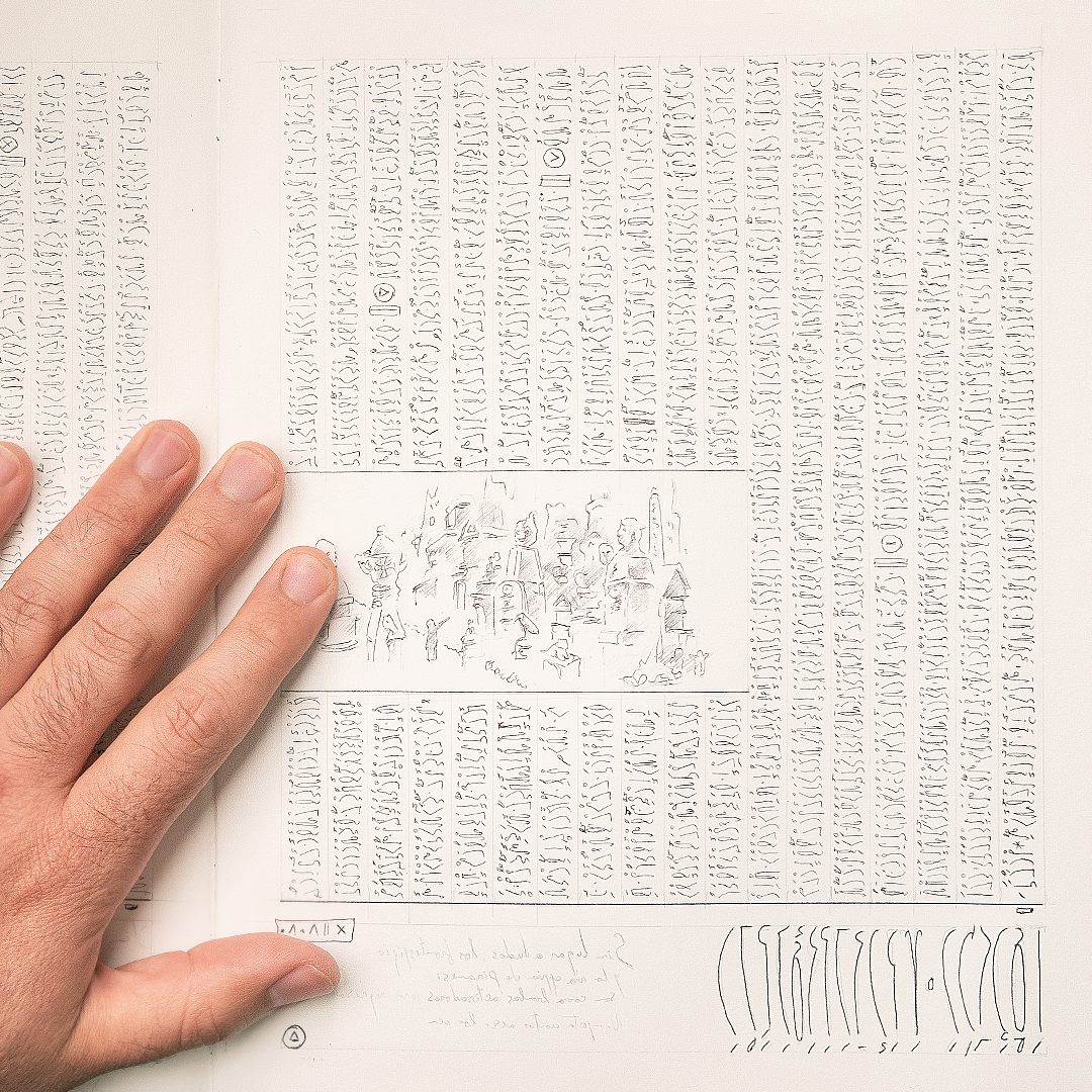 "Mistio" es un alfabeto silábico que desarrollé para poder atemporalizar, comprimir y encriptar los contenidos incluidos en mi obra escrita/visual.