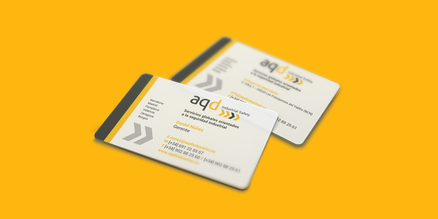 Branding para AQD Industrial Safety, empresa del sector industrial especializada en el ámbito de la prevención de riesgos laborales y marco normativo que afecta a la industria y en concreto a la maquinaria en general.