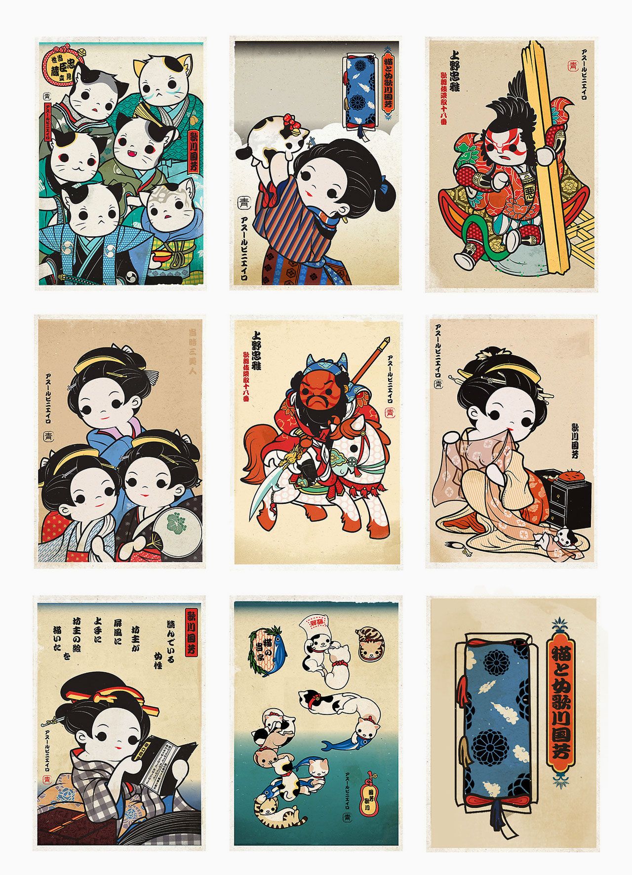 Kawaii-e es una colección de 8 ilustraciones que reproducen la obra de grandes artistas del ukiyo-e como Utagawa Kuniyoshi, Utamaro Kitagawa y Ueno Tadamasa, en una estética moderna y actual, llena de colores y tramas como es el estilo kawaii.
