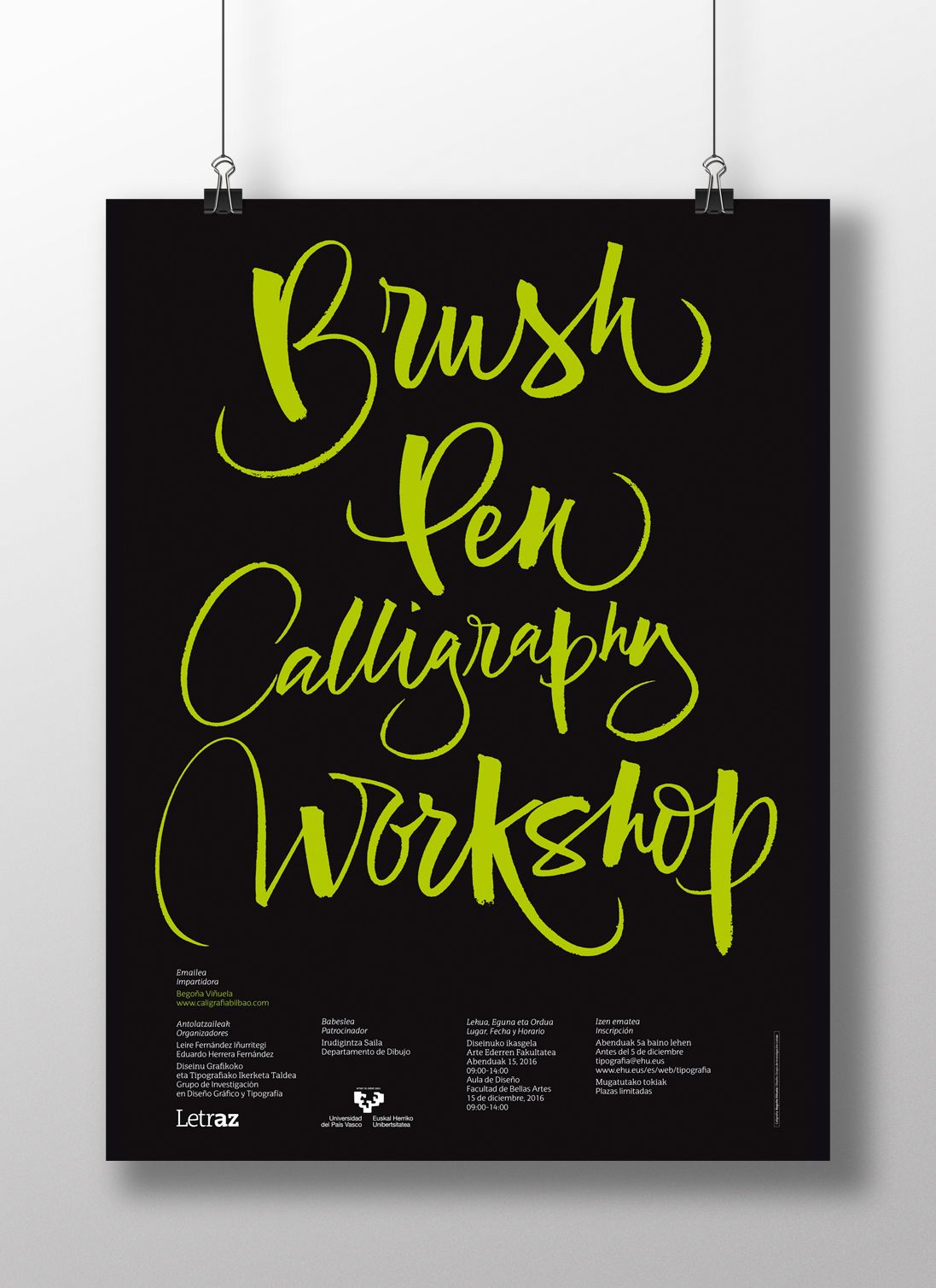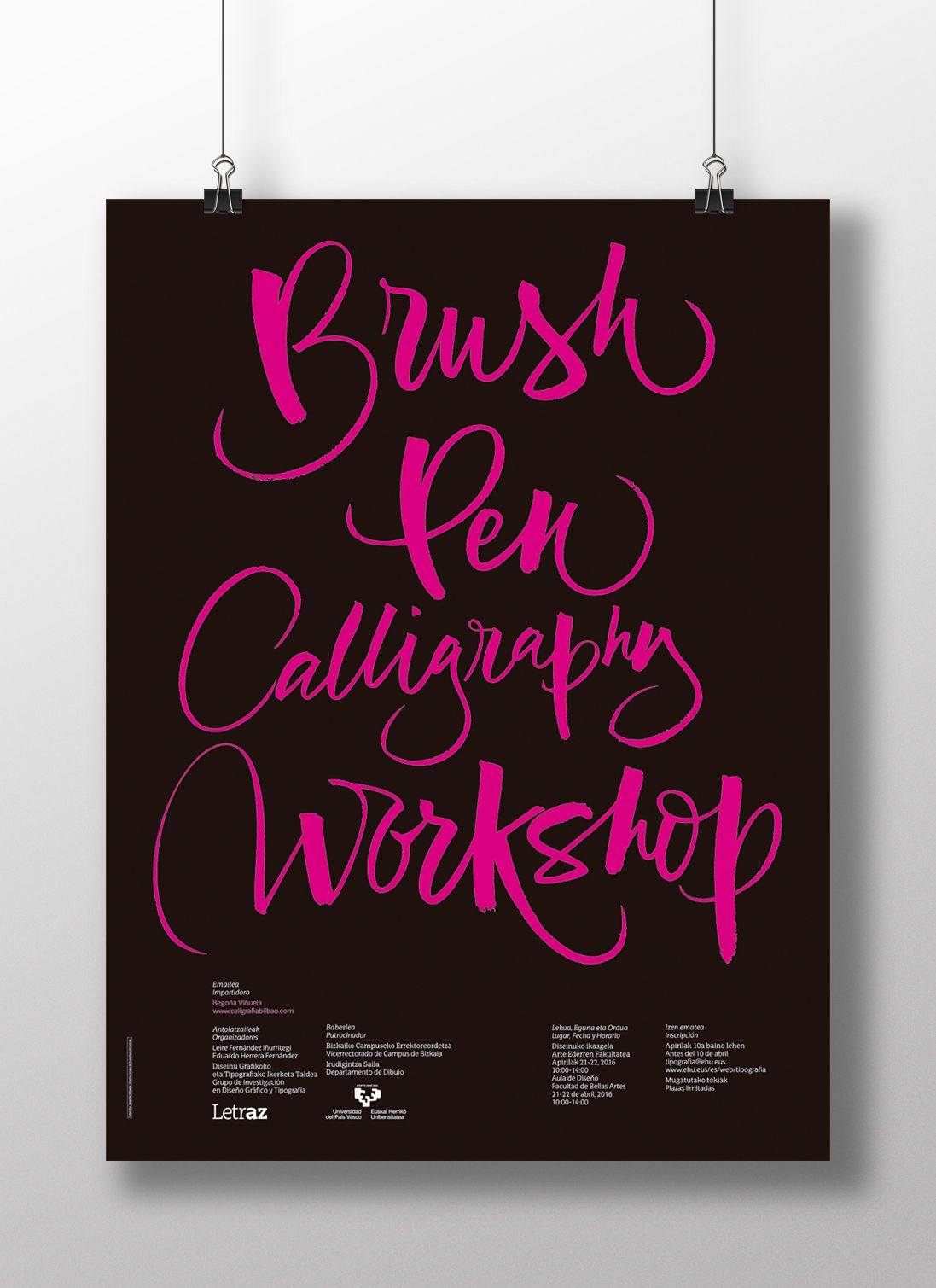 Carteles anunciadores de los talleres «Brush Pen Calligraphy Workshop», dentro de las actividades de Extensión Universitaria de la Universidad del País Vasco/Euskal Herriko Unibertsitatea, organizados por el Grupo de Investigación en Diseño Gráfico y Tipografía «Letraz» e impartidos por Bego Viñuela (www.caligrafiabilbao.com).