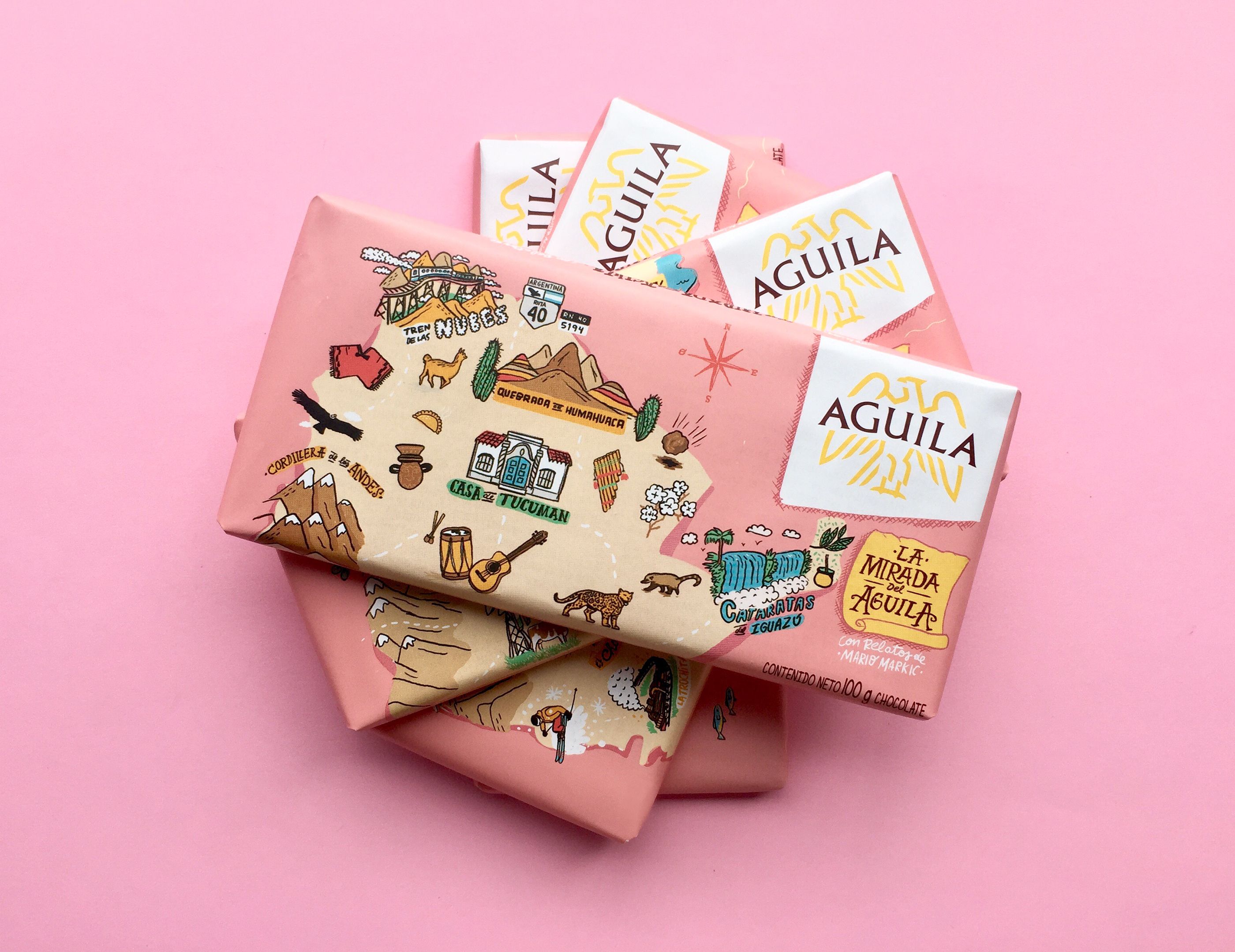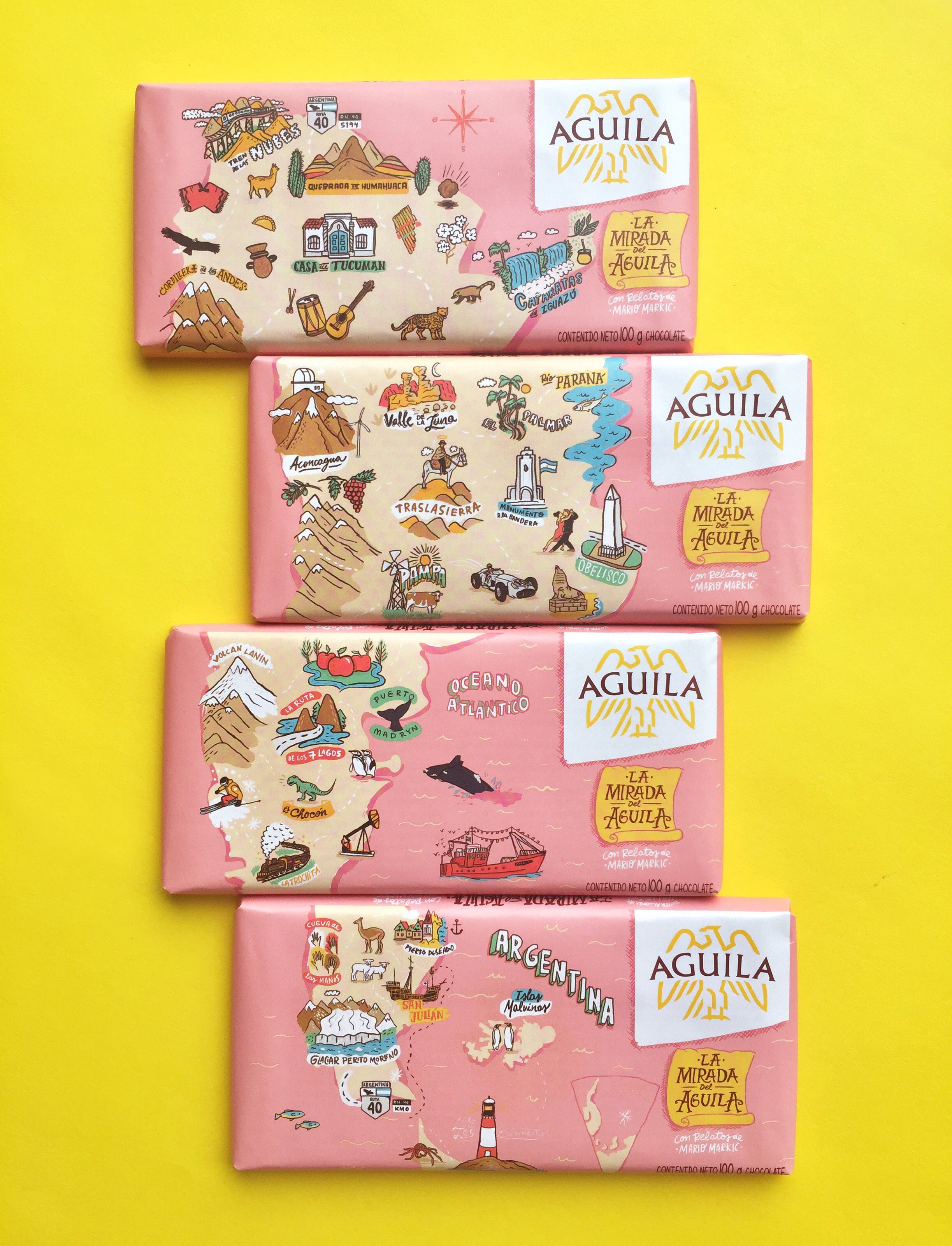 En 2017 trabajamos para Arcor en un diseño exclusivo para sus chocolates en la colección llamada La Mirada del Aguila. Realizamos 4 diseños que al unirlos se forma el mapa de la Argentina. Ilustramos varios de los lugares mas representativos de cada provincia.