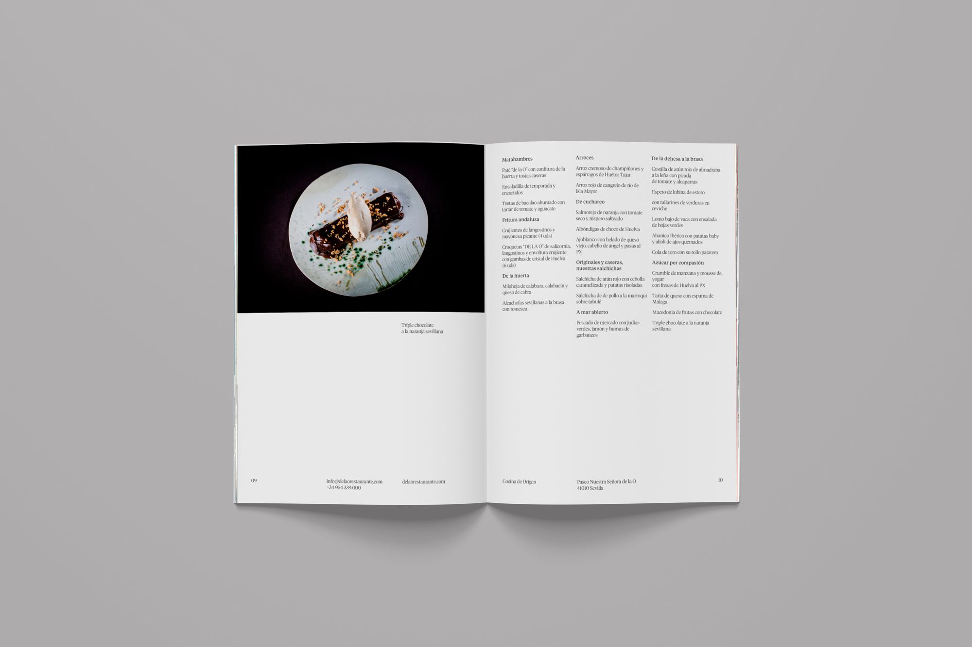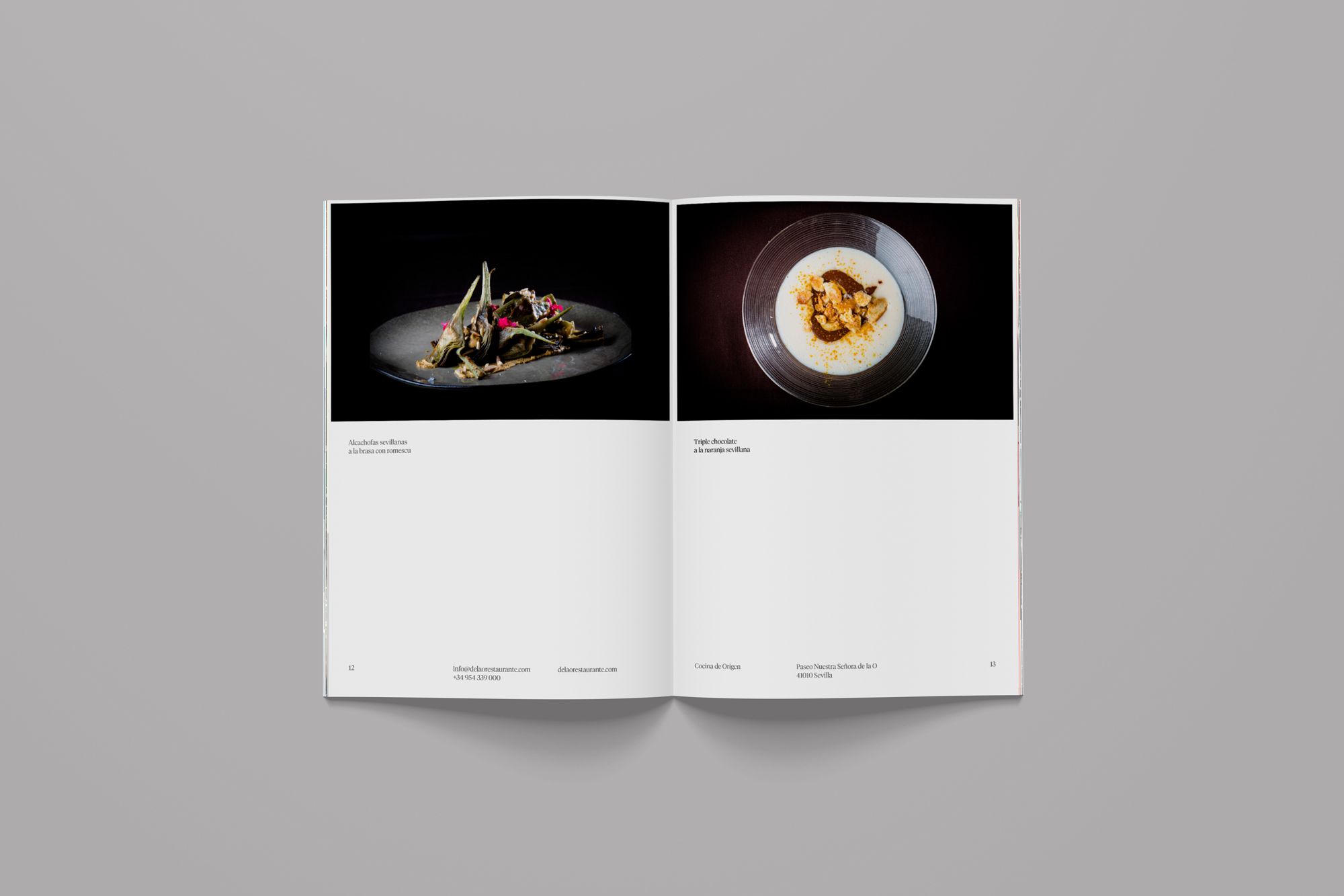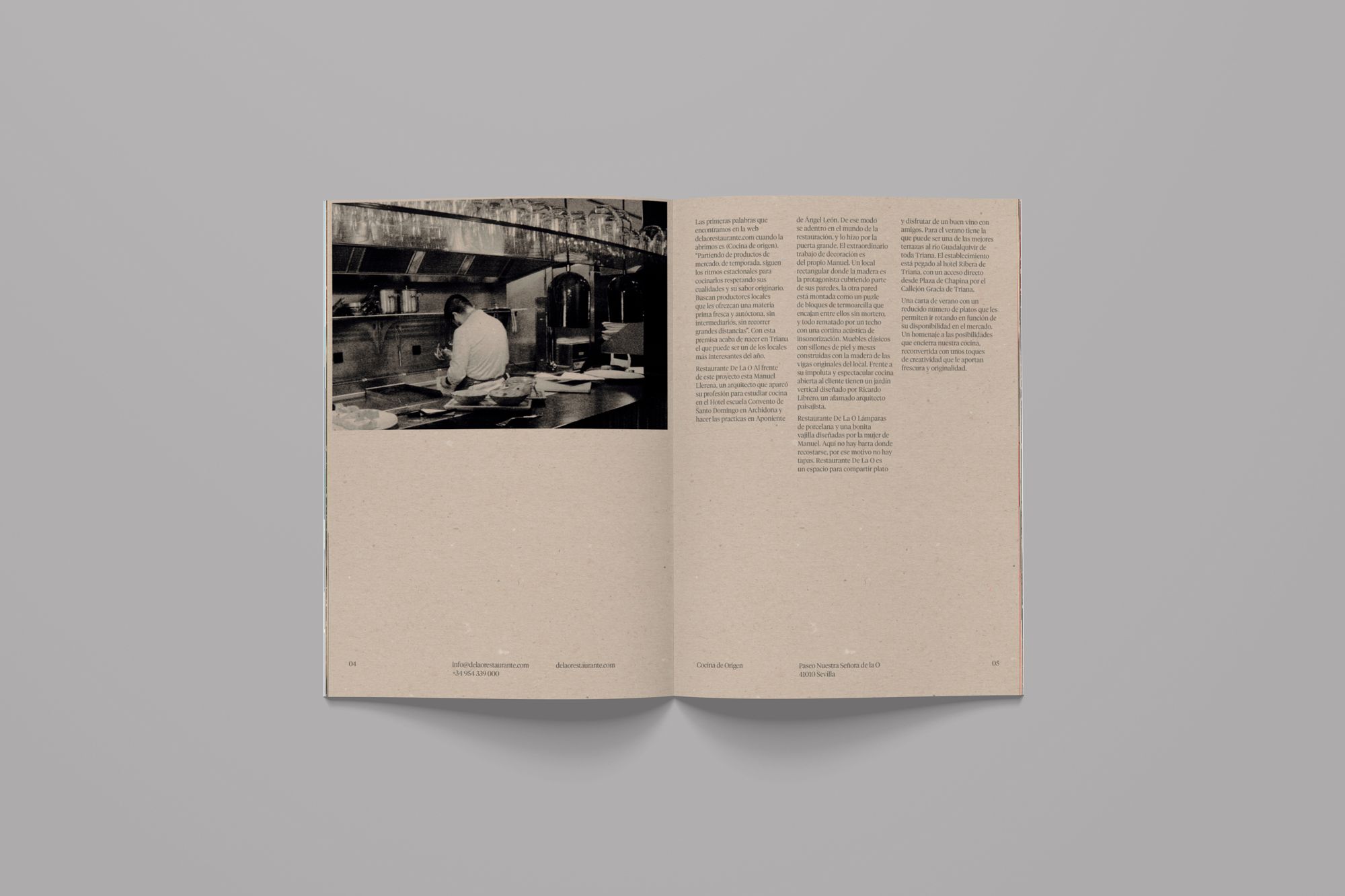 Para el desarrollo de la marca colaboramos con los arquitectos autores del proyecto Gema Aguilera Gómez y Manuel Llerena Maestre, a su vez propietarios del restaurante. La paleta cromática la obtenemos de materiales empleados en el propio local, donde el negro de la entrada combina con diferentes tonalidades de marrones y grises que conforman los paramentos verticales y horizontales. Bajo estas pautas, creamos la página web, papelería corporativa y una pieza editorial que funciona como carta y publicación periódica en la que mostrar su historia, eventos y exposiciones que en el restaurante se celebran.