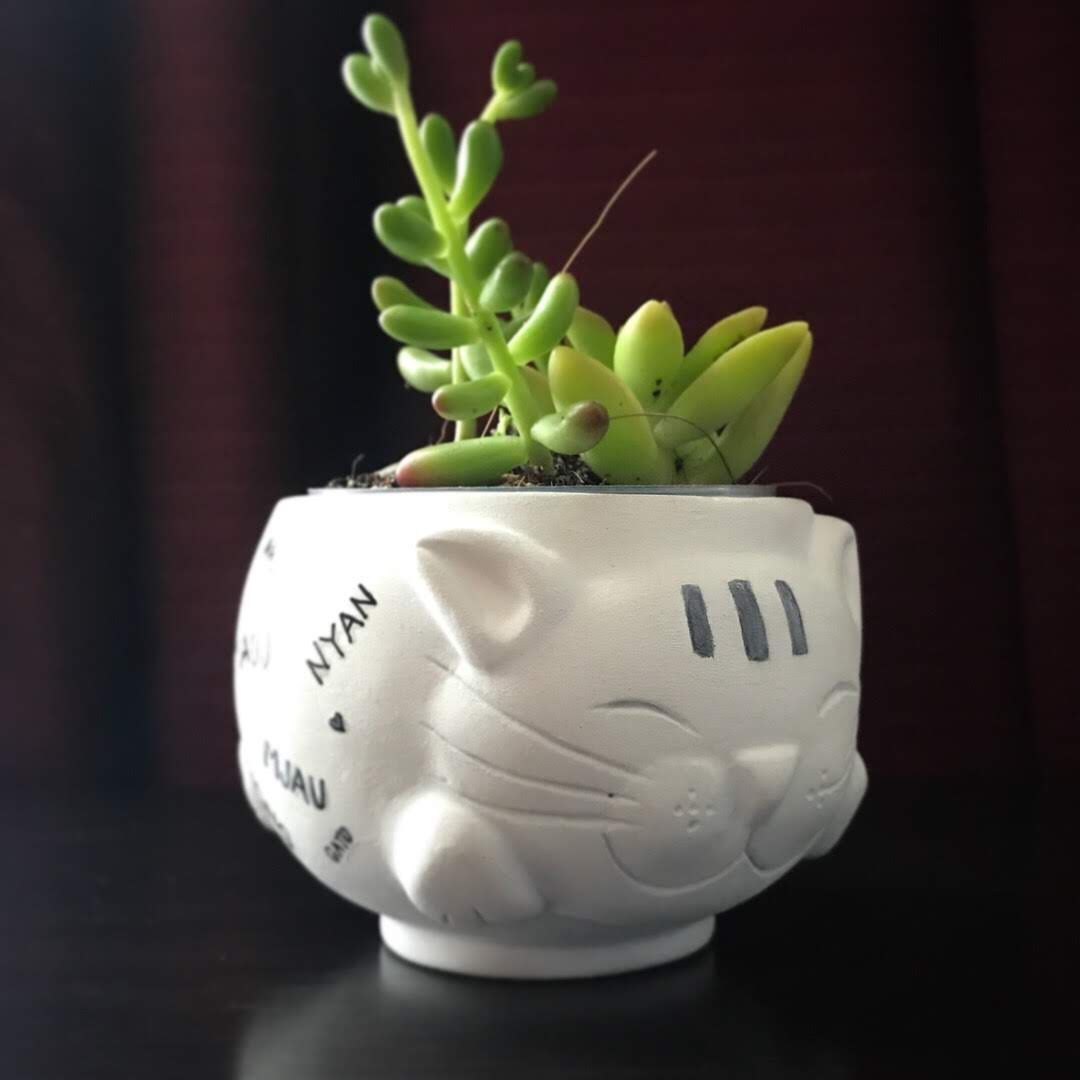 Este es mi proyecto final para el curso de Cerámica Creativa. Una 'maseta personaje' lo realicé en cerámica de secado al aire y lo decoré pintándolo con acrílicos ( la onomatopeya 'miau' en diferentes idiomas).