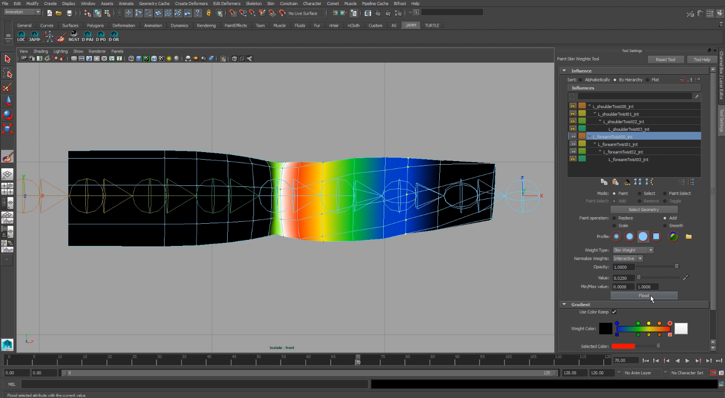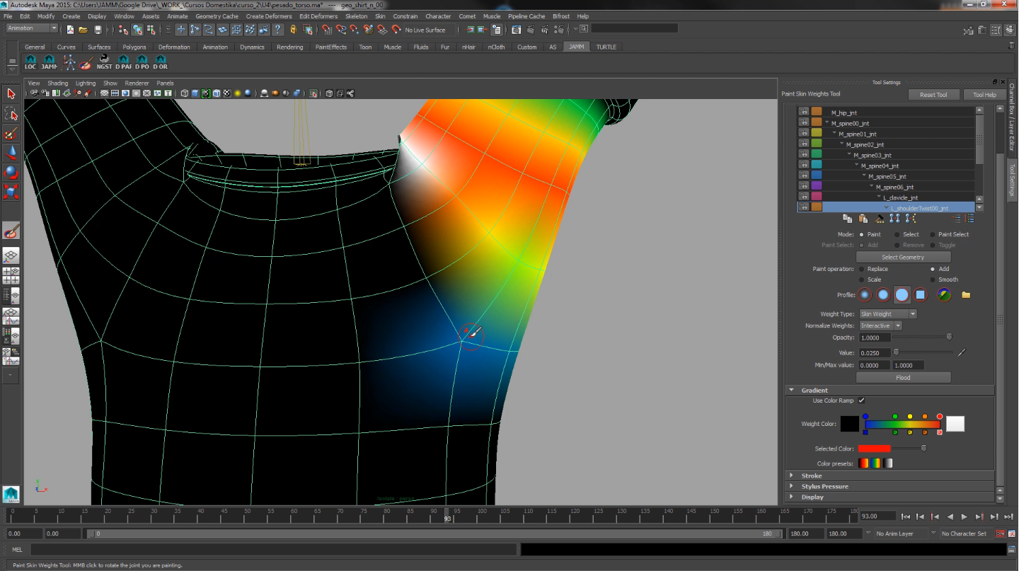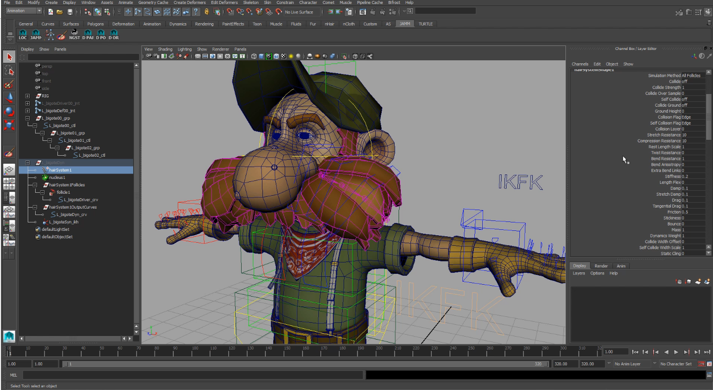 Una vez que tenemos todos los elementos extras conectados a nuestro rig de control podemos empezar a crear los skinClusters a nuestro personaje. En mi curso sobre deformación doy consejos y trucos para hacer mas llevadera la tarea del pesado de un personaje.