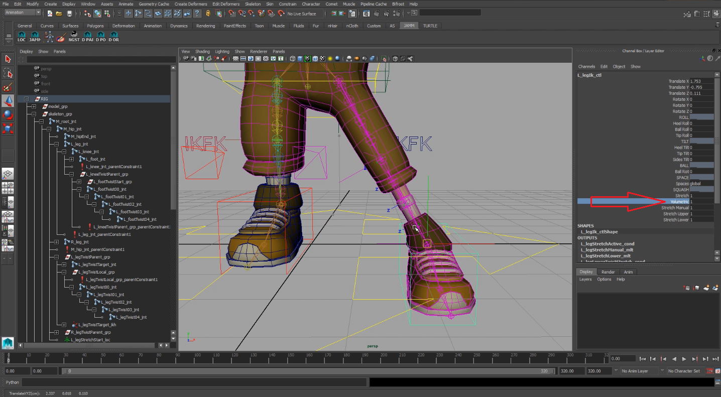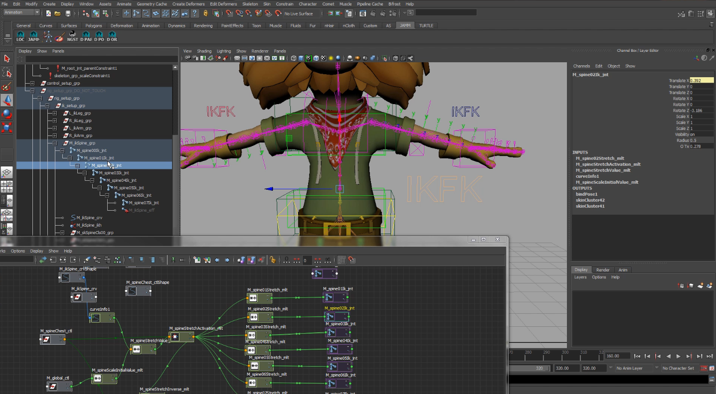 Mediante esta técnica podemos añadir una serie de joints y controles que deformen una área de nuestro personaje, y permitirá simular un comportamiento dinámico con movimientos mas realistas de manera automática.