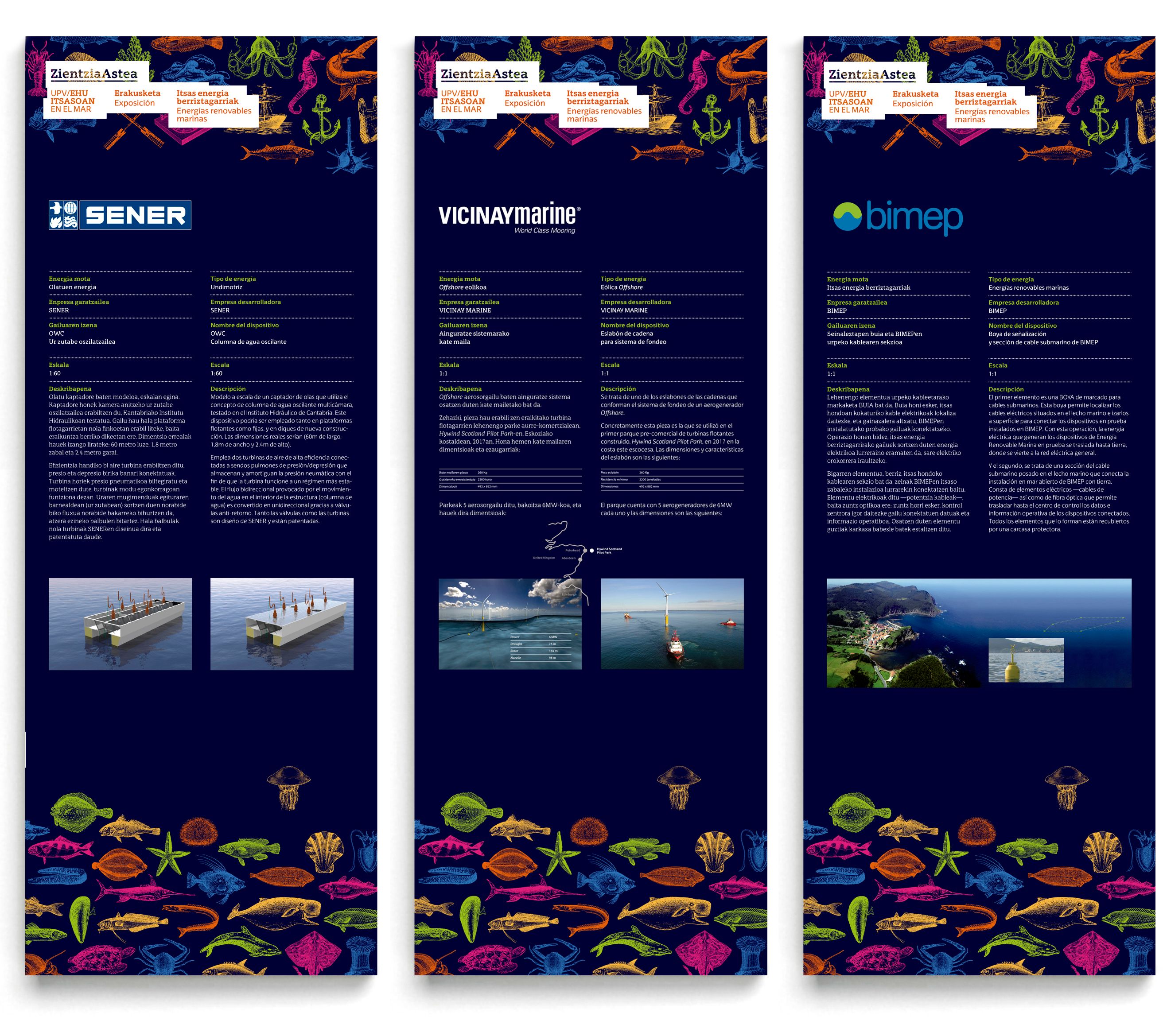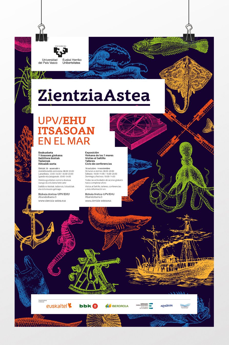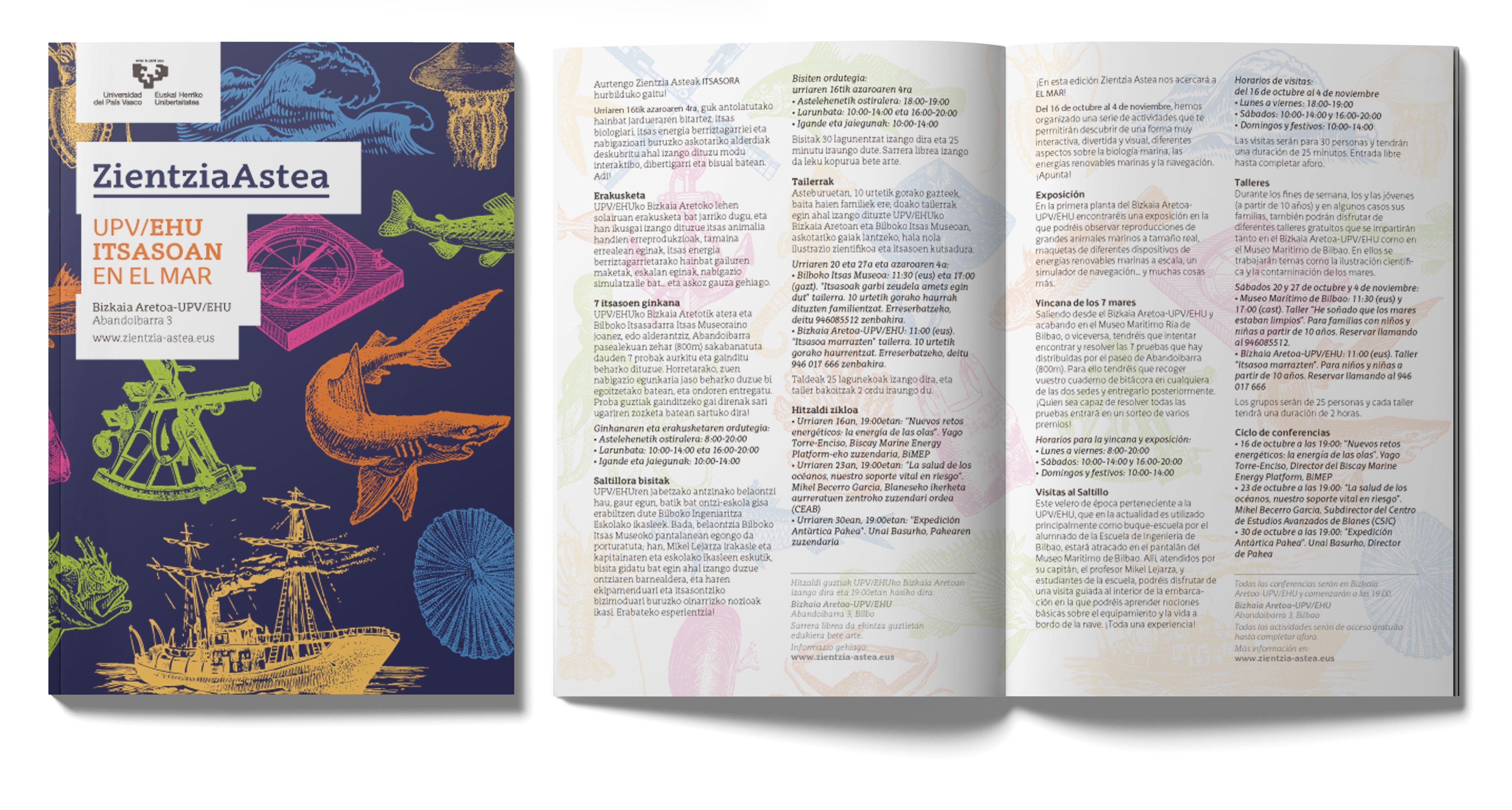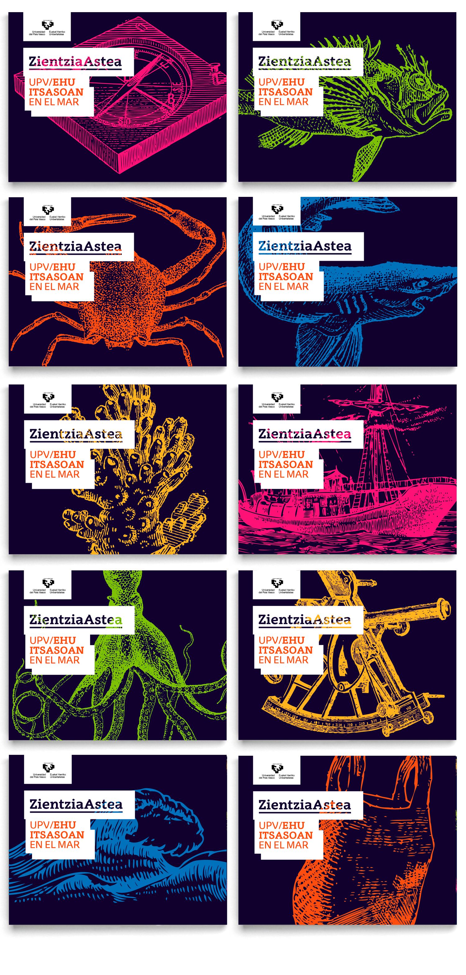 Diseño de soportes didácticos, de información y de promoción del evento «UPV/EHU en el Mar». Con ellos se apoyan una serie de actividades (exposiciones, yincana, visitas guiadas, talleres, conferencias, juegos, etc.) enfocadas hacia la ciudadanía, que pretenden hacer descubrir de una forma muy interactiva y visual, diferentes aspectos sobre la biología marina, las consecuencias de la contaminación en la vida en el mar, las energías renovables marinas y la navegación. Como recurso gráfico evocador del interés por el conocimiento, y la necesidad de su difusión pública, este proyecto se ha apoyado en ilustraciones científicas del libro «Dictionnaire des mots et des choses» de Larive et Fleury, 1895.