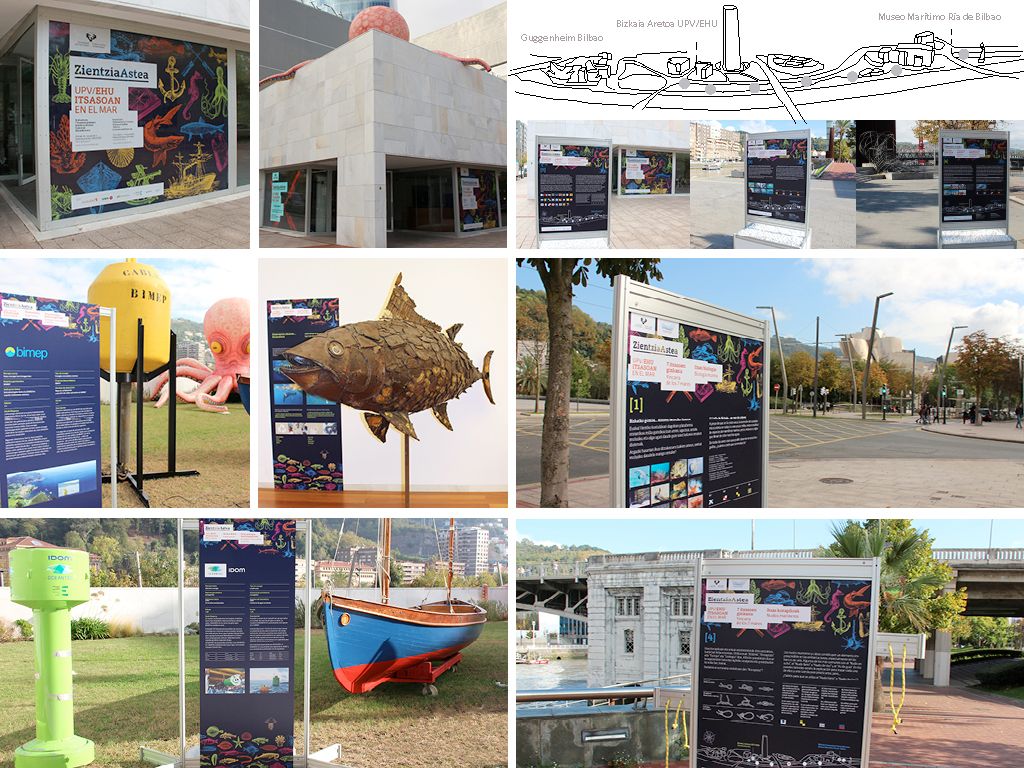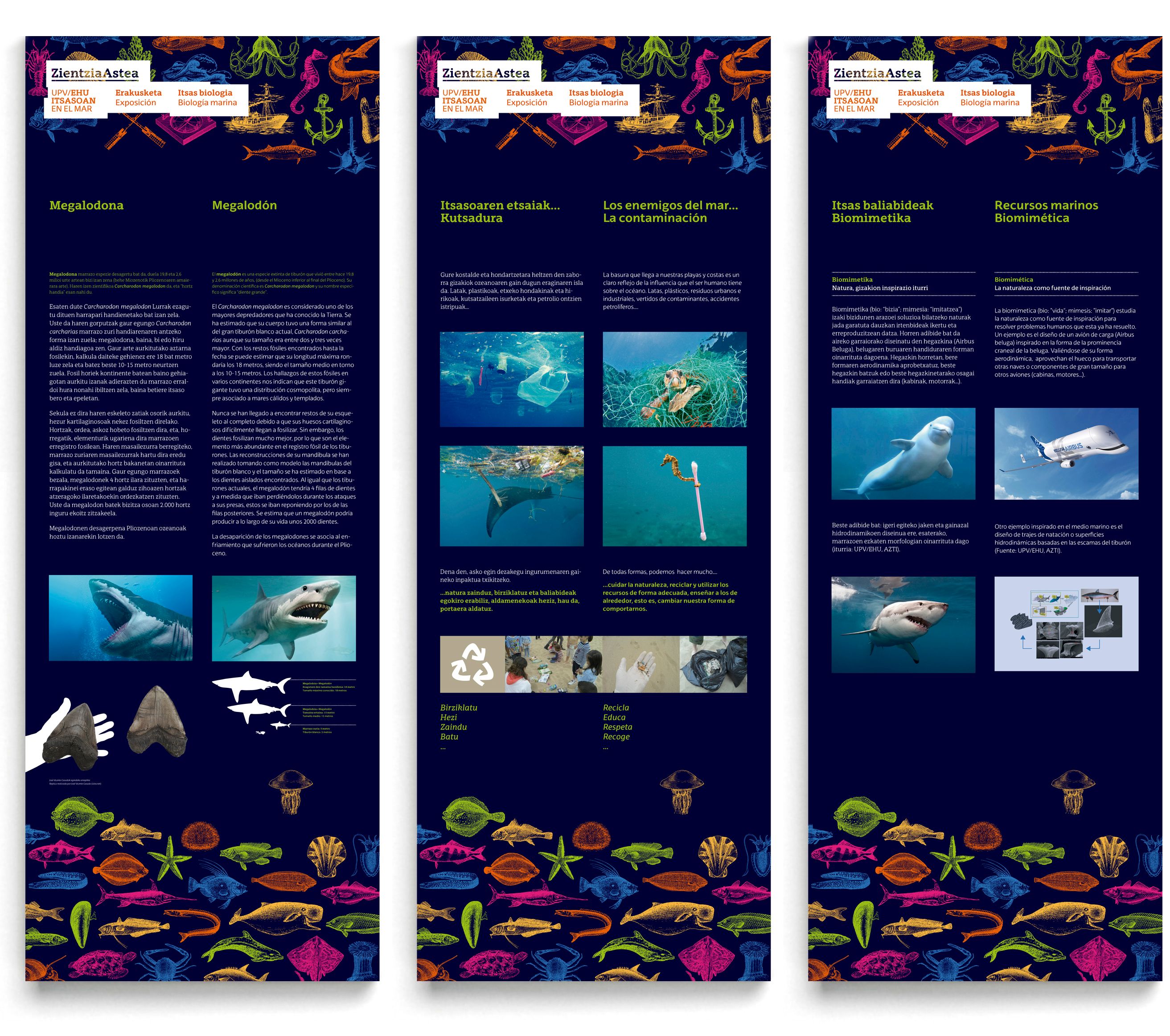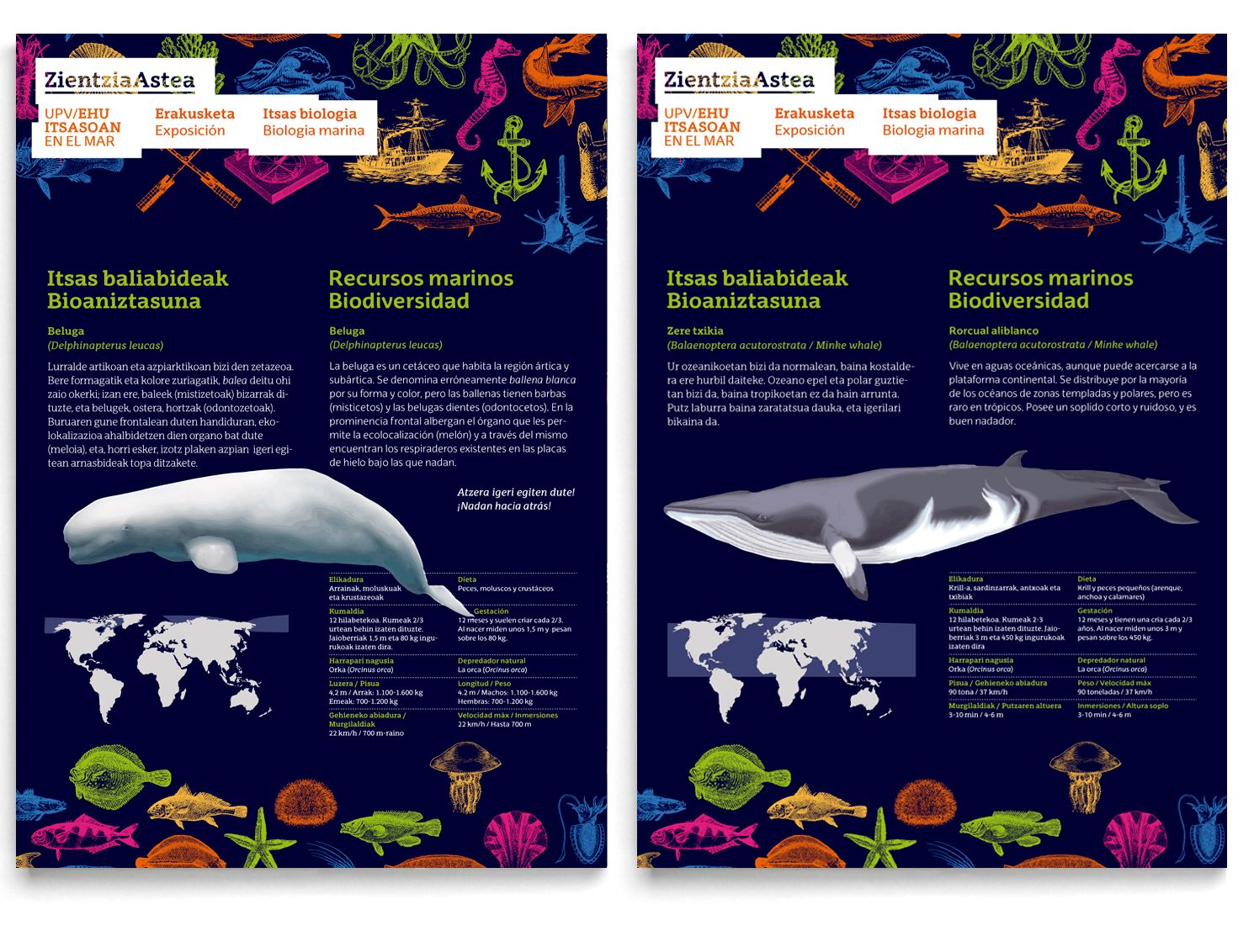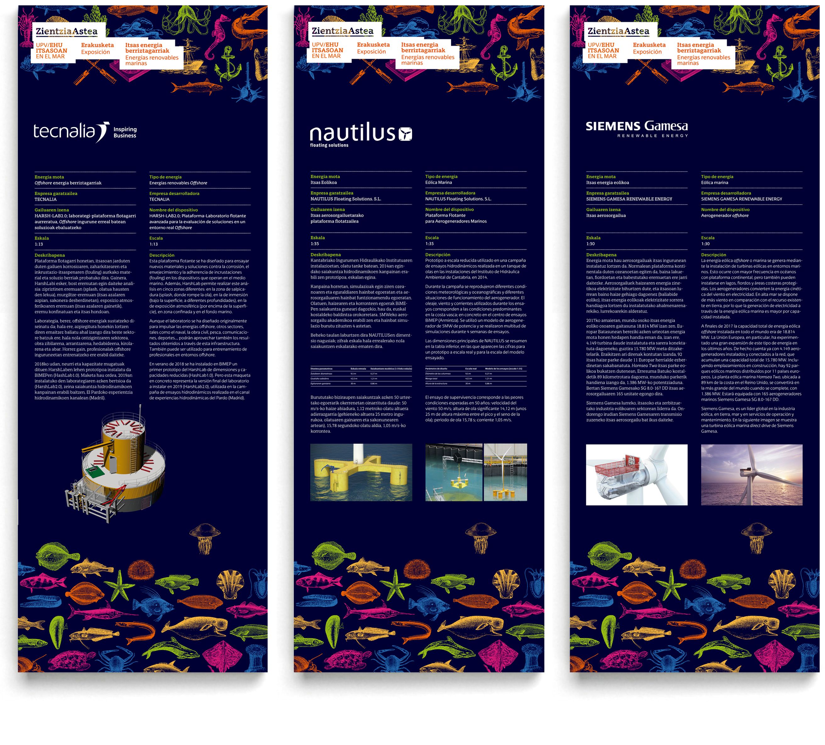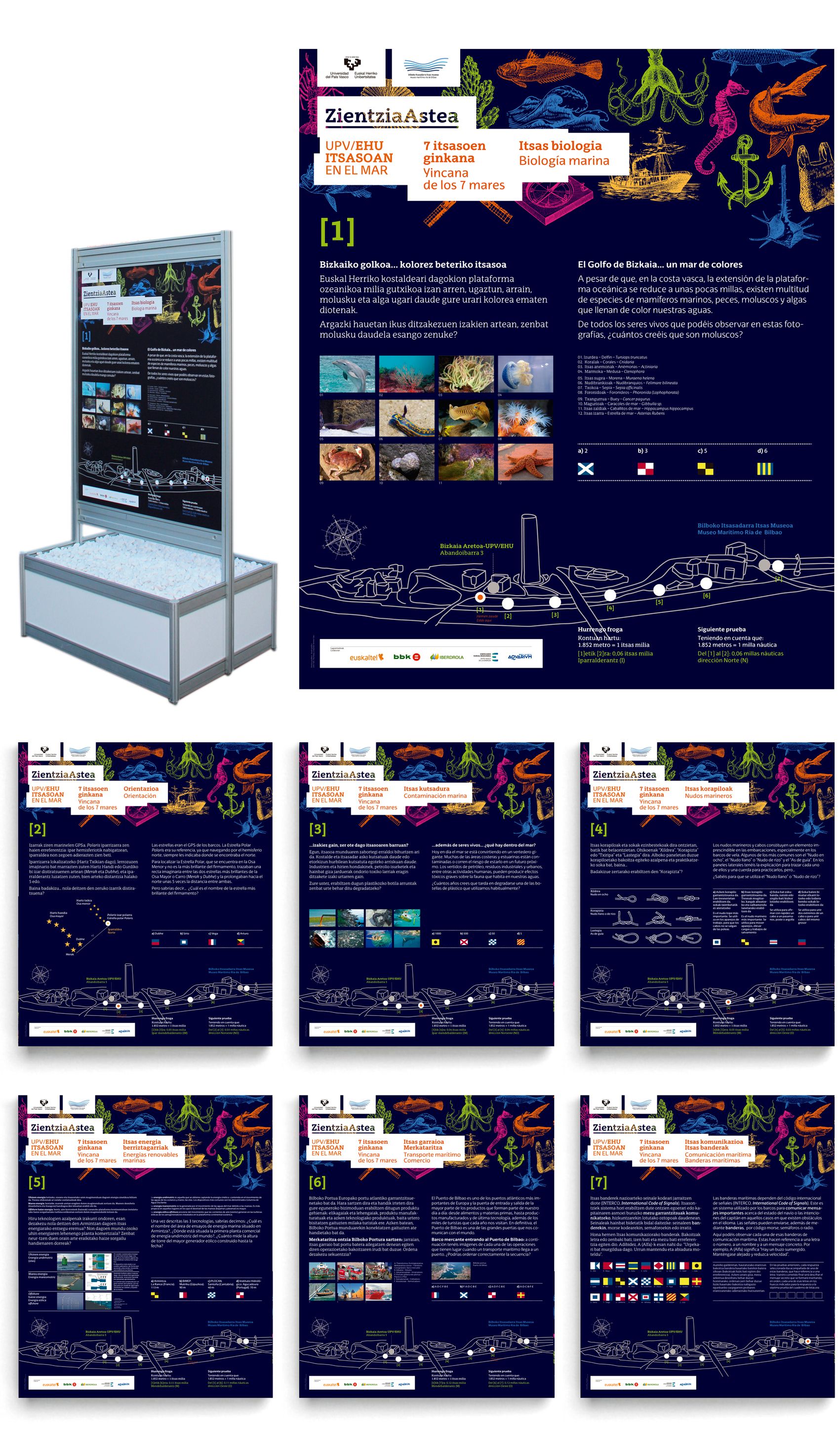 Diseño de soportes didácticos, de información y de promoción del evento «UPV/EHU en el Mar». Con ellos se apoyan una serie de actividades (exposiciones, yincana, visitas guiadas, talleres, conferencias, juegos, etc.) enfocadas hacia la ciudadanía, que pretenden hacer descubrir de una forma muy interactiva y visual, diferentes aspectos sobre la biología marina, las consecuencias de la contaminación en la vida en el mar, las energías renovables marinas y la navegación. Como recurso gráfico evocador del interés por el conocimiento, y la necesidad de su difusión pública, este proyecto se ha apoyado en ilustraciones científicas del libro «Dictionnaire des mots et des choses» de Larive et Fleury, 1895.