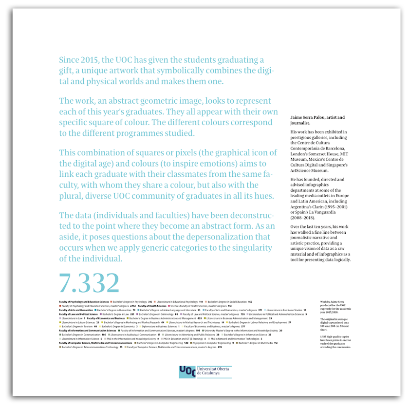 El trabajo representa a los 7.332 graduados del curso 2017-2018. Cada cuadrado corresponde a un graduado y su color al tipo de estudio cursado.