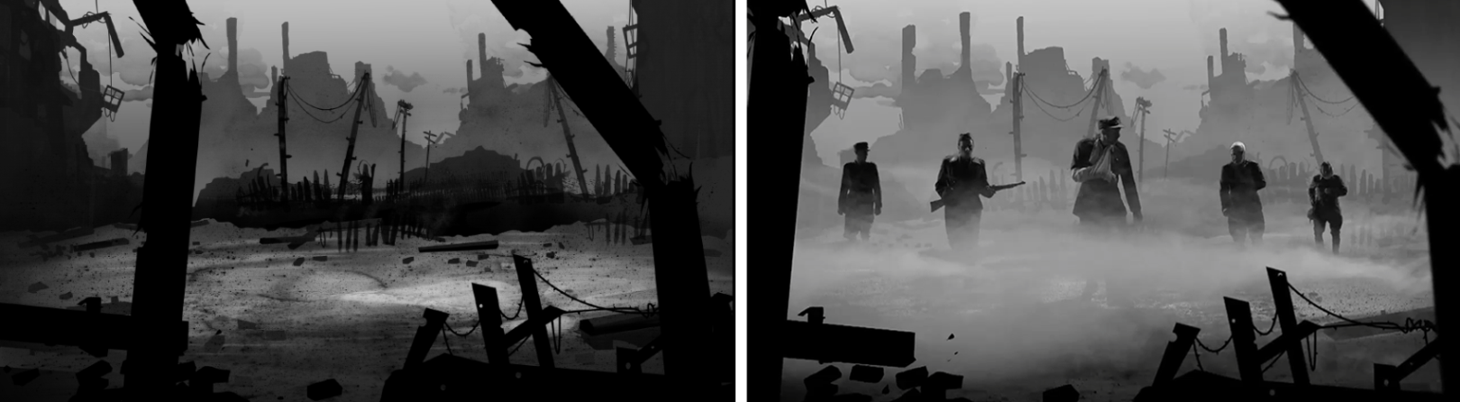 | Ejemplo de una ilustración en capas (izquierda) y una pantalla de una película después de la postproducción (derecha) |