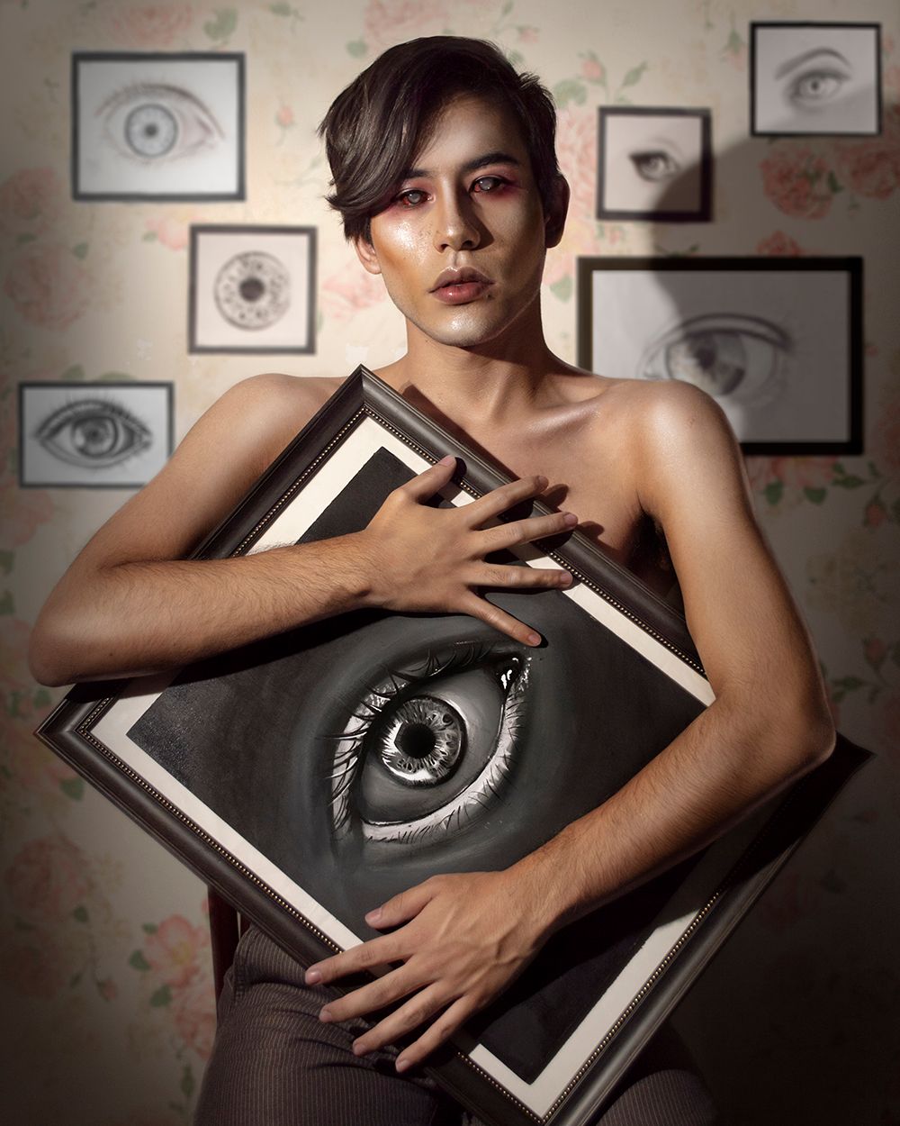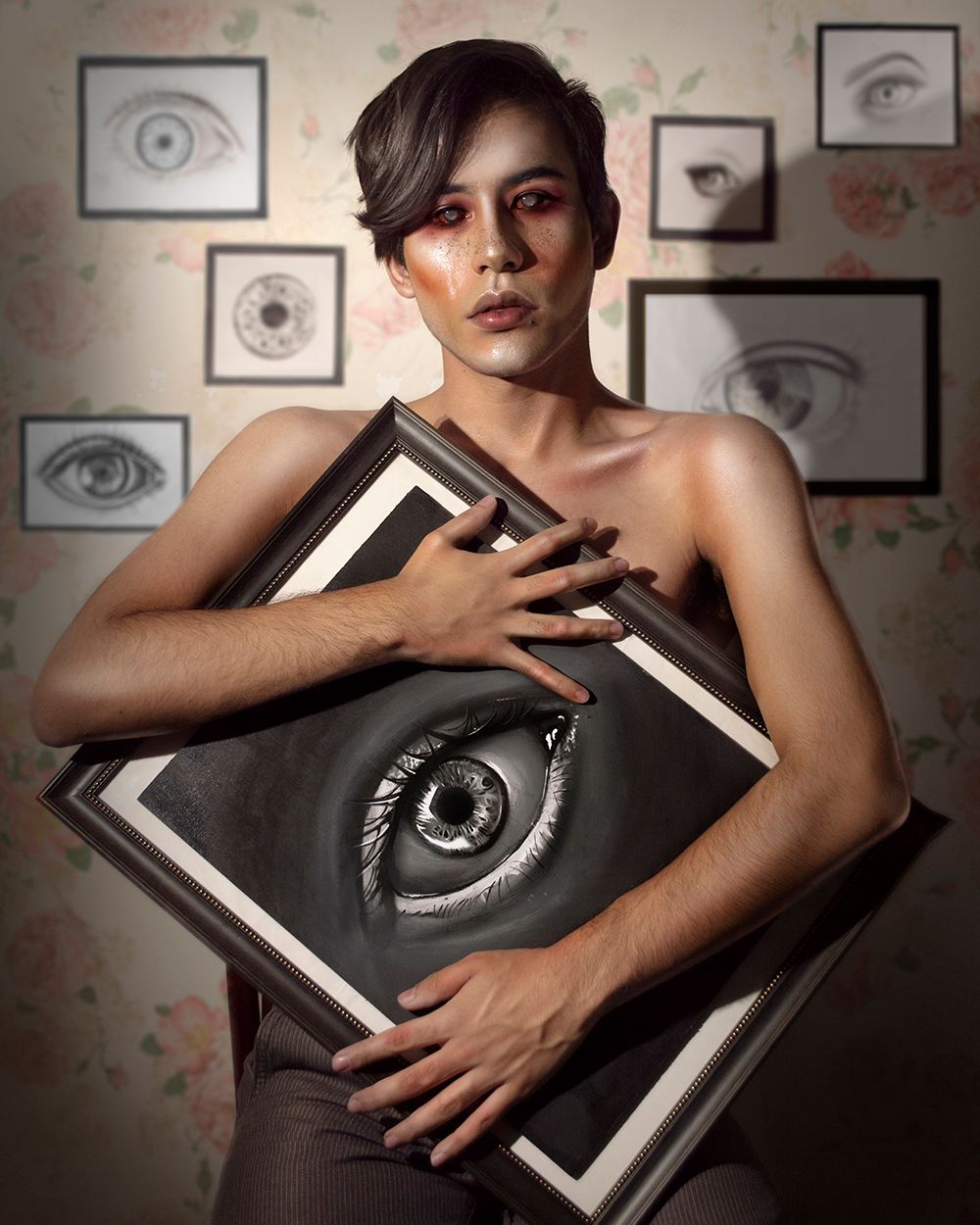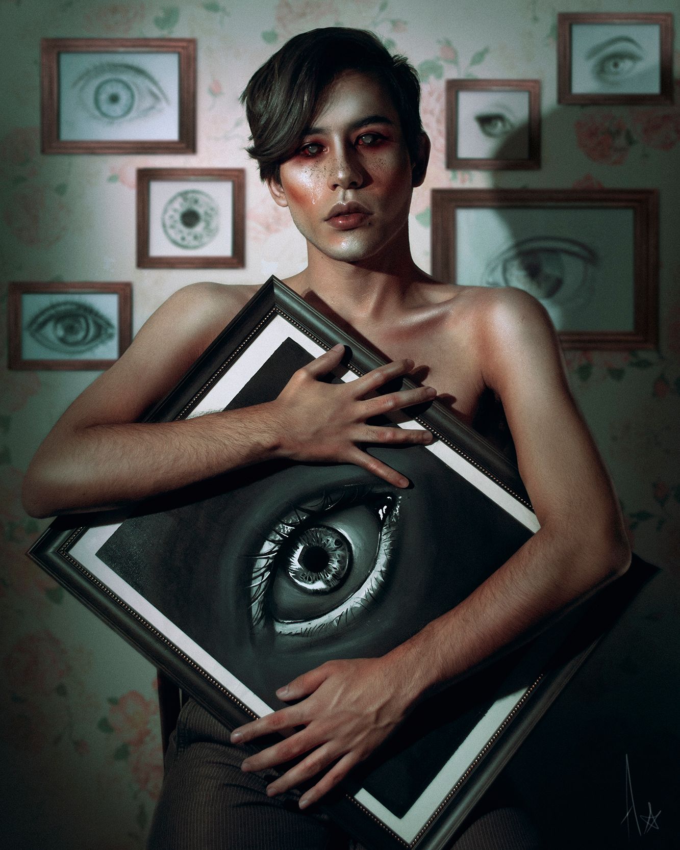 Para iluminar la foto, utilicé una lámpara larga de doble cabeza flexible, con luz cálida. De forma diagonal al modelo (yo). Todo los ojos que aparecen fueron dibujados / pintados por mi.