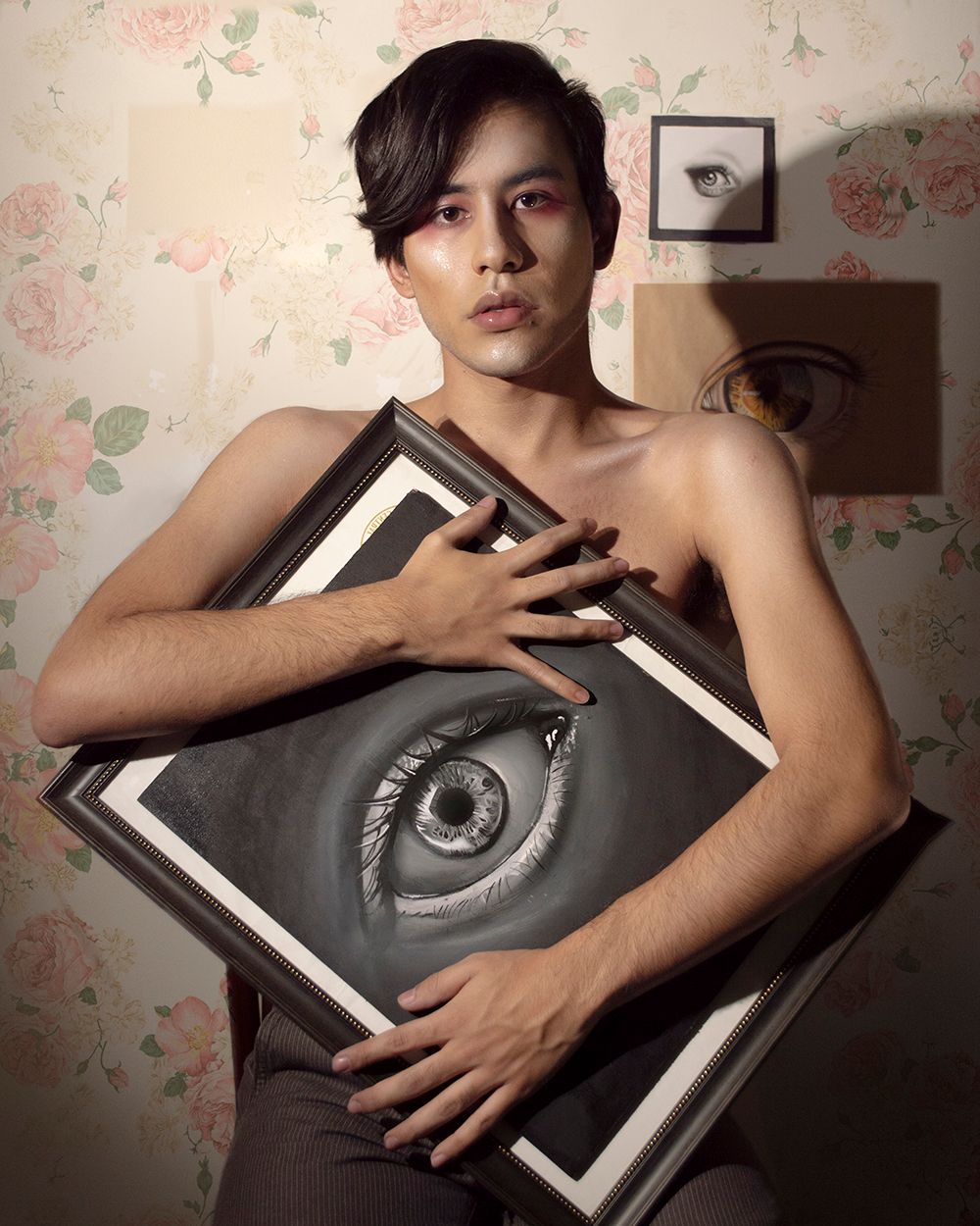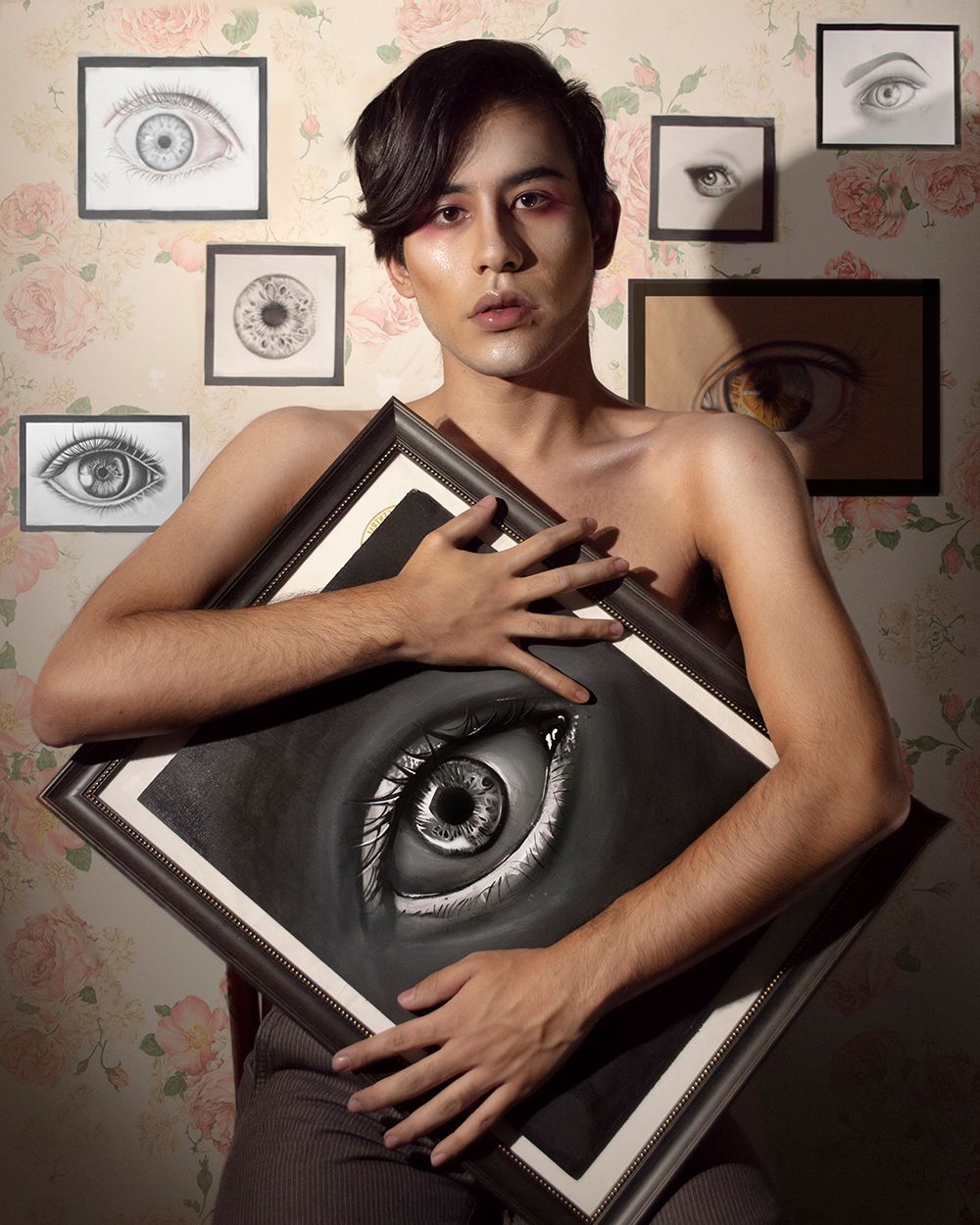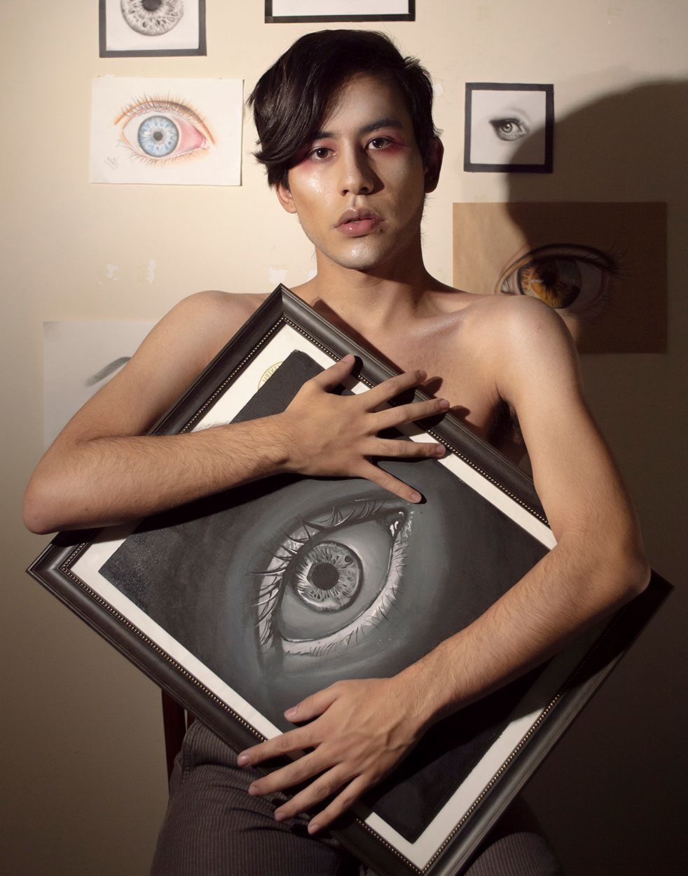 Para iluminar la foto, utilicé una lámpara larga de doble cabeza flexible, con luz cálida. De forma diagonal al modelo (yo). Todo los ojos que aparecen fueron dibujados / pintados por mi.