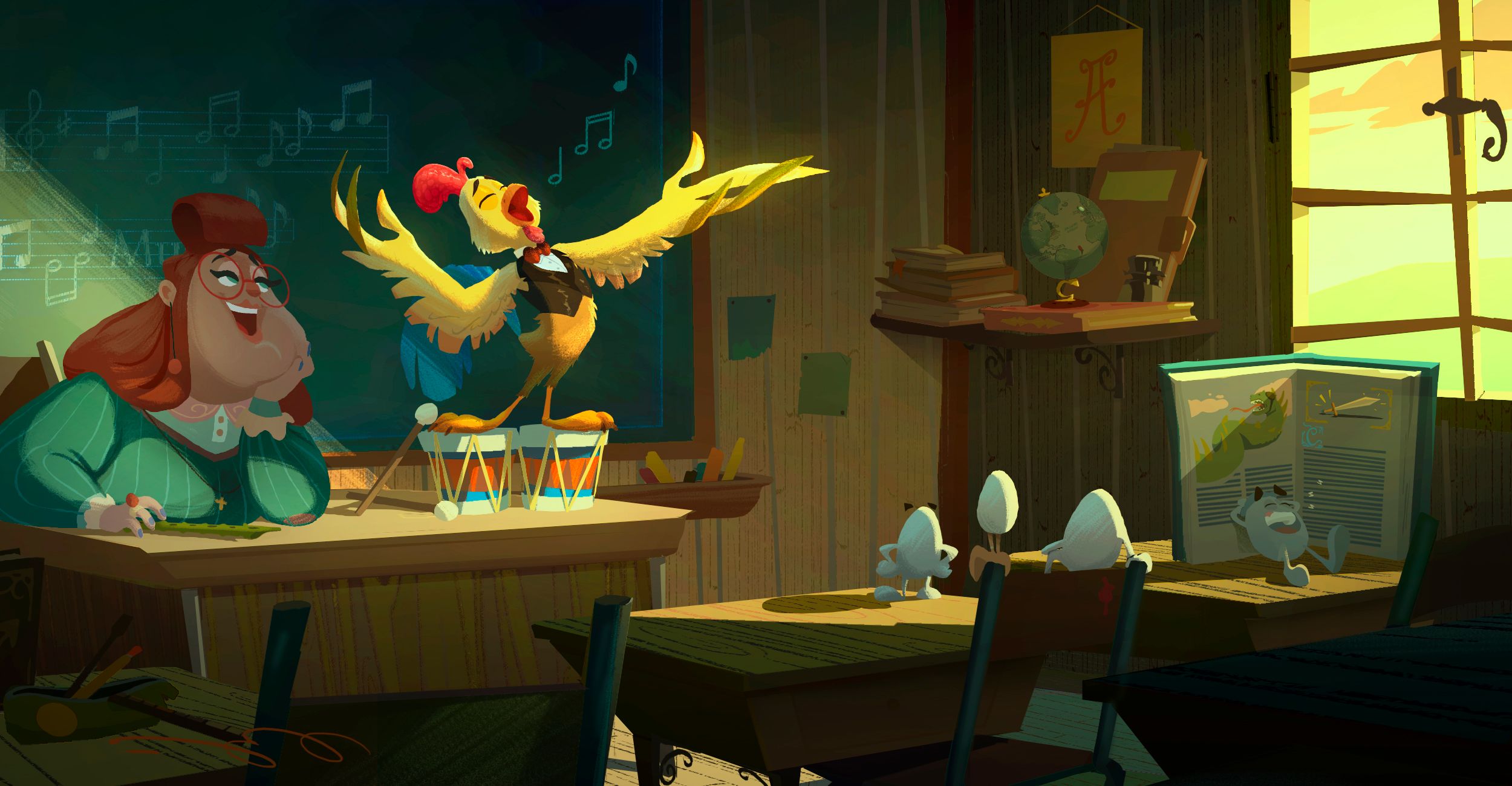 En esta escena, esta cantando frente a un salón de clase donde sus amigos huevos están mucho menos atentos que la propio maestra, quien parece estar encantada por el canto del gallo.