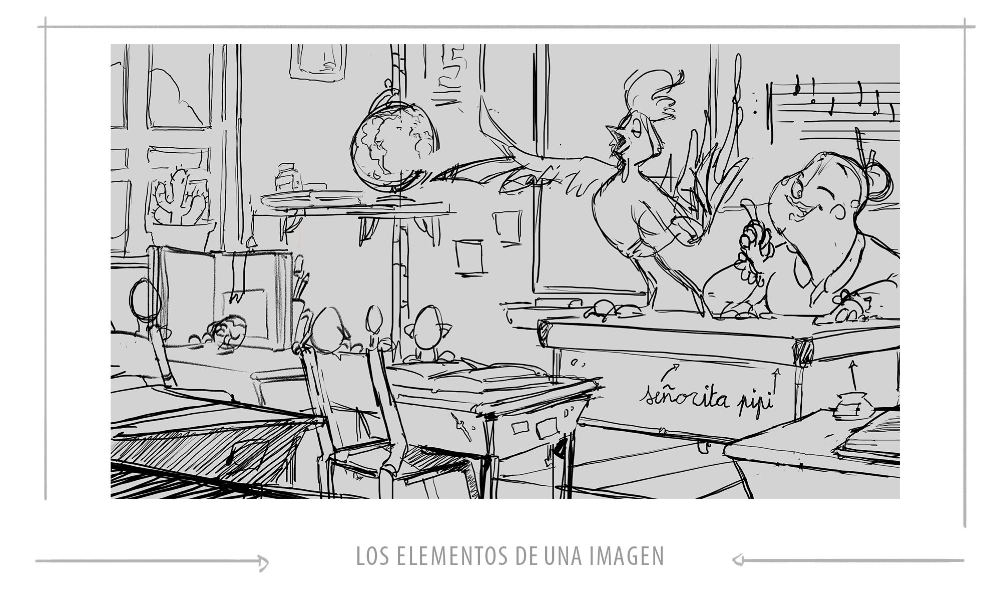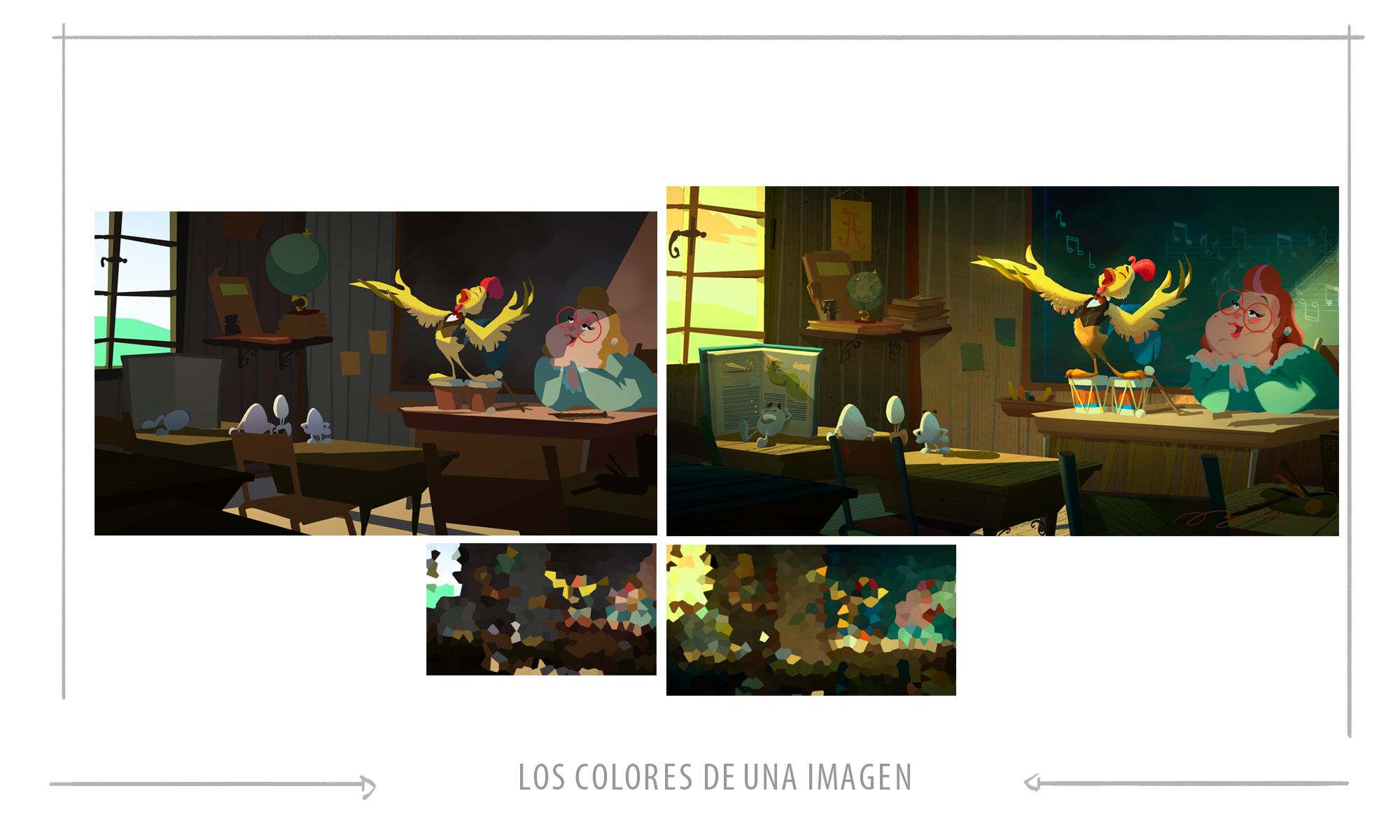 Misma cosa con el color. EL planteamiento inicial ha evolucionado, más no cambiado. Quiero que Toto se sienta como el punto más cálido de la imagen, y que la maestra se mezcle un poco en la armonía general de fríos. Lo que evolucionó es que la escena se fue haciendo más verde para asentirse más homogénea, y dar más la sensación de fin del día, cuando las sombras son entre azules y verdes.