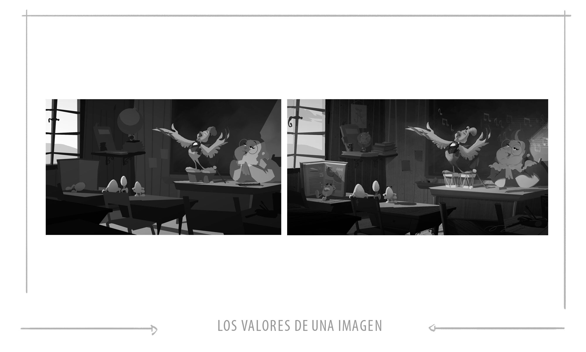 Aquí una simplificación de los valores a diferentes etapas. Podemos que el planteamiento inicial se respeto hasta el final. Mi plan era desde un inicio que Toto resaltara sobre el pizarron oscuro, y que la maestra estuviera un poco en su sombra.