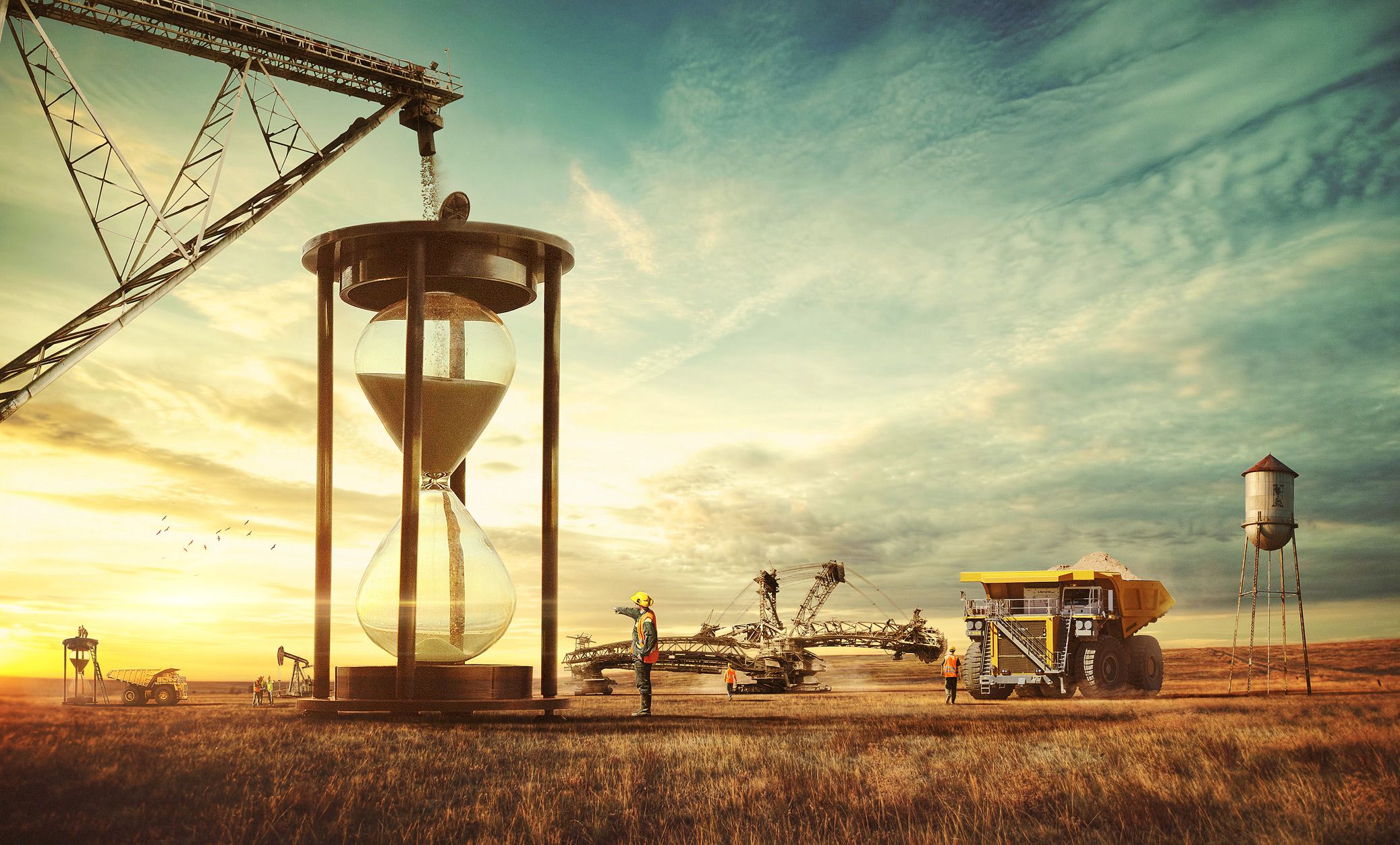 Ejercicio de fotomontaje surrealistaFotografías de stock utilizadasEmpezando!Integración preliminar del reloj principal + corrección de transparencia del vidrio para empatar con fondo.Agregar más elementos, máquina excavadora y tanque de agua.Elementos adicionales, bomba, alimentador de arena, etc.Incorporacion de más trabajadores y camiones.Retoques finales de integración y coloración.Fotomontaje terminado.