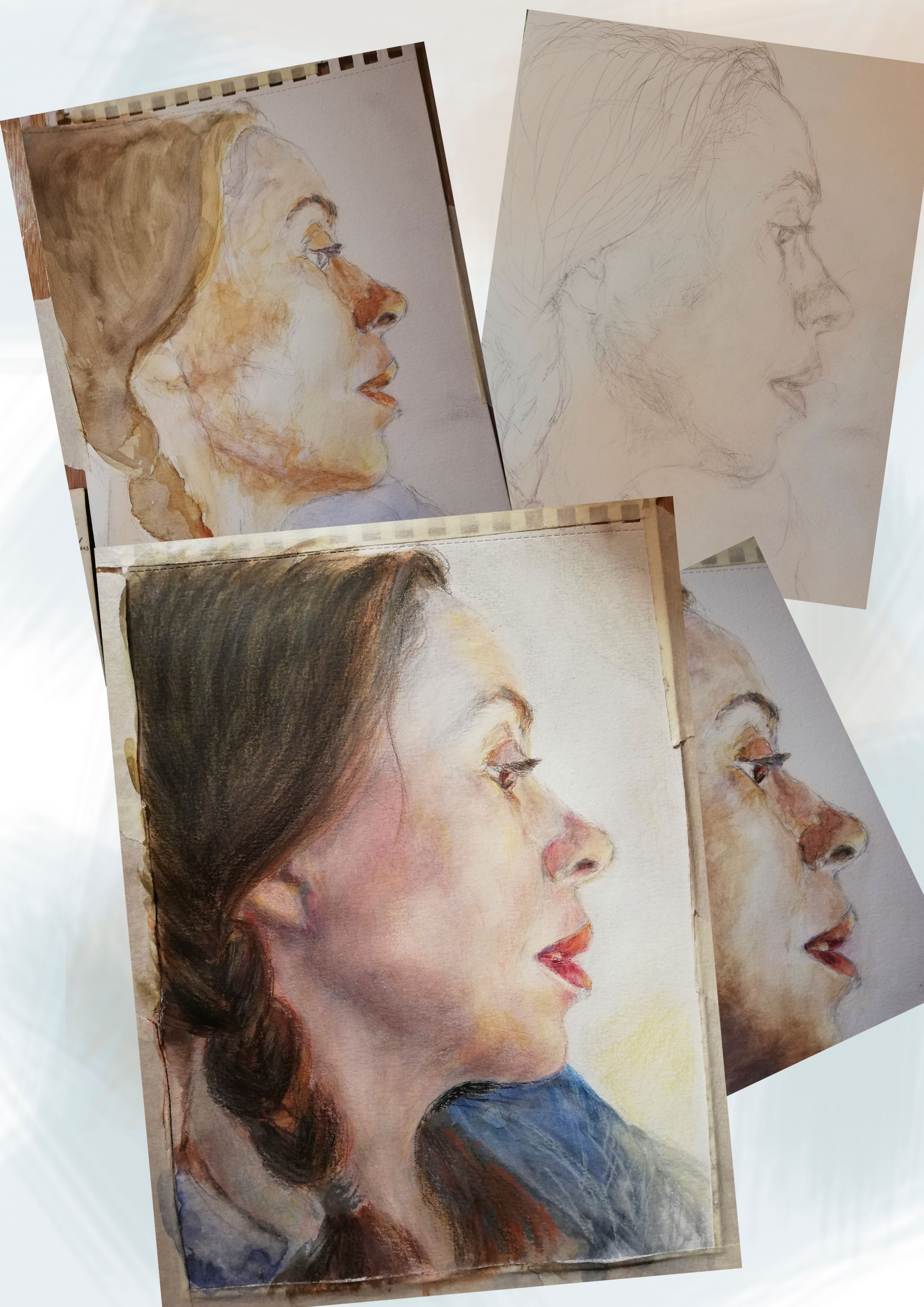 Muestro la progresión del boceto a lápiz, seguido por una base de acuarela y rematado con pastel y lápices de colores.