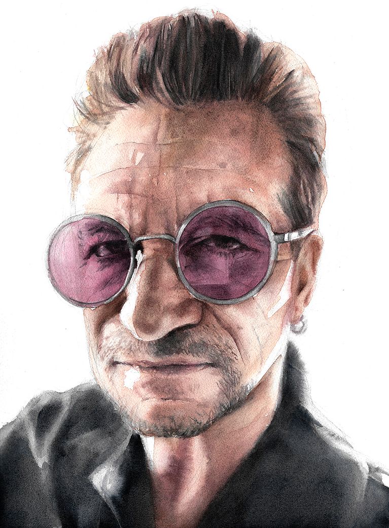 De nuevo, busqué efectos de enfoque y desenfoque en el resultado final como hice en la de Benicio, y también un aspecto terroso en la piel para darle más textura. La luz trasera de la fotografía en la que me basé me sirvió para enfatizar el fondo blanco y acentuar los rasgos de Bono.