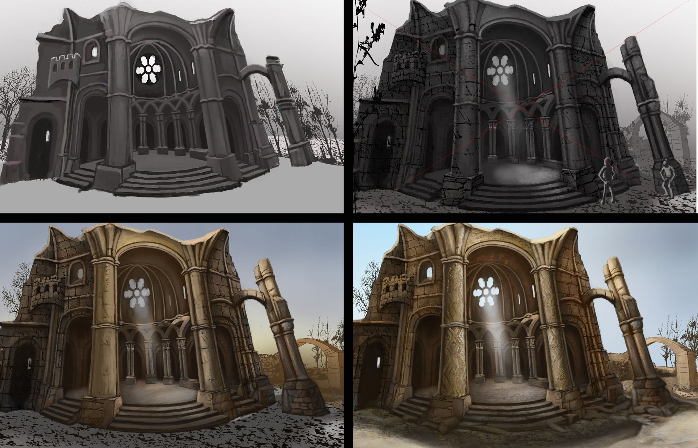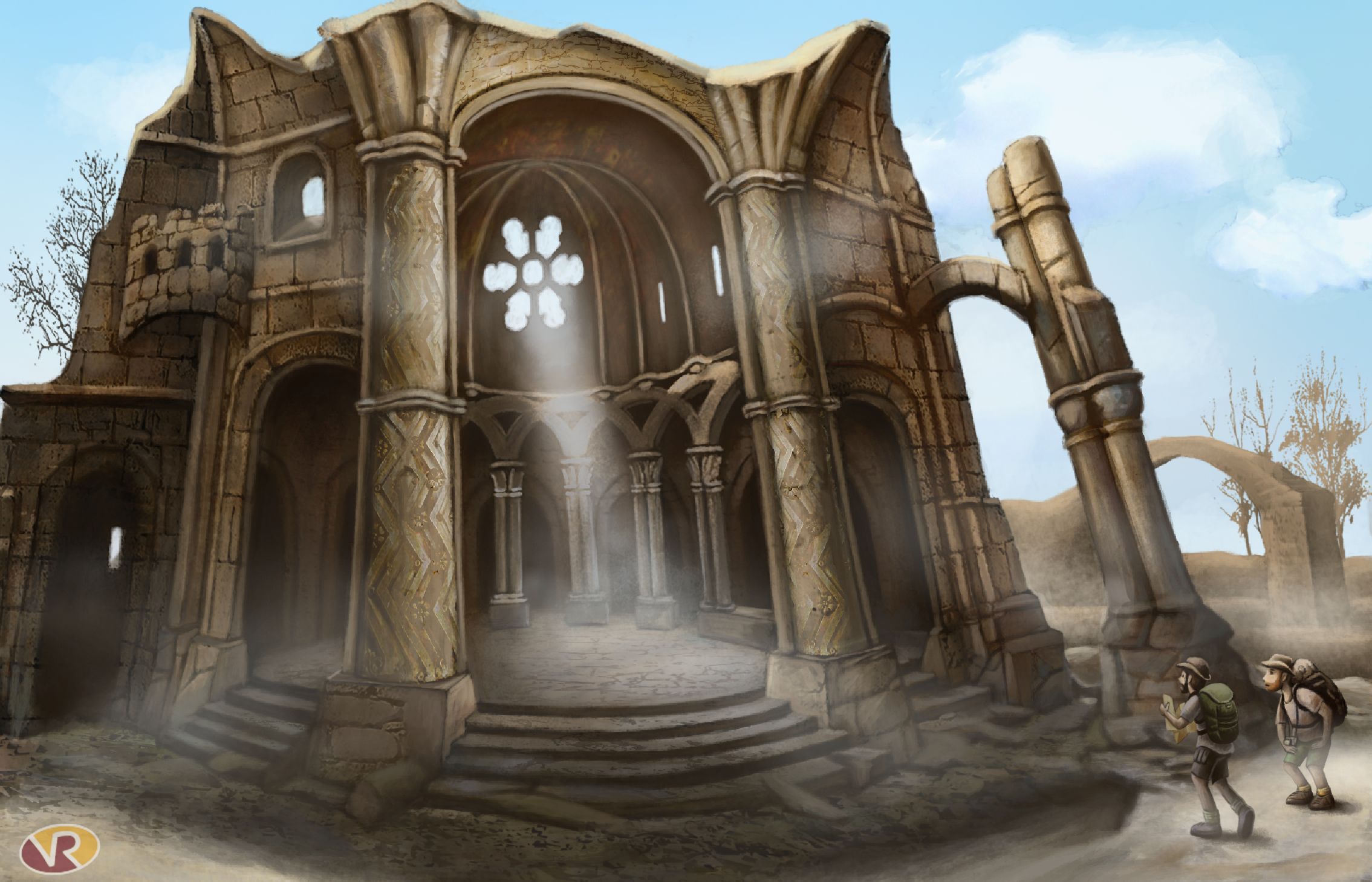 Decidí llevar el proyecto a mi tierra y cambiar el desierto por la estepa castellana y el templo por unas ruinas que recordaran los monasterios e iglesias románicas que hay por la zona así como convertir a los personajes en una mezcla de turistas y aventureros a lo Indiana Jones.