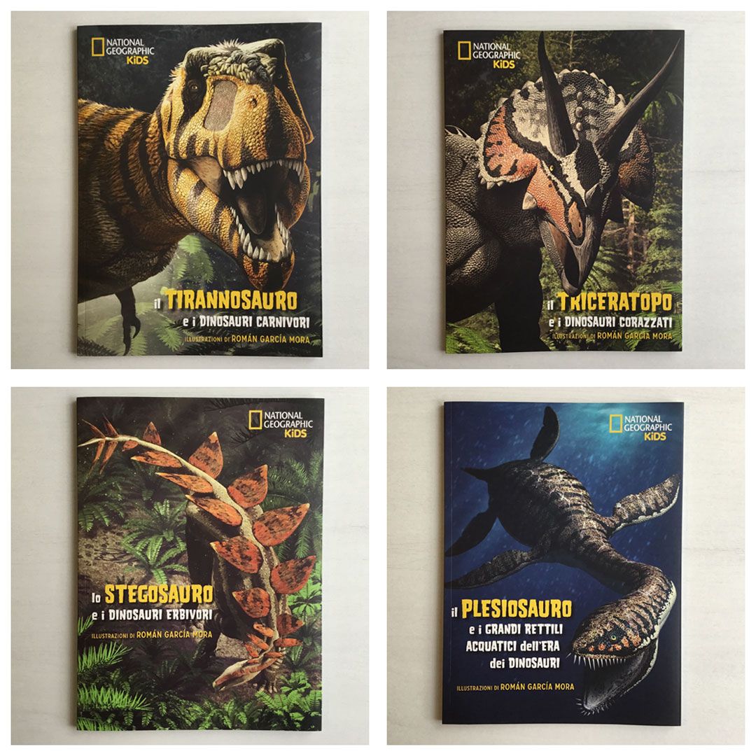 Los cuatro títulos de la colección Tyrannosaurus, Triceratops, Stegosaurus y Plesiosaurus.Apatosaurus ajax ramoneando en la vegetación de un bosque del Jurásico.Amargasaurus cazaui.Tyrannosaurus rex.Reconstrucción esquelética de Tyrannosaurus rex.Giganotosaurus caroliniMosasaurus hoffmani.Ichthyosaurus intermediusOurannosaurus nigeriensis.Reconstrucción esquelética de Stegosaurus ungulatus.Triceratops horridus, imagen de portada.Triceratops horridusEscena con Velociraptor mongoliensis y Protoceratops andrewsi.Yutyrannus hualiEscena con Tyrannosaurus rex y Triceratops horridus en formación de defensa.