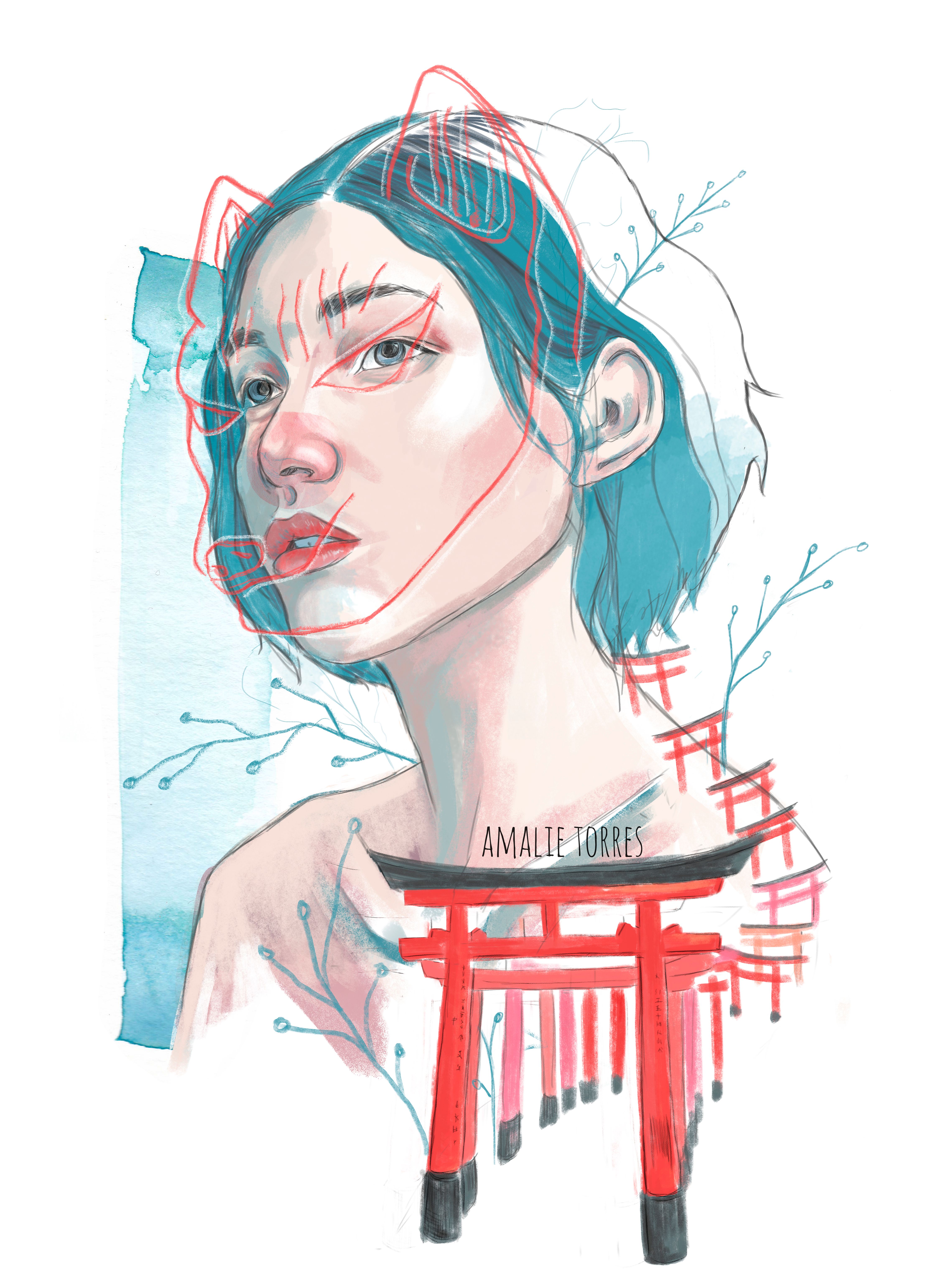 Primeras ilustraciones de una serie inspirada en mi viaje a Kyoto. Ilustración digital, realizadas con Photoshop.