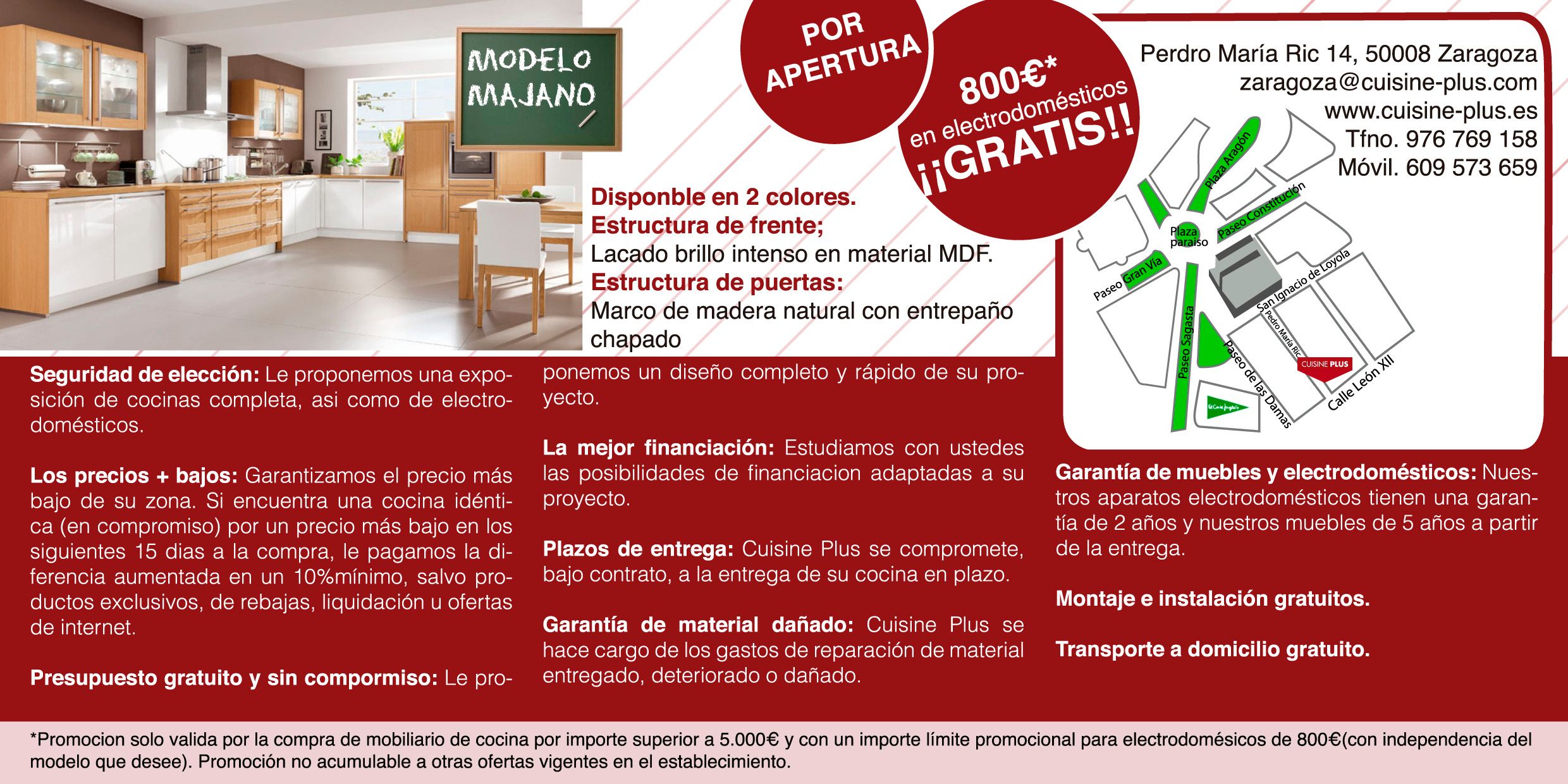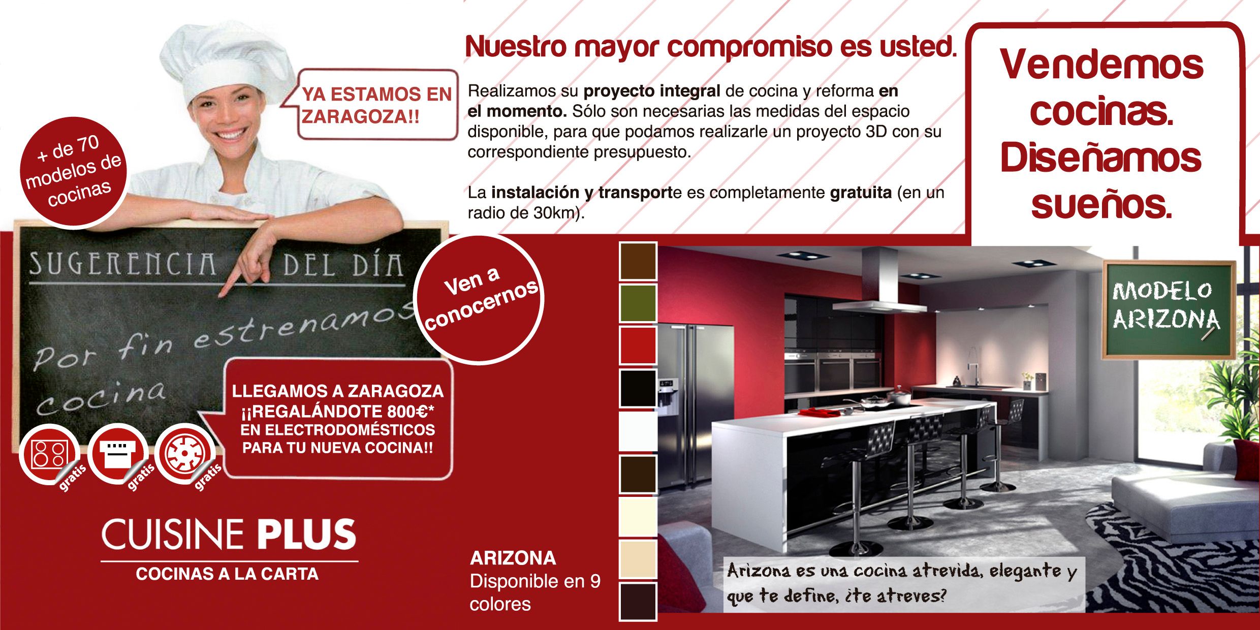 Flyer promocional para la innauguración de Cuisine Plus Zaragoza. Franquicia de la empresa francesa de diseño y venta de cocinas.