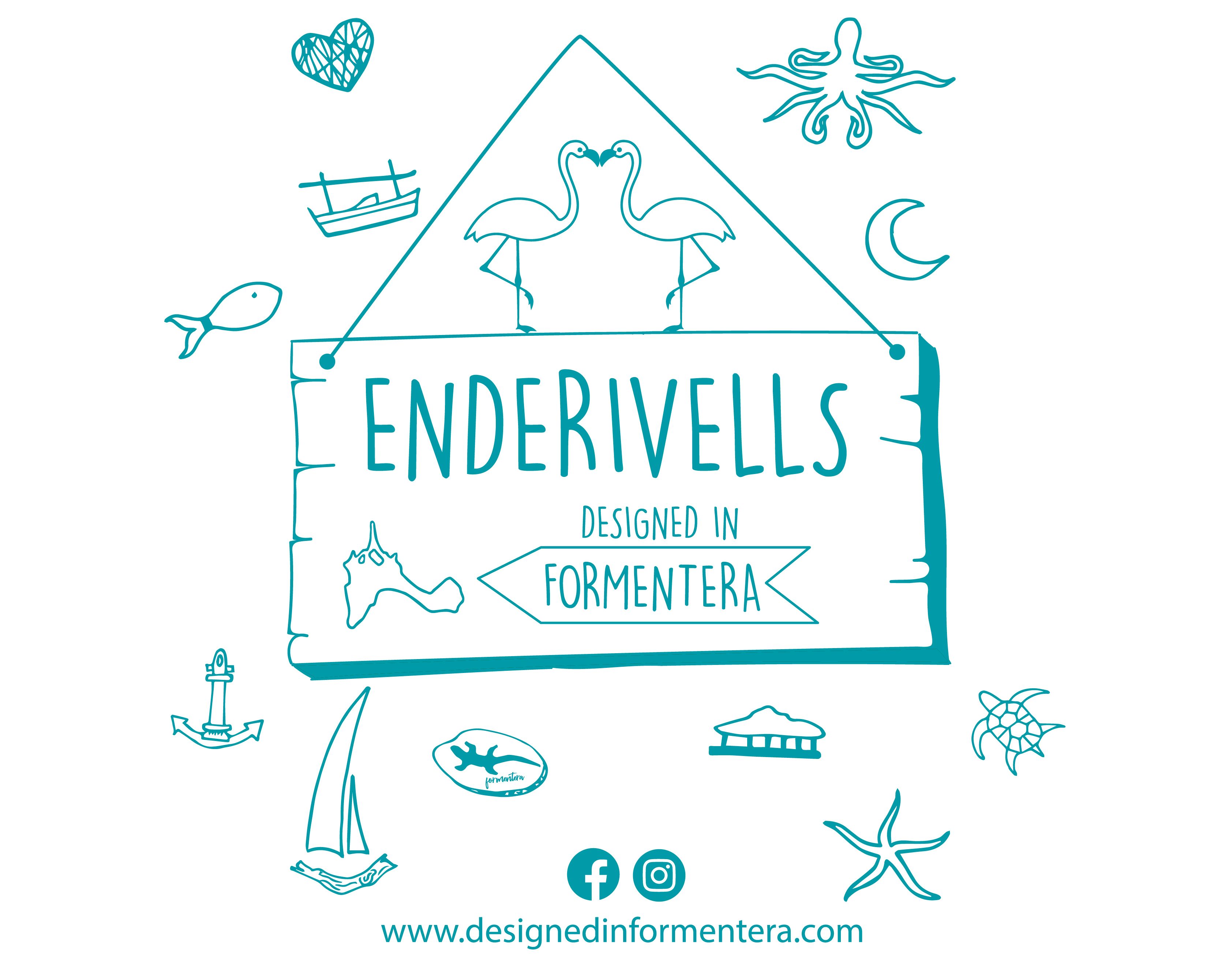 Enderivells es una tienda de artesanía en Formentera. Donde los dueños hacen imanes, llaveros, cuadros y más cositas de souvenirs. Me pidieron el logotipo con su idea de que tuviese la forma de unos de los carteles que tienen mensajes y hacen de madera para colgar. Con la palabra "enderivells" que es típica de Mallorca. Así como el diseño de las bolas de algodón y unos sobres de papel reciclado con os dibujos de las cositas que más venden.