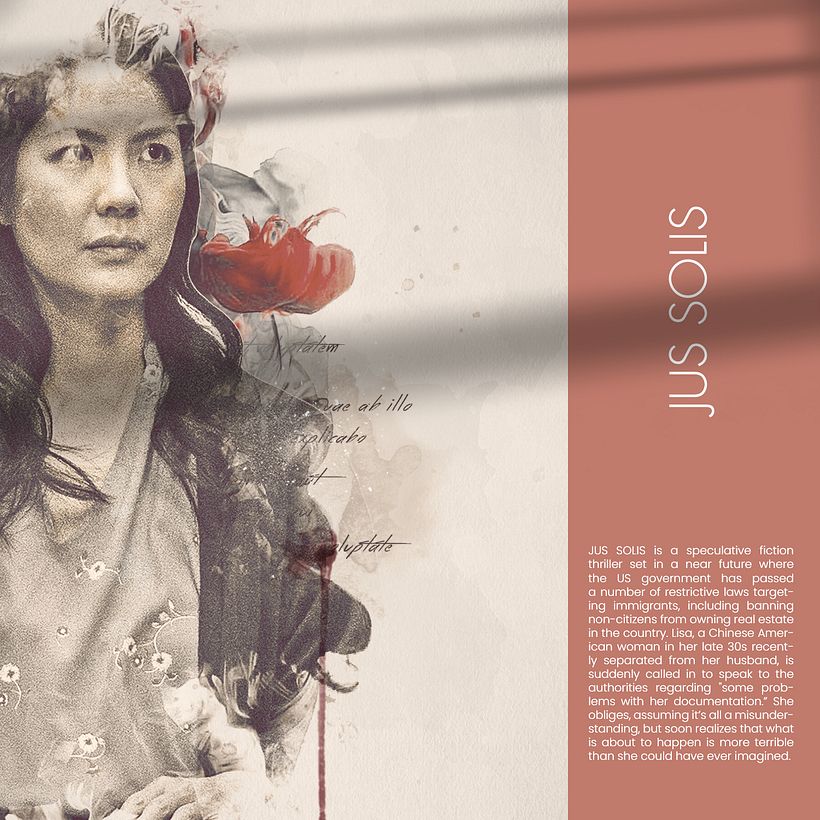 JUS SOLIS is a speculative fiction thriller set in a near future where the US government has passed a number of restrictive laws targeting immigrants, including banning non-citizens from owning real estate in the country. Lisa, a Chinese American woman in her late 30s recently separated from her husband, is suddenly called in to speak to the authorities regarding "some problems with her documentation.” She obliges, assuming it’s all a misunderstanding, but soon realizes that what is about to happen is more terrible than she could have ever imagined.