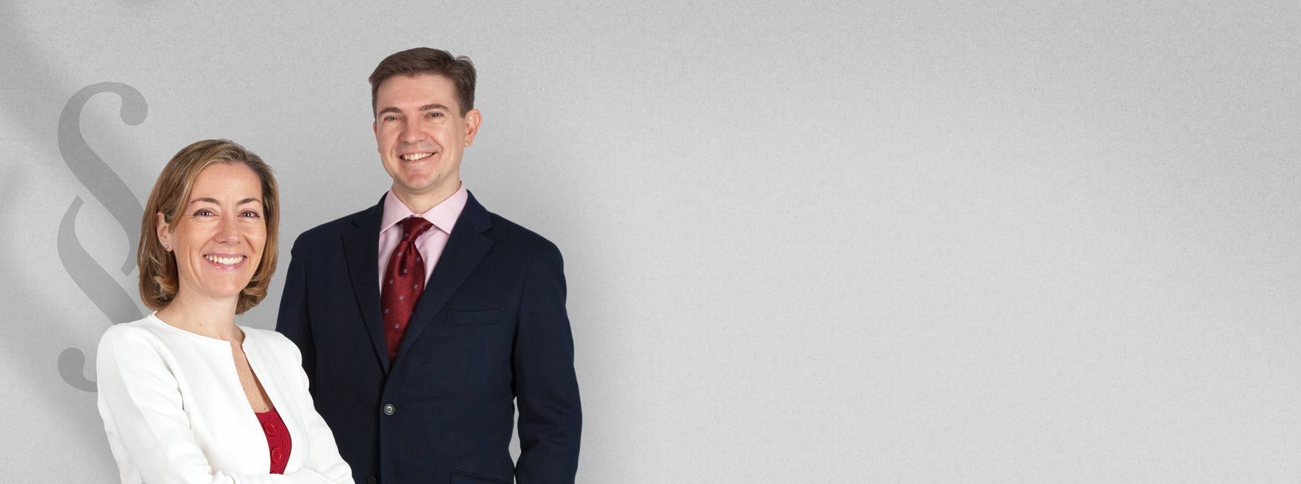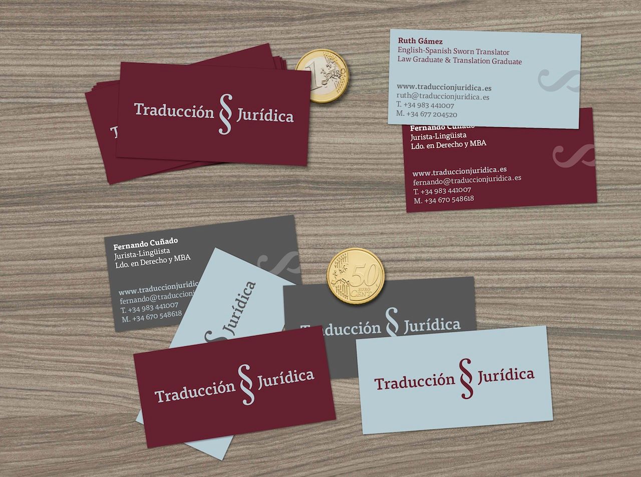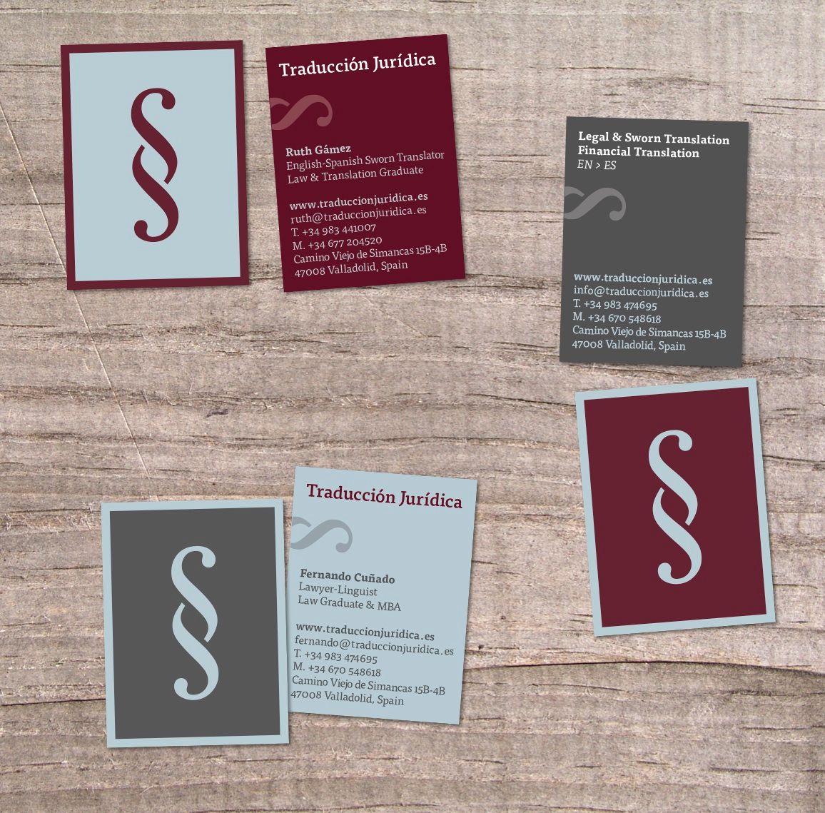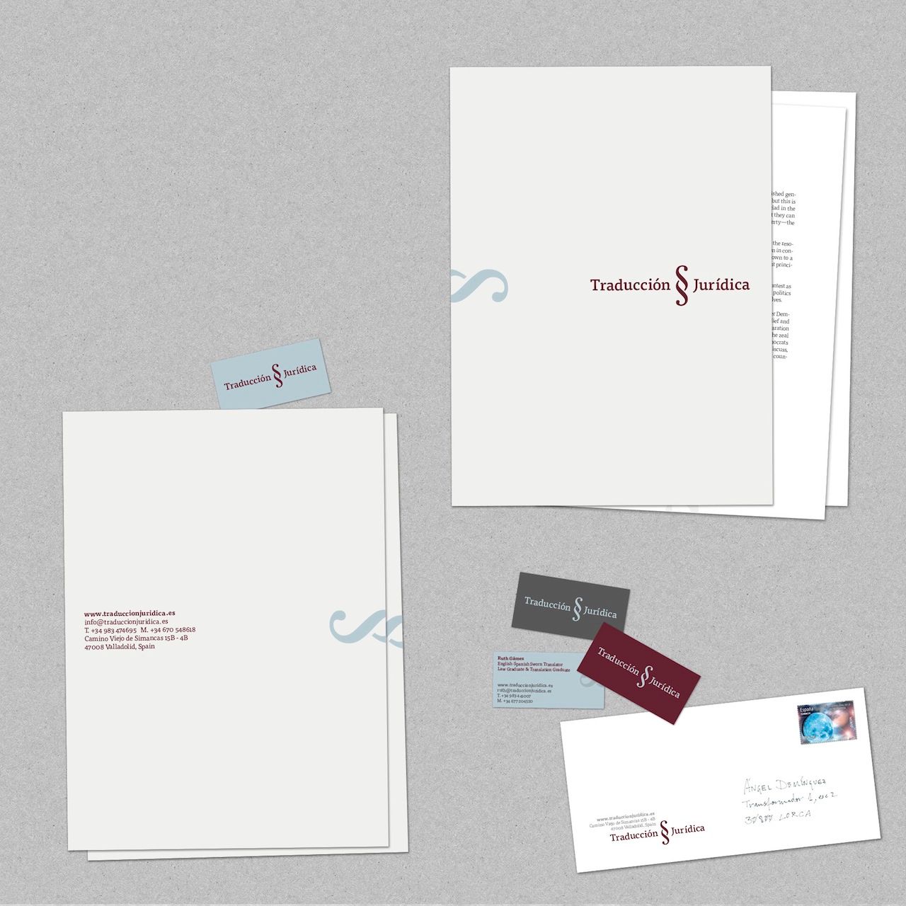 Corporate identity, stationery, and web banners for specialized legal translators Fernando Cuñado and Ruth Gámez, who offer their services under the brand “Traducción Jurídica” (Spanish for “legal translation”).