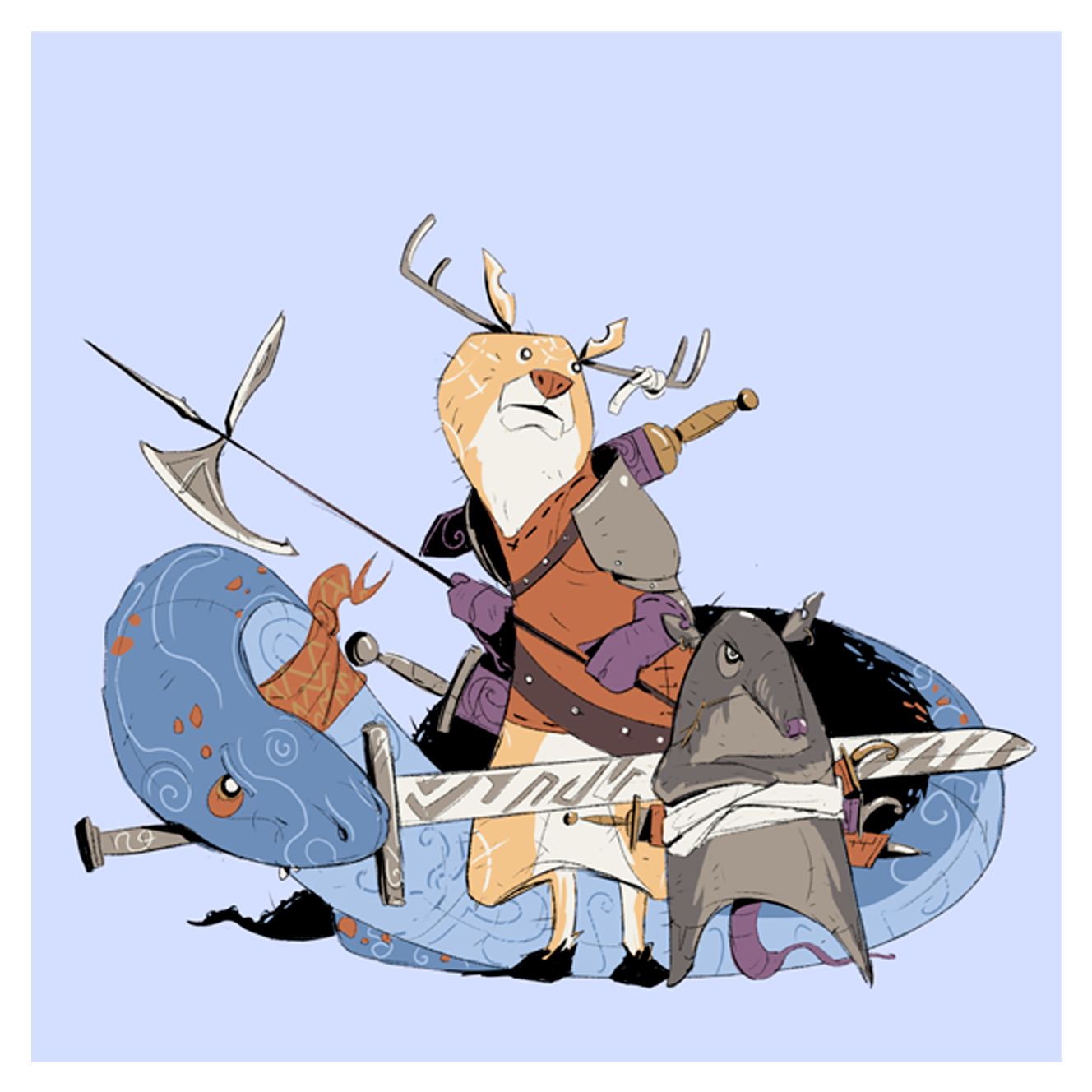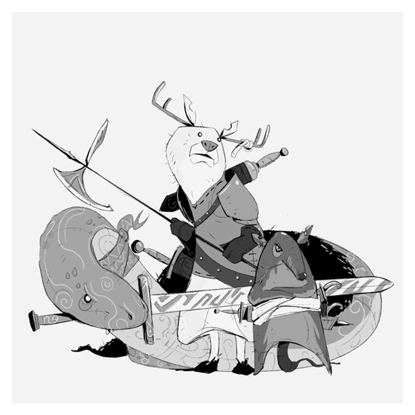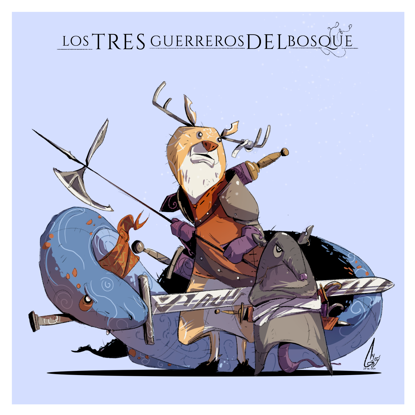 Pieza finalde las cosas mas interesantes del curso fue la simplificación de las formas y el buscar en ellas a personajes desconocidos. La añadidura de detalles después de elegir los conceptos de la lista magnifica de Patricio.Me cuesta ser tan sintético como lo es patricio, con solo unos trazos ya cuenta mucho. Me gusta añadir muchos detalles. Con ayuda de los consejos, recursos y referentes dados por patricio creo que fue la etapa que le dio el estilo.Tenia muchas zonas por separado así que añadir más grises de los aconsejas inicialmente . Intenté limitar la paleta de los colores lo mas que pude y fui añadiendo detalles con los que ya tenia en cada personaje. Y esta es la propuesta final, después de haber añadido algunas sombras y reflejos.