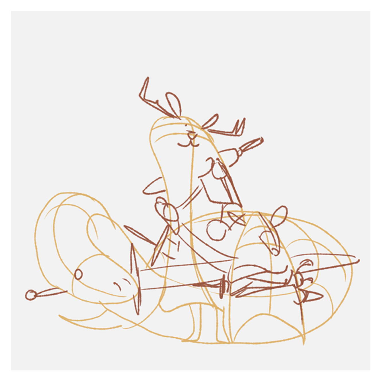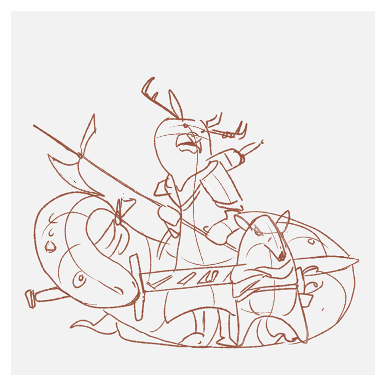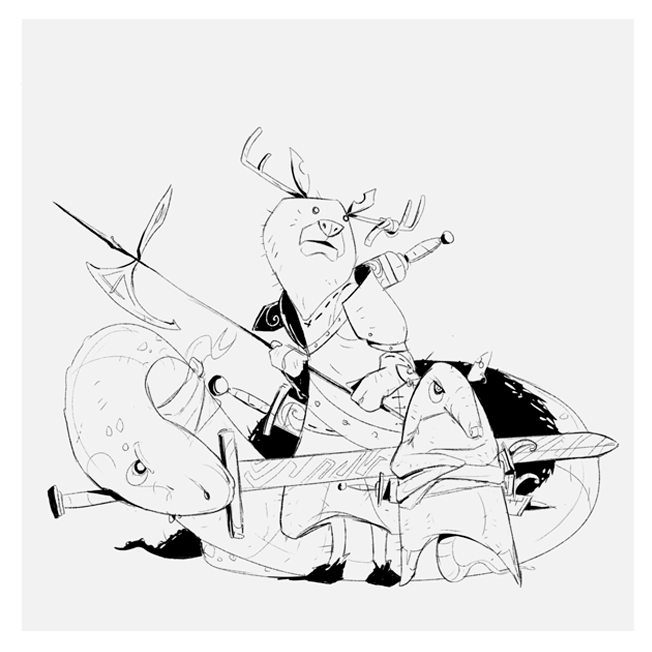 Pieza finalde las cosas mas interesantes del curso fue la simplificación de las formas y el buscar en ellas a personajes desconocidos. La añadidura de detalles después de elegir los conceptos de la lista magnifica de Patricio.Me cuesta ser tan sintético como lo es patricio, con solo unos trazos ya cuenta mucho. Me gusta añadir muchos detalles. Con ayuda de los consejos, recursos y referentes dados por patricio creo que fue la etapa que le dio el estilo.Tenia muchas zonas por separado así que añadir más grises de los aconsejas inicialmente . Intenté limitar la paleta de los colores lo mas que pude y fui añadiendo detalles con los que ya tenia en cada personaje. Y esta es la propuesta final, después de haber añadido algunas sombras y reflejos.