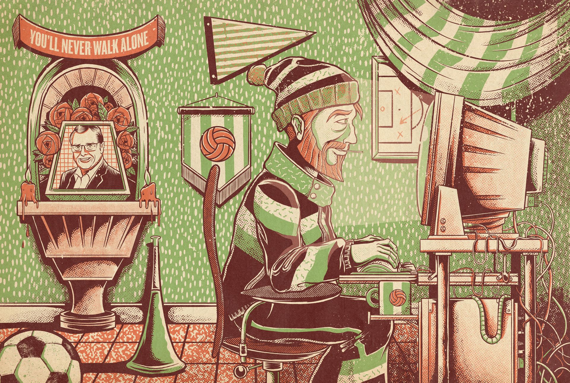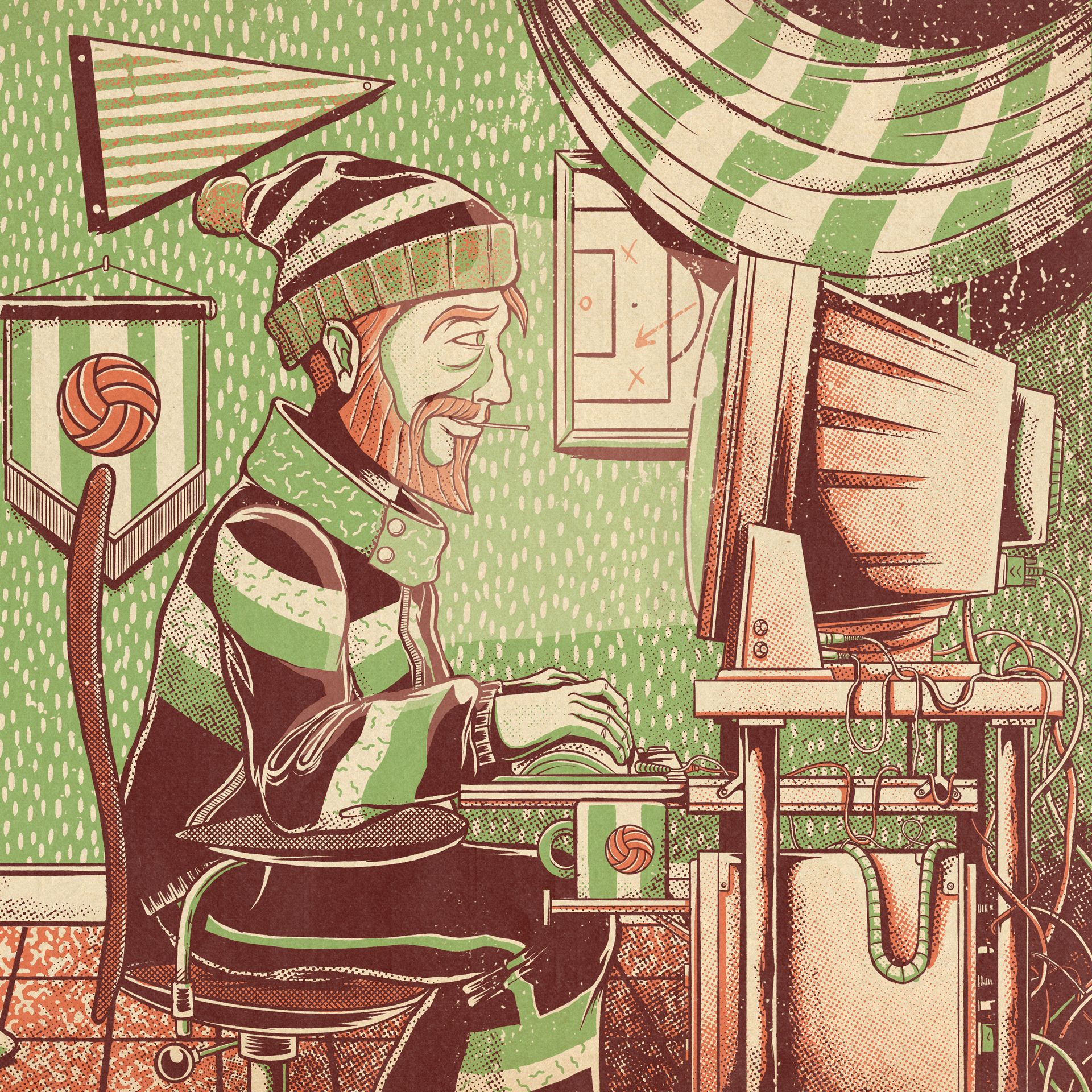 Ilustración para la Revista GQ en un artículo donde se habla en profundidad el mítico juego de los 90, PC Fútbol, y de quienes siguen jugando hoy día.