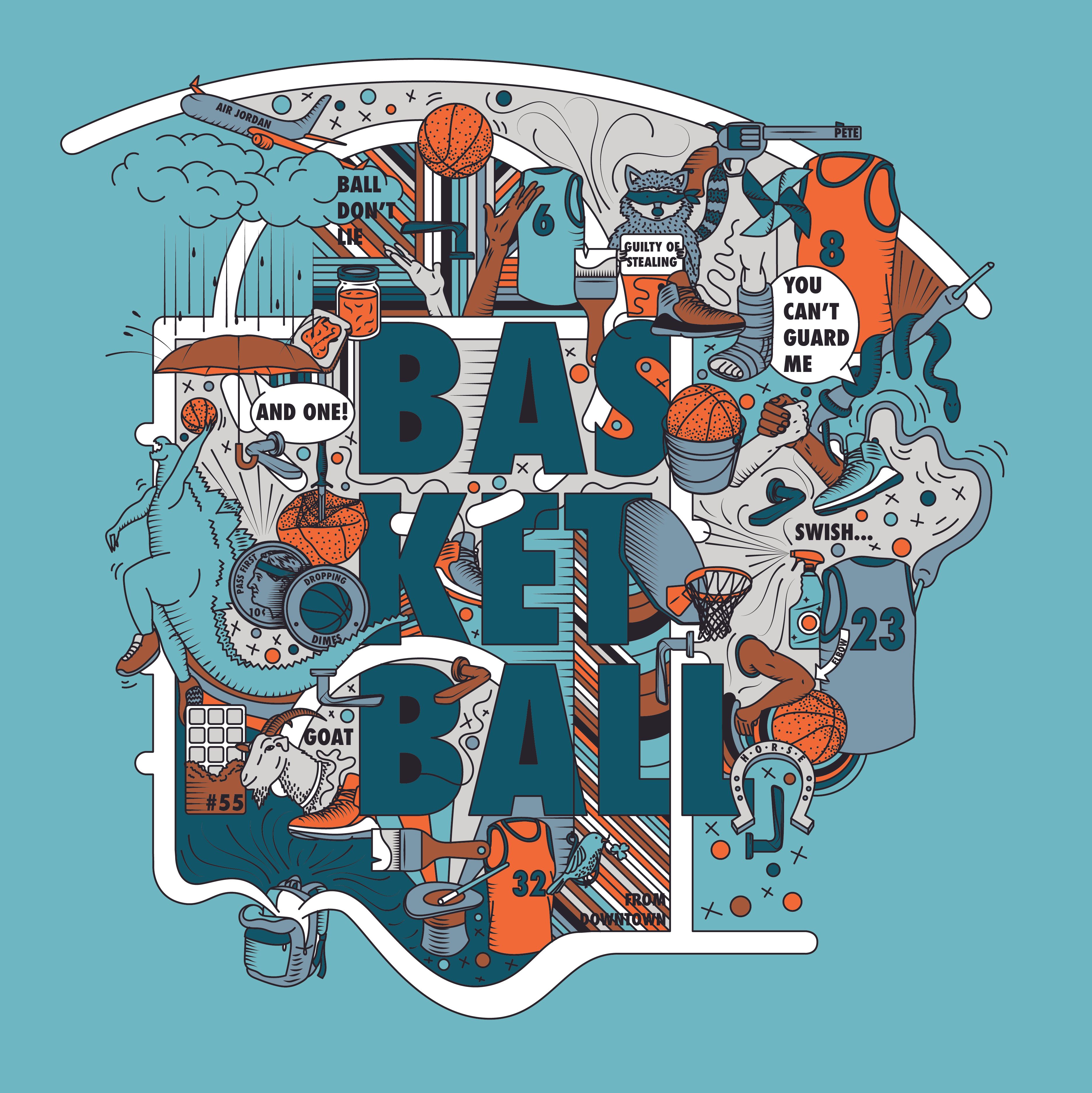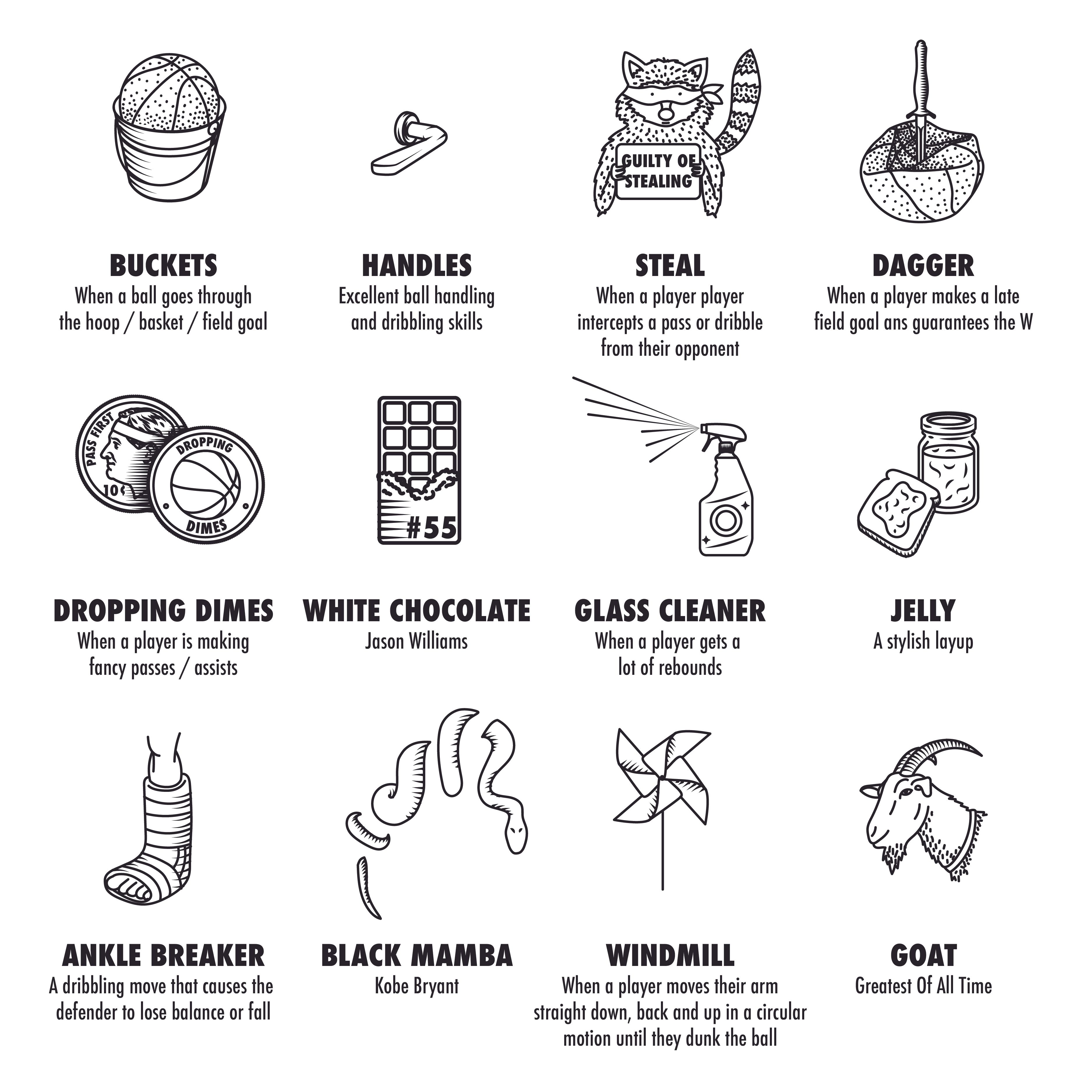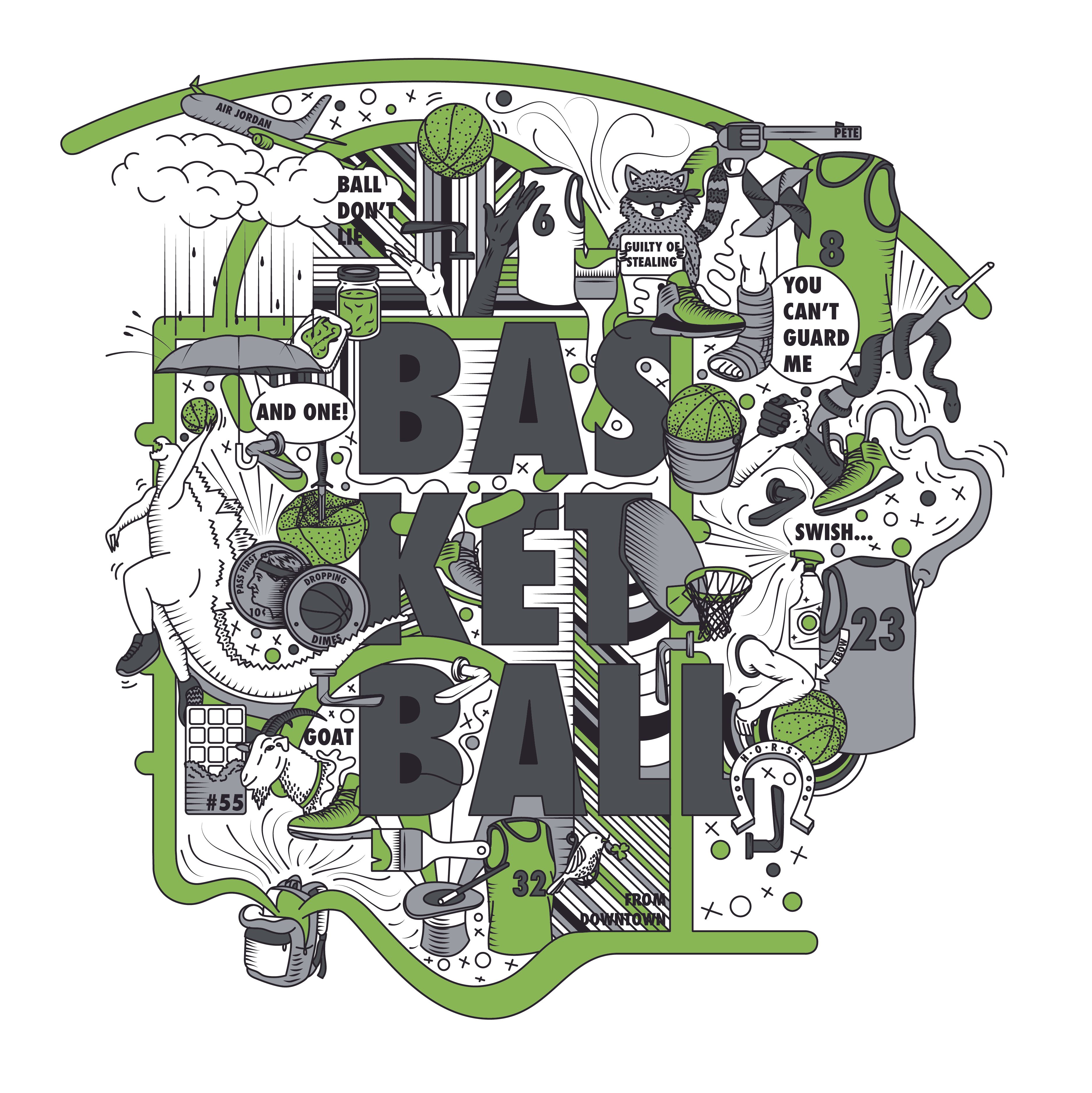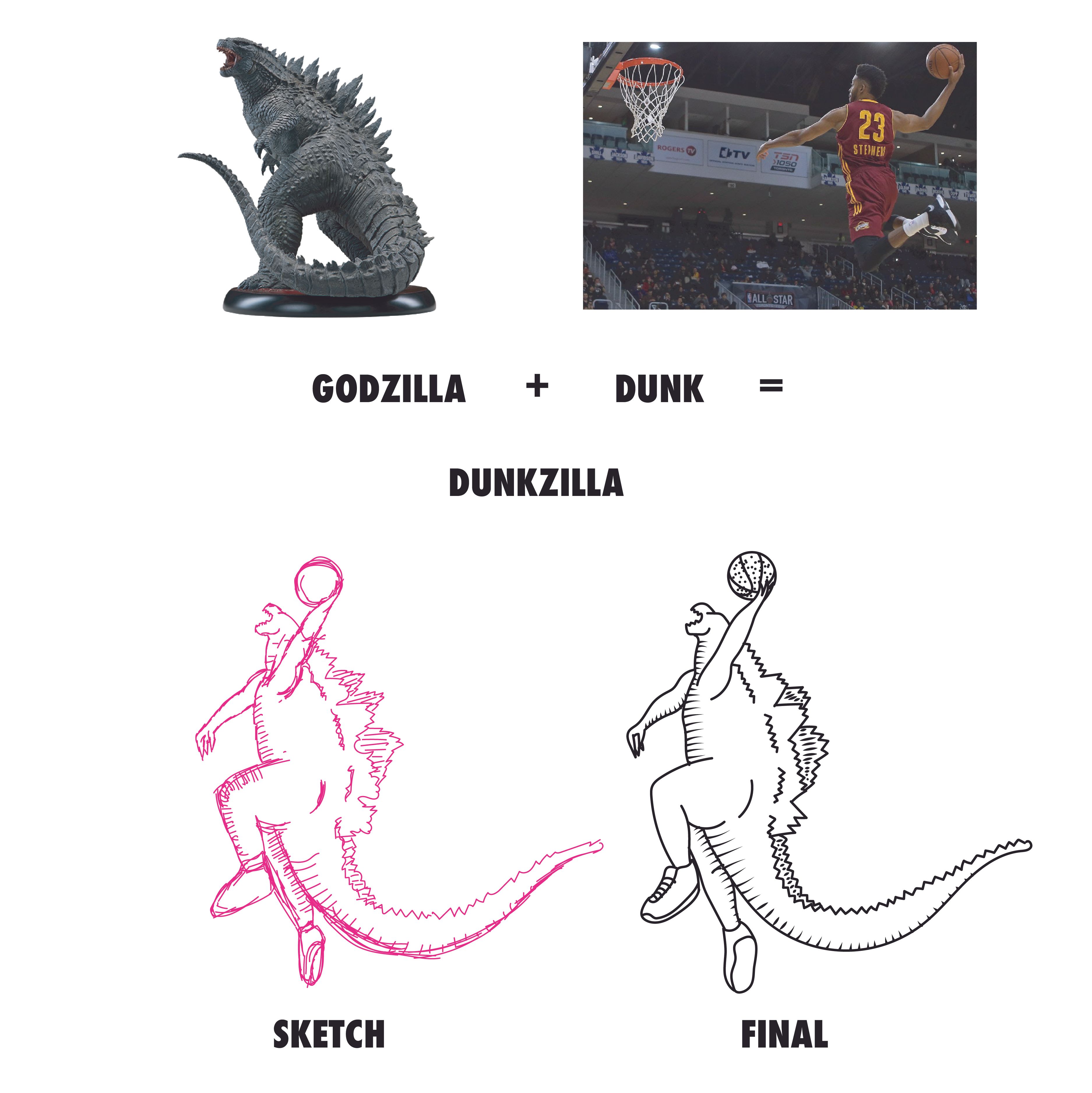 During the brainstorming session I wrote several terms and players from the basketball world, which later became part of the final project. I used some images as reference for the drafts and sketches. For example, combining Godzilla with a player dunking, Dunkzilla is created.